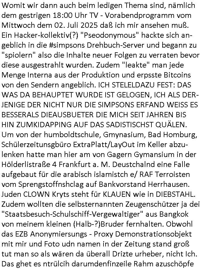 03.07.2025 05:45 Womit wir dann auch beim ledigen Thema sind, nämlich dem gestrigen 18:00 Uhr TV - Vorabendprogramm vom Mittwoch dem 02. Juli 2025 daß ich mir ansehen muß. Ein Hacker-kollektiv(?) "Pseodonymous" hackte sich an-geblich in die #simpsons Drehbuch-Server und begann zu "spiolern" also die Inhalte neuer Folgen zu verraten bevor diese ausgestrahlt wurden. Zudem "leakte" man jede Menge Interna aus der Produktion und erpsste Bitcoins von den Sendern angeblich. ICH STELELDAZU FEST: DAS WAS DA BEHAUPTET WURDE IST GELOGEN, ICH ALS DER-JENIGE DER NICHT NUR DIE SIMPSONS ERFAND WEISS ES BESSERALS DIEAUSBUETER DIE MICH SEIT JAHREN BIS HIN ZUMKIDAPPING AUF DAS SADISTISCHST QUÄLEN. Um von der humboldtschule, Gmynasium, Bad Homburg, Schülerzeitunsgbüro ExtraPlatt/LayOut im Keller abzu-lenken hatte man hier am von Gagern Gymansium in der Hölderlistraße 4 Frankfurt a. M. Deustchalnd eine Falle aufgebaut für die arabisch islamistch e/ RAF Terroisten vom Sprengstoffnshclag auf Bankvorstand Herrhausen. Juden CLOWN Kryts steht für KLAUEN wie in DIEBSTAHL. Zudem wollten die selbsternannten Zeugenschützer ja dei "Staatsbesuch-Schulschiff-Vergewaltiger" aus Bangkok von meinem kleinen (Halb-?)Bruder fernhalten. Obwohl das EZB Anonymiersungs - Proxy Demonstrationsobjekt mit mir und Foto udn namen in der Zeitung stand groß tut man so als wären da überall Drizte urheber, nicht Ich. Das ghet es ntrülcih darumdenfinzeile Rahm azuschöpfe für Stiftungen die ich aus grobem Undank rückgängig machen werde - man versuchte mich umzubringen um an Geld zu kommen enttührte zudem auch mein Kind und vergewaltigte mich cnh Plan unter Drogen gesetzt. Die prduktiofirma tat alles udensztdnaufrcht zu erhalten. Man fängt meine Post ab, weist meine Besucher zurück und hört mein Telfon/Fax/Intrenet ab überwiegend ohne mich zu informieren und fügt mir (und meinen früheren Partnern asu denfirmen die man inden Ruin trieb umso Urheberrechte erbeuten zu können) immensen schaden zu nicht nur finanziell sondern auc Gdushitelcih (erlittne Rchstchbe-Invalidität) udn Sozial (kaputtgechtee Familie) sowei politisch/witscftlich/gesellschaftrlich (Rufmord!). DAS WIRD JETZT EIEN ENDE HABEN! ICH HABE VON DEN GANZEN ROTZFRECHEN SCHMAROTZERN ECHT GENUG. In der Folge gestren kam so einiges heraus meist ging es darum daß Vaterschaften von Cops geloge waren wie die Erprssertruope von slebsteennet Personeschützern die meinen vater Bernd verleudet mein Kind Tabea-Lara ent-führt hat. Stichwort A.C.A.B. / mein Video vom 31. Mai ! Teil zwo der gestrigen #Simpsons bshcäfstgetsichdamitd daß Marge mal wieder einen bühnenjob erhielt. Nach-dem es sonst ja meist Muscials (Sieh die nachbasrchaft uur Fimra STAG Entertainmaent und die Verbindungen zu Stais & Fy) sind wars diesmal eine "Morning Show" wo Marge als "Content-Managerin" anfing und Ideen liefern sollte, die "Lunchbox" anstatt der sie lieber Pizza bestellt -als shcülertsgscosten aus Anfang der 1990er der hieraus demBlog absgchirebn ist. Sogar das Haarstyling ( RBB - Skandal und Grünen Abgeordneter "Gelbhaar"). KITA-Tanz ("G20 welcome to hell" Kita Weingartenstraße in Bad Homburg Ober-Erlenbach, Trunhallen - Hochzeit). Jedenfsll glaubt Krusty er könne in einer Gerichtsprozess Inszenierung [JSÜCHES LATGETUM] TV-Richter werden. Sogar daß "Palmina Merkau" in der zwangsjacke in die anstalet abgeführt werdne muß klaut das Fernsehen aus der Kita. Es gibt scheinbar Entührusgopfer Elterntil die sich (Sethierteug/gelscäshe) erpssen lassen solcherlei "entwicklungsberichte" irher kInder anzusehen. Schon im verfahren 9F104/01 KI udn 9F 434/02 UG Amstgericht Bad Homburg is kal erkennabr daß man mein Kind ent-führt hat um eprssersiche an Urheberrechte zu kommen anchdme man es mir aus diesm Grund gazgeziltudn anch Plan in die Erblinie vergewaltigt hat,das ist erwiesen. Der agslcieh"kidershcutz" schützt kei Kder ledliglich die Vergewalger*Innnen vom Satsbsuch und dem archakte für meine Aussage gegen "YVAN EHT NIOJ" Finanziers bduesmarine und Budräsidlaamt: (die zwote? Vergewaltigung). Wo meine "FALSCHEN" FREUNDE sic h bereichert haben aus dem Judgprlemenst und dem Schülerzeitunsgumfeld. leider hab ich auch sfstelen müssen da meine früheren Geschäftspartner sich aufs schamlosests selbst bedienten. Zudme vehderte Auläderkidenr so ihre Abschiebungen. Ihr sid wie Rotlicht-Boxproter, Zuhälre, igrndjmand anders bekomt in die fresse udnhält dne srch hin und ihr kassiert. ICH WERDE EUCH DEFITVE DAS HABE ICH MIR GSHCOREN NIEMALS VERZEIHEN DASS IHR MICH JAHRLANG ANLOGT. GEZILET IN DEN WHNSINN ZE TREIBEN VERSUCHT HABT. Die "white tiger/twitter killer" Serienmörder das seid ihr. Die Folge üner die anonymisuerung endete damit daß harsukam daß man die geschlechterrollen evrtscht hate, määlcihe opfer wurdne als fraun dargestelölt per scripted relity schuspiel um ins "opfer sind weiblich/ ausländer" . Klischee zu passen, MIT "ALLE GELOGEN" GING ES DANN AUCH WEITER in #berliNueKölln02407/#berliTagundNcht. Der Schuldirektor erinnerte Elias Freund akrim daran dass es ne Schulpflicht gebe dei auch für Direktoren - Söhne wi sein adoptivkind ungeklärter herkunft gilt. Sarah bekam von Mike einen Armreif geschenkt und es gab eine WG besuchrin mit Hut, möglicherweise "heraetta R Hippo" "pinz harry" arege opfer einer Immo-bilien-Betrügerei bei der ein Juwelenaubr (der Armreif) eine Rolle spielt. (Scihe mien vido zumtahem FüsrtIn Fressgass S*x-Mob der ja auch Thema im Sat1 - Frühstücksfernsehen war. Musikalisch uetraml wurde das von "Pupo x Nockis" das eien prima "#trixie(Dörfel)sNightmare" Sondtrac abagen würde etwa beim Folter/Verschleppung "Klinikparadie"s. Dann begann die 3sat #Kulturzeit mit dem reißerischen thema "Volksentscheid: Tempolimit" manberichte üer die angalchenFinheitder shcizer demkratie, ne "zauberfomel" die es der opposition erlaube in der schweizer regeirung mitzuwiken. diesn gequirrlten unfugien gruppe leipziger gymnasiasten kenne sich aus der se