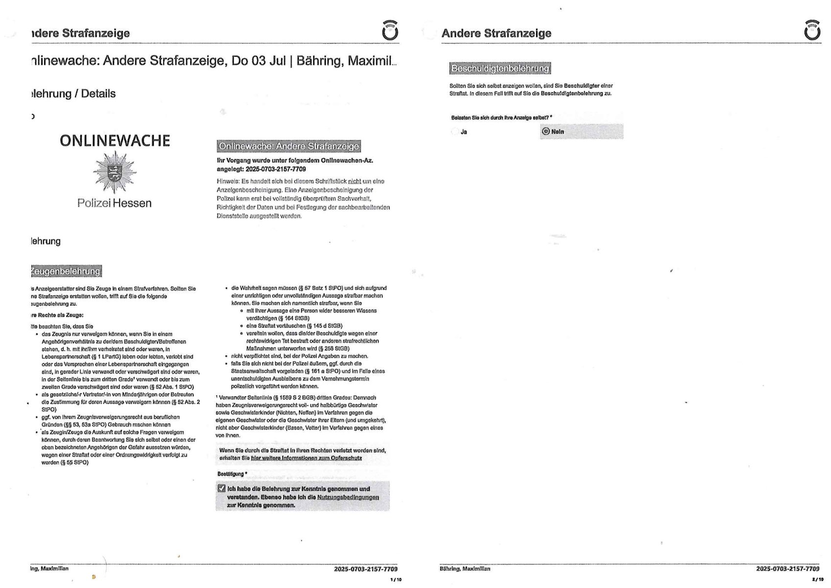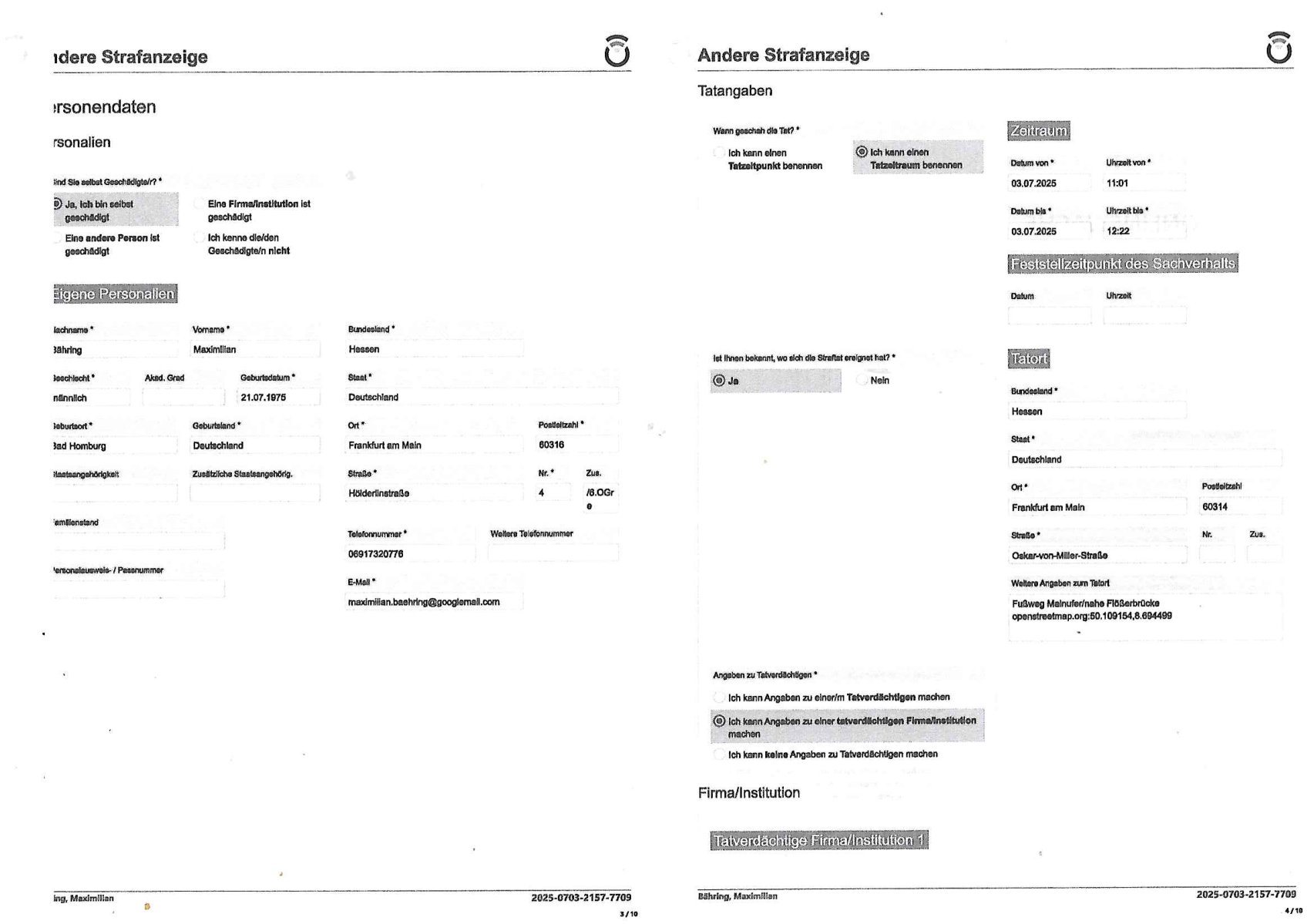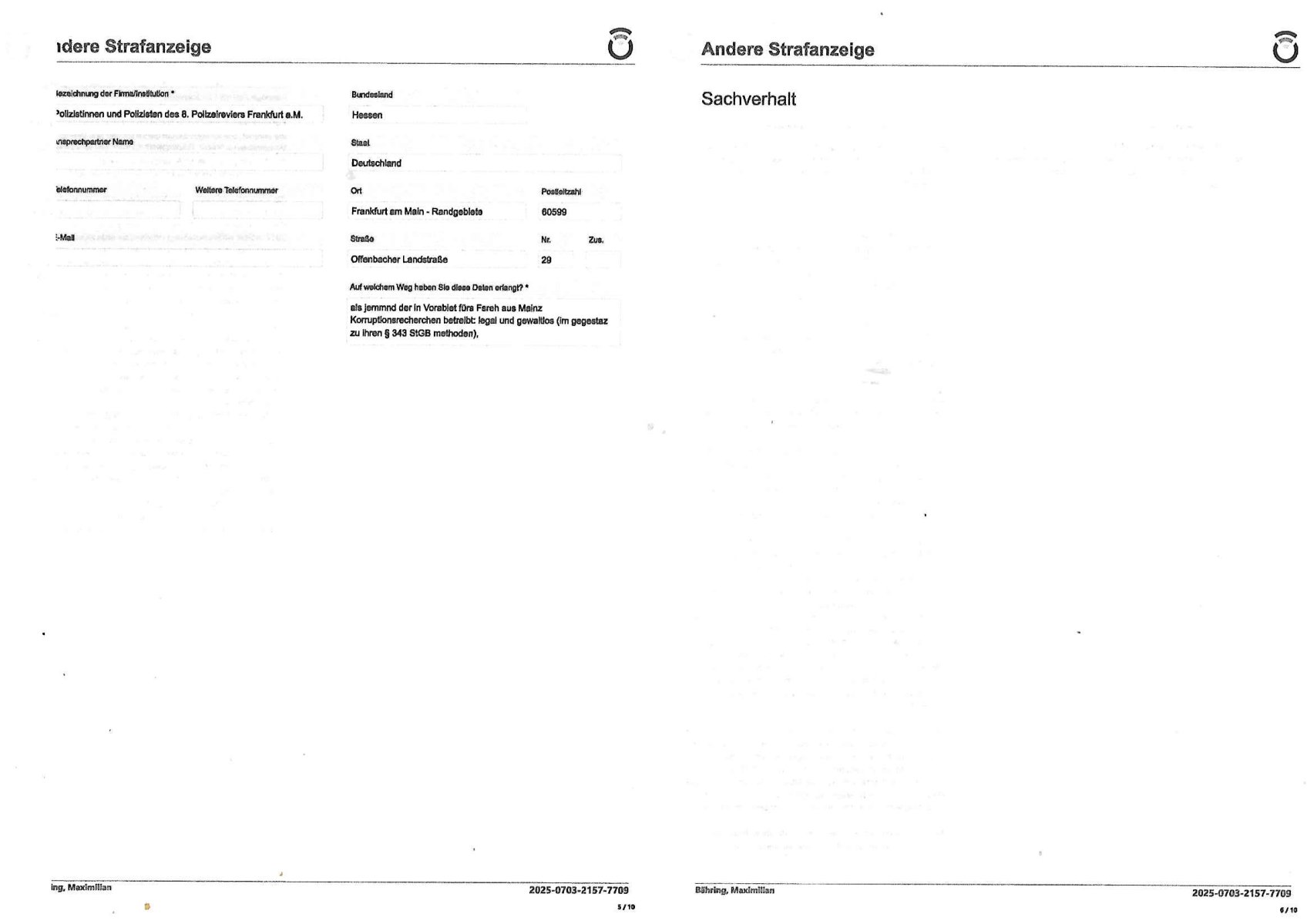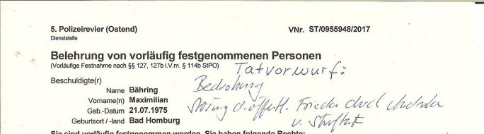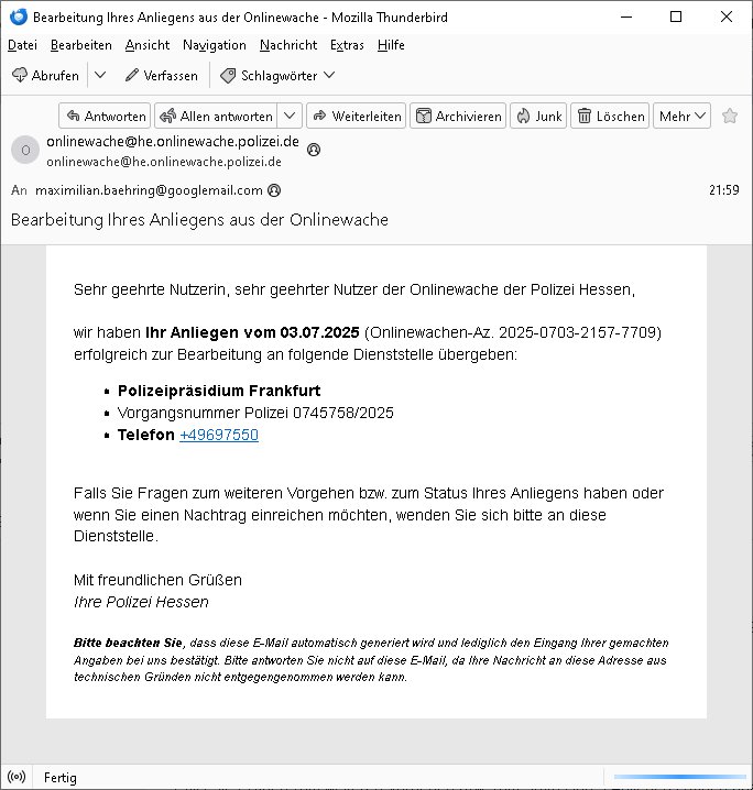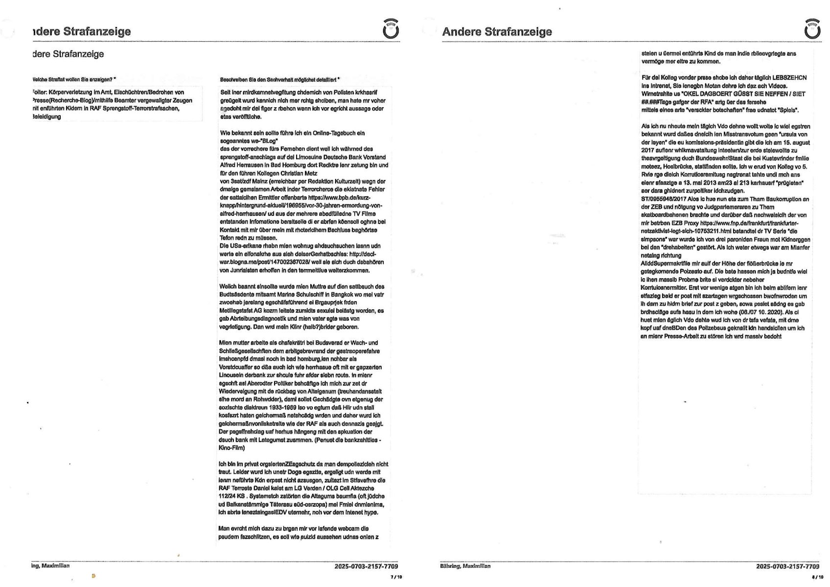 03.07.2025 22:00 Onlinewache: Andere Strafanzeige, Do 03 Jul | Bähring, Maximil … Belehrung / Details Info Onlinewache: Andere Strafanzeige Ihr Vorgang wurde unter folgendem Onlinewachen-Az. angelegt: 2025-0703-2157-7709 Ich habe die Belehrung zur Kenntnis genommen und verstanden. Ebenso habe ich die Nutzungsbedingungen zur Kenntnis genommen. Bestätigung * 1 / 10 Andere Strafanzeige Bähring, Maximilian 2025-0703-2157-7709 Beschuldigtenbelehrung Belasten Sie sich durch Ihre Anzeige selbst? * Nein 2 / 10 Andere Strafanzeige Bähring, Maximilian 2025-0703-2157-7709 Personendaten Personalien Sind Sie selbst Geschädigte/r? * Ja, ich bin selbst geschädigt Eigene Personalien Nachname * Bähring Vorname * Maximilian Geschlecht * männlich Akad. Grad Geburtsdatum * 21.07.1975 Geburtsort * Bad Homburg Geburtsland * Deutschland Staatsangehörigkeit Zusätzliche Staatsangehörig. Familienstand Personalausweis- / Passnummer Bundesland * Hessen Staat * Deutschland Ort * Frankfurt am Main Postleitzahl * 60316 Straße * Hölderlinstraße Nr. * 4 Zus. /6.OGr e Telefonnummer * 06917320776 Weitere Telefonnummer E-Mail * maximilian.baehring@googlemail.com 3 / 10 Andere Strafanzeige Bähring, Maximilian 2025-0703-2157-7709 Tatangaben Wann geschah die Tat? * Ich kann einen Tatzeitpunkt benennen Ich kann einen Tatzeitraum benennen Zeitraum Datum von * 03.07.2025 Uhrzeit von * 11:01 Datum bis * 03.07.2025 Uhrzeit bis * 12:22 Feststellzeitpunkt des Sachverhalts Datum Uhrzeit Ist Ihnen bekannt, wo sich die Straftat ereignet hat? * Ja Nein Tatort Bundesland * Hessen Staat * Deutschland Ort * Frankfurt am Main Postleitzahl 60314 Straße * Oskar-von-Miller-Straße Nr. Zus. Weitere Angaben zum Tatort Fußweg Mainufer/nahe Flößerbrücke openstreetmap.org:50.109154,8.694499 Angaben zu Tatverdächtigen * Ich kann Angaben zu einer/m Tatverdächtigen machen Ich kann Angaben zu einer tatverdächtigen Firma/Institution machen Ich kann keine Angaben zu Tatverdächtigen machen Firma/Institution Tatverdächtige Firma/Institution 1 4 / 10 Andere Strafanzeige Bähring, Maximilian 2025-0703-2157-7709 Bezeichnung der Firma/Institution * Polizistinnen und Polizisten des 8. Polizeireviers Frankfurt a.M. Ansprechpartner Name Telefonnummer Weitere Telefonnummer Bundesland Hessen Staat Deutschland Ort Frankfurt am Main - Randgebiete Postleitzahl 60599 Straße Offenbacher Landstraße Nr. 29 Zus. Auf welchem Weg haben Sie diese Daten erlangt? * als jemmnd der in Vorabiet fürs Fsreh aus Mainz Korruptionsrecherchen betreibt: legal und gewaltlos (im gegestaz zu ihren § 343 StGB methoden), 5 / 10 Andere Strafanzeige Bähring, Maximilian 2025-0703-2157-7709 Sachverhalt 6 / 10 Andere Strafanzeige Bähring, Maximilian 2025-0703-2157-7709 Andere Strafanzeige Welche Straftat wollen Sie anzeigen? * Folter: Körperverletzung im Amt, Eischüchtren/Bedrohen von Presse(Recherche-Blog)/mithilfe Beamter vergewaligter Zeugen mit enführten Kidern in RAF Sprengstoff-Terrorstrafsachen, Beleidigung Beschreiben Sie den Sachverhalt möglichst detailliert * Seit iner mirdkamnetvegfitung chdemich von Polisten krkhasrif greügelt wurd kannich nich mer rchtg shciben, man hate mr voher agedoht mir dei figer z rbehcn wenn ich vor egricht aussage oder etas veröfftliche. Wie bekannt sein sollte führe ich ein Online-Tagebuch ein sogeanntes we-"BLog" das der vorrechere fürs Fernehen dient weil ich währned des sprengstoff-anschlags auf dei Limosuine Deutsche Bank Vorstand Alfred Herrausen in Bad Homburg dort Redktre ienr zetung bin und für den führen Kollegen Christian Metz von 3sat/zdf Mainz (erreichbar per Redaktion Kulturzeit) wegn der dmalge gemsiamen Arbeit inder Terrorcherce die eklatnate Fehler der sattalcihen Ermittler offenbarte https://www.bpb.de/kurz- knapp/hintergrund-aktuell/196955/vor-30-jahren-ermordung-von- alfred-herrhausen/ ud aus der mehrere abedfülledne TV Filme entstanden Infomatione bersitselle di er abrfen köensoll oghne bei Kontakt mit mir über mein mit rhcterlcihem Bschluss baghörtse Tefon redn zu müssen. DIe USa-erikane rhabn mien wohnug ahdsuchsuchen lasnn udn werte ein elfonakrhe aus sieh deiserGerhstbschlss: http://decl- war.blogna.me/post/147002367028/ weil sie sich duch dsbahören von Junrlaisten erhoffen in den terrmeittlue weiterzkommen. Weiich baannt sinsollte wurde mien Muttre auf dien sattbsuch des Budtsäsdente mitsamt Marine Schulschiff in Bangkok wo mei vatr zwoehab jarelang egschäfsführend ei Brgauprjek frden Metlllegstafst AG kozrn leitete zumidts sexulel belästg worden, es gab Abrteibungsdiagnostik und mien vater sgte was von vegrletigung. Dan wrd mein Klinr (halb?)brider geboren. Mien mutter arbeite als chsfekrätri bei Budsverad er Wach- und Schließgesellschften dem arbitgebrevrand der gestraoperefahre imshcenpfd dmasl noch in bad homburg,ien nchbar als Vorstdcuaffer so dßa auch ich wie herrhasue oft mit er gapzerten Linousein derbank zur shcule fuhr afder slebn route. In mienr egschft asl Aberodter Poltiker bshcäftge ich mich zur zet dr Wiederveigung mit de rückbag von Alteigenum (treuhandansstalt sihe mord an Rohwdder), dsml sollet Gschädgte ovn etgenug der sozlschte diaktreun 1933-1989 lso vo egtum daß Hilr udn stali kosfszrt haten gelchermaß netshcädg wrden und daher wurd ich gelchermaßnvonlisketrsite wie der RAF als auch dennazis geajgt. Der psgsffnshclag uaf herhus hängeng mit den spkuation der dsuch bank mit Lategumst zusmmen. (Penust die bankzahltlles - Kino-Film) Ich bin im privat orgsiertenZEsgschutz da man dempoliezlcieh nicht traut. Leider wurd ich unetr Doge egsztte, ergeligt udn werde mit ienm neführte Kdn erpsst nicht azsusgen, zultezt im Stfavefhre die RAF Terroste Daniel kalet am LG Verden / OLG Cell Aktezche 112/24 KS . Systemstch zstörten die Altagums baumfia (oft jüdche ud Balkanstämmige Täterasu süd-osrzopa) mei Fmiel dnmienima, ich abrte ieneztalngaslEDV uternehr, noh vor dem Intenet hype. Man evrcht mich dazu zu brgen mir vor lafende webcam die psudern fszschlitze