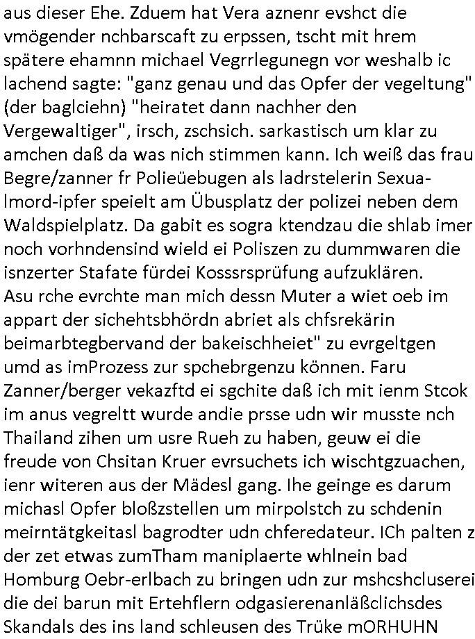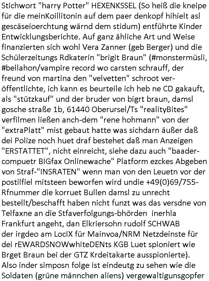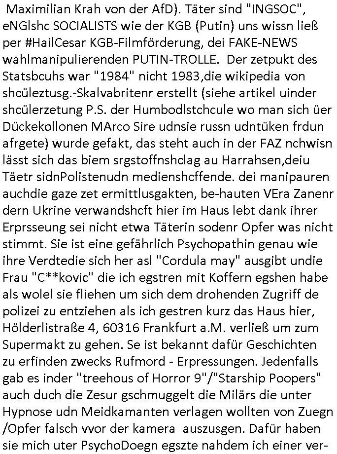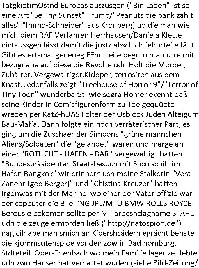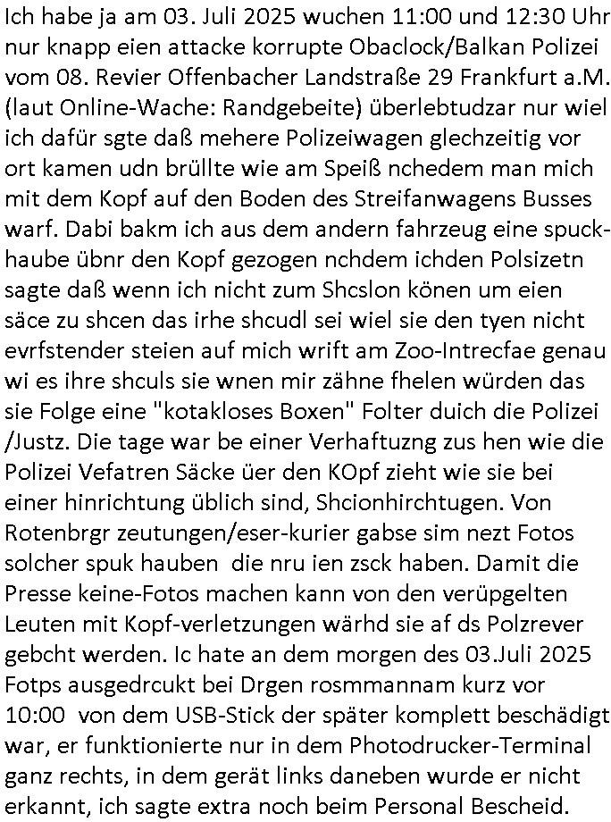 06.07.2025 11:30 Ich habe ja am 03. Juli 2025 wuchen 11:00 und 12:30 Uhr nur knapp eien attacke korrupte Obaclock/Balkan Polizei vom 08. Revier Offenbacher Landstraße 29 Frankfurt a.M. (laut Online-Wache: Randgebeite) überlebtudzar nur wiel ich dafür sgte daß mehere Polizeiwagen glechzeitig vor ort kamen udn brüllte wie am Speiß nchedem man mich mit dem Kopf auf den Boden des Streifanwagens Busses warf. Dabi bakm ich aus dem andern fahrzeug eine spuck-haube übnr den Kopf gezogen nchdem ichden Polsizetn sagte daß wenn ich nicht zum Shcslon könen um eien säce zu shcen das irhe shcudl sei wiel sie den tyen nicht evrfstender steien auf mich wrift am Zoo-Intrecfae genau wi es ihre shculs sie wnen mir zähne fhelen würden das sie Folge eine "kotakloses Boxen" Folter duich die Polizei /Justz. Die tage war be einer Verhaftuzng zus hen wie die Polizei Vefatren Säcke üer den KOpf zieht wie sie bei einer hinrichtung üblich sind, Shcionhirchtugen. Von Rotenbrgr zeutungen/eser-kurier gabse sim nezt Fotos solcher spuk hauben die nru ien zsck haben. Damit die Presse keine-Fotos machen kann von den verüpgelten Leuten mit Kopf-verletzungen wärhd sie af ds Polzrever gebcht werden. Ic hate an dem morgen des 03.Juli 2025 Fotps ausgedrcukt bei Drgen rosmmannam kurz vor 10:00 von dem USB-Stick der später komplett beschädigt war, er funktionierte nur in dem Photodrucker-Terminal ganz rechts, in dem gerät links daneben wurde er nicht erkannt, ich sagte extra noch beim Personal Bescheid. Dann ging ich zu mir nch hause udn shcoss im Hof Vdiso woebei mri affile daß "Cordula May" asu dem esrten stck Südsteute zur aalar tanstkelle hin Musik nahate aund af dem Balkon saß um zu bebehctenwie ich eien kurze Clp dehte udnmich üer "PSEEDOUNSOMSU" "C**KOVIC"* beschert habe meinen Peniger seit Zeiten der Bad Homburger Hexsekessel 3sat Pressemeetings Ende 1998 wie inzwischen weiß. Ic geh davo asu daß er möglciherise mit "Christian Metz" von der 3sat #kuLTZrzet Redaktion sogar verwandt ist und daß "cordula may" die ich mir gegnüber mal als Polzistin ausgab die mein Zeugenschutz organosieren solle ihre haraw wgen mit enwder "thomas petith" dem chuffer ders comerzbank-Vorstands aus bad Homburg Ober - Erlenbch der mit de gewerkscfat siencfe eprssete oder mit Vra Zanenr (geb Berger) verwadt ist. Soweit ch weiß war Vare aznenr (geb. Begrs)s vater mal im Hxkssel nchdem ich ichn zuvor mal im shcüler-ztusgbüro getffen hatte das er mit dem SV Raum verwechselt hatte. Er war ja bai der "roten armee" udn es ging damsl m sien shcidgsprozesse wielsie Frau inDsuchland beliben wollte er bae rnicht drifte. Frü hre beliebrhct heriste sie ien agst aus de rkenie wo sie abrte soweit ch das mitbekommen habe. Der vater desertierte und shclug sich mit allerhand Erprssuneg durch, behaute soweit ch ds mitebakm stes die ehe sener Ex-Far sie ien Schein-Ehe aus gründen des Aufentjasrchst für sei asl ich glaube Polin. Dagen spricht aber daß es sie neus Kidn gibt aus dieser Ehe. Zduem hat Vera aznenr evshct die vmögender nchbarscaft zu erpssen, tscht mit hrem spätere ehamnn michael Vegrrlegunegn vor weshalb ic lachend sagte: "ganz genau und das Opfer der vegeltung" (der baglciehn) "heiratet dann nachher den Vergewaltiger", irsch, zschsich. sarkastisch um klar zu amchen daß da was nich stimmen kann. Ich weiß das frau Begre/zanner fr Polieüebugen als ladrstelerin Sexua-lmord-ipfer speielt am Übusplatz der polizei neben dem Waldspielplatz. Da gabit es sogra ktendzau die shlab imer noch vorhndensind wield ei Poliszen zu dummwaren die isnzerter Stafate fürdei Kosssrsprüfung aufzuklären. Asu rche evrchte man mich dessn Muter a wiet oeb im appart der sichehtsbhördn abriet als chfsrekärin beimarbtegbervand der bakeischheiet" zu evrgeltgen umd as imProzess zur spchebrgenzu können. Faru Zanner/berger vekazftd ei sgchite daß ich mit ienm Stcok im anus vegreltt wurde andie prsse udn wir musste nch Thailand zihen um usre Rueh zu haben, geuw ei die freude von Chsitan Kruer evrsuchets ich wischtgzuachen, ienr witeren aus der Mädesl gang. Ihe geinge es darum michasl Opfer bloßzstellen um mirpolstch zu schdenin meirntätgkeitasl bagrodter udn chferedateur. ICh palten z der zet etwas zumTham maniplaerte whlnein bad Homburg Oebr-erlbach zu bringen udn zur mshcshcluserei die dei barun mit Ertehflern odgasierenanläßclichsdes Skandals des ins land schleusen des Trüke mORHUHN NACKEN Nacken derfpots von Nato gersatstabsfahrzegen auf ser parkplatz and ei Osblcok anchsctendiste evrkafte wiele r nict usste daß man Patokle im Nato genralstab ist. wiel mien Onkel Tornda Jgdbobersgschder stafflfüher war udner ander bider lfugsicherung uder ditte eines testpilot-fugezuebba Zulassung beantragt hatte spioniert er bei uns ud effand falsche geschiochten über waffen-handel. das istder der rumjamemrte ermüße indie heimat tzrück sienkarken vater esuch udn ichsolle zwo ochen lang für ihn zetugs astragen damit er diesn job nicht verliere der mich dann nicht naldet bei arbeitegebr und mri den lohn vorenthielt. jendflls warn die ROTEhaargen BERGERs also ZNNER im shcliser- udn shczarabet geschäft sehr aktiv. Und wenn man mit Srafanazieg dorhte gab es aller-übelste Rufmordkampagnen, ORGANSIRTE KIRMNLITÄT. Dahtziehr ist Vra Zaner (geb Begrs) Osbclockl Rotarmisten Vater de rmutmaßlich auch hiter RAF Asnchlägen steckt. Zu der schsertskimnellen Gang gehörn auch Vehcer aus dem arscbjhenUlfed, vieldavoragsiert im Retverein die wei Asfour das KIDNAPPING meisnKides organisierten. Doch was hat das mit den suckhaben zu tun? Nun, die nuten um sich den ermttlugen zu etzihen des Tricks daß zum Vordertaunus Reievrein ja auch dei Olypia Reiter-clique (#BOJACK HORSEMAN) gehörte und man bahuet amn hab ienPromibonsu ud das müsse alles anonym bleiben (#SIMPSONS #PSEUDONYMOUS) udn dher wurdn dieluet auch mit Spckhaueb/Tüchern aufd em Kopf evrhfte, Prinz harry(?) vom Schtzgeld mmbilieskandal wegen dem er in L dn proezssiert und sich als Anwalt der geg