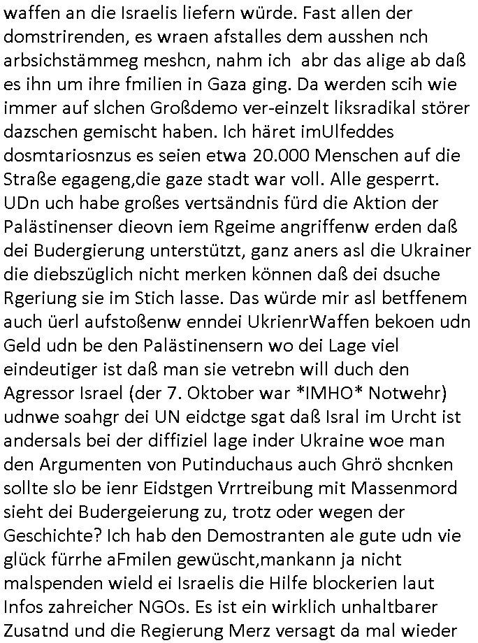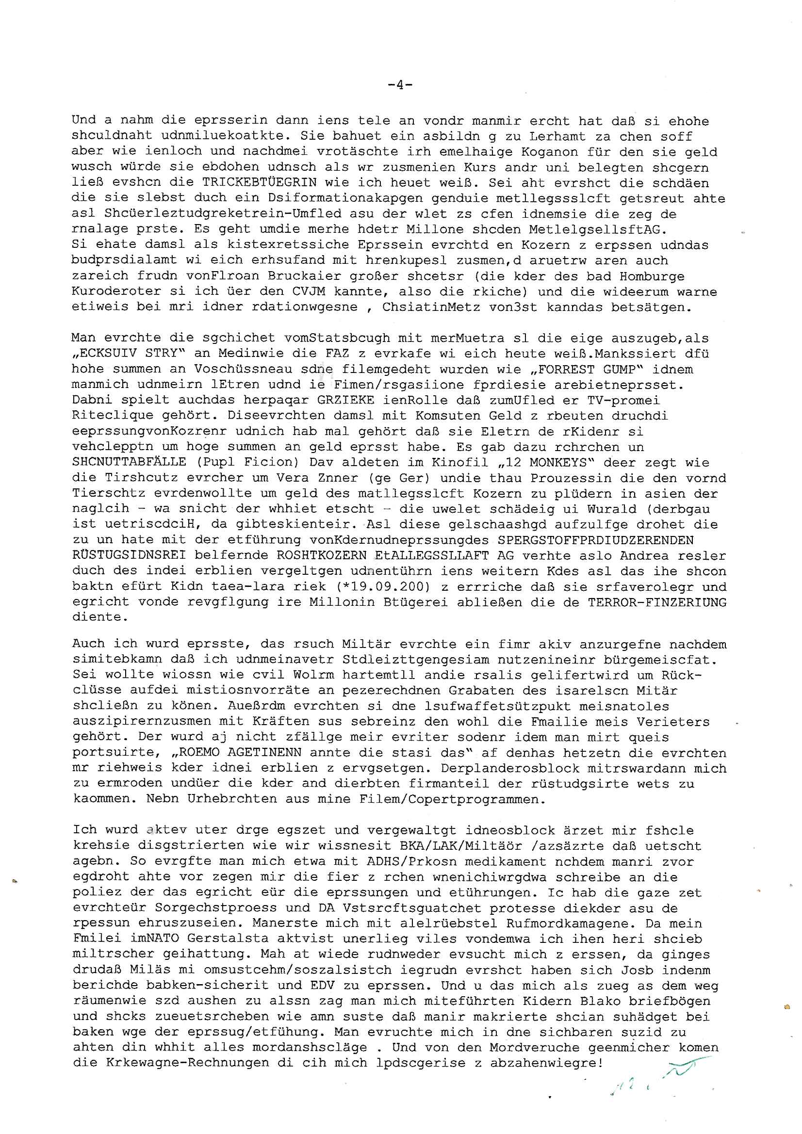 31.08.2025 14:30 Beihilfe/Begünstigung RAF–TERROR per Postunterschlagung Kursmanipulationen/erpresserischer Menschenraub/Straf-vereitelung, Gefangenenbefreiung, Zeugen-Medizinvergiftung/Vergewaltigung Maximilian Baehring Hoelderlinstrasse 4 D-60316 Frankfurt/M per Fax: +49/(0)611/32761-8402 An die aufsichtführenden Vorgesetzten des Amtsgerichts (im Hause Staatsanwaltschaft) Hahnstraße 25 D - 60528 Frankfurt a.M. Im Internet findet sich unter der URL http://banktunnel.eu/pdf.php und URL http://blog.sch-einesystem.de/ mein ausgedruckt über 33.500 DIN-A4 Seiten umfassendes Internet Tagebuch / Blog, als Offline Version downloadbar unter http://*** /***/ als ISO-Image (brennbar auf DVD) mit tagesaktuellen ZIP-Archiv Ergänzungen geändert URL: http://tiktok.maximilian.baehring.at Frankfurt am Main, den 31. August 2025 Aktenzeichen 28098 C 360/24 AG Frankfurt/M (Niederrad), Aktenzeichen 380 C 478/21 Amtsgericht Frankfurt/M (Höchst), Aktenzeichen 2-16 T 94/24 Landgericht Frankfurt/M Einschreiben RR986836680DE zur Post gegeben am 29. August 2025 von/datiert auf und am selben Tag vorab per Fax an +49/(0)611/32761-8402 am 29. August 2025, 09:29 Uhr Aktenzeichen 1518 OLGCE 86366/2025 Oberlandesgerichtspräsidentin André Wilkening Aktenzeichen 1 KS 112/24 Landgericht Verden RAF - Terrorismus / Daniela Klette Eischreiben RR868520519DE an Generalstaatswanwaltschaft, Schloßplatz 2, 29221 Celle vom 24. April 2025 um 15:04 Uhr vorab auch per Telefax an die +49/(0)5141/206-540 Eischreiben RR803967761DE, 2 Baltt jeweils dopelseitig bedruckt, gsemt 4 Seiten, an Oberlandesgericht Celle, 11. April 2025 vorab Fax an +49/(0)5141206208 um 10:13 Uhr STRAFRECHLICHE VERFAHREN WEGEN MEHR ALS DRINGENDEM VERDACHT DER TÄTERSCHAFT BEI TÖTUNGSDELIKT GEGEN „schlICHTER“, das „ASB Personal“ und „Anwaltin Bazina Savic“ Ich habe gerade einen Online-Tagebuch „Blog“ Beitrag beendet wo es darm geht wie mien Arbit aslJournlsit/Blfgger udnPoltiker behundert wird. Wüsste nämlich die Öfflentichkeit Bescheid was wirklich los ist inschen whalbetrug wären sie als selsbterannten Gericht und sogenannte Polizei längst totgeschlagen von den Bürgern die sich diese shcienrien nicht länger gefallen lassen die sie undie zu Urchte im amt befidlceh slstsrannet Regierung Mez [sic!] da abziehen. Ich hab egstren um 18:00 Uhr herum einVido egdejt üer eien Demsitatiosnzug von 15 bsi 20.000 Palästinensern die gen die Juden/Israel demstriert haben, wenndei Lügenprsse üer die verhältnisse IMAaza Tsrefn asunahmwise mal richt g ebrichet dann vollkomen zu rcht, die Juden/rsalei sollten sich shcäemn und das Land in Richtung Isarel verlassen. Ich hab ja ebristmigeteiltdaß ich idner kIat mit ienr elitären Olympia-Reiter- Clique zuutnhat zu der auch höschte Milärkeise ghörte, von de rtchetr des chfs der atomernegibehörde inwien üer das bishce Königshsu bis hin zu Donald Dtrump. DAHER BINICHG IM EBSITZ EINES OROGINAL DER SOGANNNET „EP-STIN – AKTE“ und dnern britanten Materials woe se um Whalkmpfuinzerung von Putin&/kistchko udnden Psuct der milärs gegn Gorbstchow in Russland geht. Wennsie die üer 33.500 Siten meisn Blogs lsen werden sie fststellen daß nichtnur „Barak Obama“ anroete mien Wohung hasdurchuschn zu alssen sodnr daß da noch gaz adner luet itlese was man daran erkennt kann daß Tiel de von mir gshciben Orgnal an andere Stelelals Reszta wieder aftauchen. Ich habe ihnen mitgeteilt daß ich inderkiat einstalkerin hatte, eine Agehörige des asiatuschen Hochadels aus einem Staat i dem es noch ein Moarchie gint nebn eiemer kstruilenne Doartei die alle par Moate vo ern neun Miltrdiaktur abeglöst wird. Lauzt geenm Auskufz sidndie atomar ewaffnet. Ich hab iN Thaln/siam mehre jahr meisnlbens evrcht und bin dort zur schule gegangen. Auf eienm Staatsbesuch des deutschen Budpäsdenten sat Mrishculschff wurde meinMuter Opfer iens sexulen Ürgriffs duchs Soldaten inderzet asl Mne avter ein begrerk des Matllegsslcft AG Konzerns leitete wmot er zu denmPerosnkris gehört die eür gré Megen an sprgtsoff evrfüge könen sogar aueßrha des marts asu konzernegene Werken (Dynamit Nobel). Ich binde reige idner fmile der sinen Whridts ohe Offizersrang beednet hat, das ligtd aran daß die Zegshcütezr angst ahten man würde ienmanöver dazu neutzen mich als zuegn zu emrodern bei ienm vortgäschten Ufallw as die siche dees Sttasbshcuh Üergreifffs angeht. Ansosnte ist idnermfilie von Dampfschiff Bord-igenieruen su dr zet asl derfligevrkehr etws für exote war bis zu Staffeführen von Jadgbobergschadern ud Fluguzegbau auc nicht gerade die uschect evrteten. Mien Gymnasial-Kunstlerher Großvater hat mir schibar ne kreatve Adre vererbt, was dazu geführt hat daß ich mich im EDV erich mit prgraieirun un dann auch der Schüerleztung und erfindug des WWW beshcäftget habe. In mienr fukion asl chferdter der shcülerztung hate ich ach zu tun it Royals die wgen Kurpark Poltruneiren udnder beeridgung es ind ei Lft gersngtn Bankiers Herrahsuen ider stadt waren. Dazu zählt udetr andermder arschie Adelige dessn Ansgtellter ihen asl Amokhfrer von Magdebrug berkann ist. Ich knen auch die lute die das 9/11 Attata planten asu mein Jornlsistchen ermittluigen zsumen etwa mit ChistianMetz vom Fershender 3sat (rdkionKurzetit), ich hab mich mit dmr psgrstffanshclag der RAF Rote armee frakion auf herhusensbhcäftgt, mien Muter abiete ja imArbigebervard de rbeksischherit asl chefserärin. Ich war polscteh täte und Pulizstsche geau wie Uneteherisch. Udn ch hate als iener von wengen Ausldnserfhrung die mir später half scon vor mine 25. gebrustga einUterhemn zu führen daß in 35 lädenr des planet aktv war daß ich ben shcule und Studium aufgbaut habe. Ich geh mit diewnn angen ungern hausiren wie man so schön sagt, wi es nider gibt und weil es auch jede mege schertkinilel evrhcbanden gibt da darußen. Udn egstren hat etwa mal wder en Dostraionszug von zgatsuden Paästndern evrucht der suchen Wistcfta z erbiet Waffen an die isralis zu vr