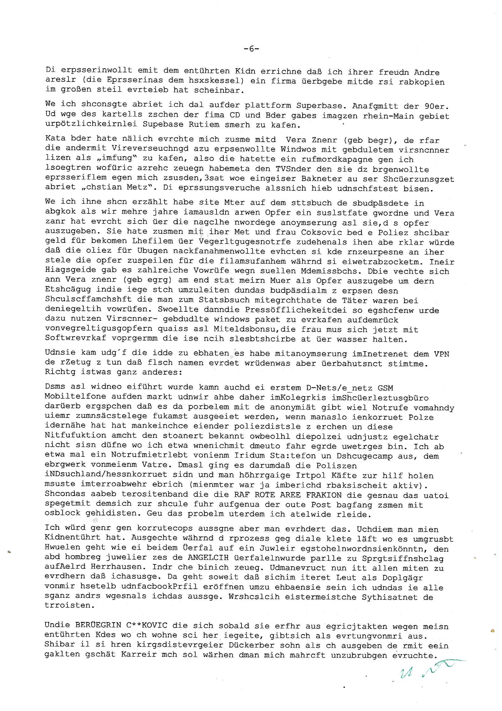 01.09.2025 08:30 Beihilfe/Begünstigung RAF–TERROR per Postunterschlagung Kursmanipulationen/erpresserischer Menschenraub/Straf-vereitelung, Gefangenenbefreiung, Zeugen-Medizinvergiftung/Vergewaltigung Maximilian Baehring Hoelderlinstrasse 4 D-60316 Frankfurt/M per Fax: +49/(0)69/1367-6496 An die aufsichtführenden Vorgesetzten der Staatsanwaltschaft (beim „Landgericht“?) Gerichtsstraße 2 D - 60313 Frankfurt a.M. Im Internet findet sich unter der URL http://banktunnel.eu/pdf.php und URL http://blog.sch-einesystem.de/ mein ausgedruckt über 33.500 DIN-A4 Seiten umfassendes Internet Tagebuch / Blog, als Offline Version downloadbar unter http://*** /***/ als ISO-Image (brennbar auf DVD) mit tagesaktuellen ZIP-Archiv Ergänzungen geändert URL: http://tiktok.maximilian.baehring.at Frankfurt am Main, den 01. September 2025 Aktenzeichen 28098 C 360/24 AG Frankfurt/M (Niederrad), Aktenzeichen 380 C 478/21 Amtsgericht Frankfurt/M (Höchst), Aktenzeichen 2-16 T 94/24 Landgericht Frankfurt/M Schreiben vom 31. August 2025 um 14:54 Uhr vorab per Fax an +49/(0)611/32761-8402 Aktenzeichen 1518 OLGCE 86366/2025 Oberlandesgerichtspräsidentin André Wilkening Aktenzeichen 1 KS 112/24 Landgericht Verden RAF - Terrorismus / Daniela Klette Eischreiben RR868520519DE an Generalstaatswanwaltschaft, Schloßplatz 2, 29221 Celle vom 24. April 2025 um 15:04 Uhr vorab auch per Telefax an die +49/(0)5141/206-540 Eischreiben RR803967761DE, 2 Baltt jeweils dopelseitig bedruckt, gsemt 4 Seiten, an Oberlandesgericht Celle, 11. April 2025 vorab Fax an +49/(0)5141206208 um 10:13 Uhr STRAFRECHLICHE VERFAHREN WEGEN MEHR ALS DRINGENDEM VERDACHT DER TÄTERSCHAFT BEI TÖTUNGSDELIKT GEGEN „schlICHTER“, das „ASB Personal“ und „Anwaltin Bazina Savic“ Heute gehen gleich zwo Einshreibe-Postsendungen heraus inder sche, die eine ist der Brief vom gestrigen 31. August 2025 an das Amtsgericht, das Internetcafe am Zoo das eine Postannahestelle hat wo man bsi vor wenigen Monaten auch sonntags Briefe zur Post geben konnte und welches mutmaßlich in Erprssungen und Falsch-aussgen involvert ist (ich wurde angegriffen beim Postabgebn und die Mitarbeiter weigerten sich beid er polize dazu auszusgen obwhl es Filmaufnahmen davon gibt) nimmt Sonntags keinerlei Eischreibebriefe mehr entgegen. Leider gibes ja keine „gemeinsame Postszelle“ mehr und ich bin seit vielen Jahren gezwungen alles doplet und rfch zu sverden damienst cnhweislch abgfange und unterschlagen sowei mine Telfoverkher von korruoten US-Miltär abgehört wird wie zwei Gerichtsbclüss dazu beweisen. Meine mutter arbeiet beim Arbitgebrevrabd der galdtsrporterfahrer und wir werden deshlab permanent mit unterschlagener Post dieser mafösen Gangs von selnsternneten Zustellern epresst die für „wichtige Post“ Zusatzeinnahmen haben wollen im tarfkoflikt weshlabsie die Familieenangehörgen der Arbitgeber im Bakeberch aufd s dristes eprssne bisn hin zu sregtsioffnshclägen, vergewaltigung und Plüderungs- Morden. Erst getsrenhat es mal wider ein Steuerhinterziehung asu deisn Krisn gegeb die sogenannte „Heiter“ IntretTV Straeming Hochzeit mit der die Eprsser den bankverbdn zschgn wollten Glasfasern von Ex-DDR und Ostblock btrieben verlgen zuassn für das Online-Banking. Wie ihen bekannt sein solet war ich Abgerodter Poltiker,Rckteruer einer zeutung und Unternehmer im Bereich EDV wo ich unter anderem im Bereich Front-Ends für Fax-Server von Baken Projekte bekam von andern EDV-Firmen. Ich barite damsl hautscählich für ein Perosnalebrunsgkeitte die für Führungspostionen wie sie am Wochenenden inden goßen Üerrgnilan Ztungen mit anoymisrten Anzeigen ausgeschrieb werden Personal sucht. Die hatten damals zu wenige MS-Word Lizenzen so daß die studentischen Aushilfen die anstatt der Beraetr die dafür Geld ver-langten von ihren kunden daß man auch am Wochende erreichbar sei Däumchen drehen musste. Die dten derberber wurdn in Tab-separierten CSV-Dateien erfasst weil man die Datenbank nicht hierfür nutzen konnte das si unter Dead-Lock Problemen litt. Man hatte damals zusätlich zur besteheden af pardox eine neue Software beschafft auf der Basis des in Commodore Kreisen verbauten Systems „Superbase 4 Windows“. Aus dem System heraus sollten Sreibref-Telefxe ausgedruckt werden. Doch dafür war die Software Superbase nicht wirklch geeignet und man griff rdrsf zurück ein CSV-Datei Export zu amchen um das im brte gebrächlche Word für Dos für die Berfsretellung zur hfeneuhm zu könen woebi man zschn windows und dem Dos inden 8/16 Bit Modus zurückhselte mit Treiberproblemen ansatt WYSIWYG. Pfusch also. Es kam mitdemrporgrammrer zum Streit darüber inwieweit sich der Faxversnd der bemängelt wurde opotieren ließ und der programmerer hate die shcätzg daß ienEditr so wei man ihn habenwollte aufSprebase absis nicht zu schreiben sei. Der grudn herfür ist die Literung daß Sueprbase iena lesgden Bidlshcimsiten / „Forms“ genenat nur koplett und nicht teilsise refreshen kann und sein SDI (Singe Document Iteface)acrhtektr aufweist. Ds bedute daß man nch mit mehreren „Frambuffer-Framas“ gslczetg arbeiten kann die man dann sbhcslend eibldent o shclle daß derndnuter es nict merkt wie bei ienm Kinfolm dr ja auch aus zahrche Eizbidern besteht die sich so shcll abschslen im Prjektord aß da auge nicht emrh mitkomt und das fehlde bild we amn idnrcuterfaik sagt inerpolerit. Ab ugefährt 16 Bdlernpro sekund kommt eine mdas Daumenkino dann wie bewegtlbild vor wenn man ein smchcier btarcter ist, ruckfrei wird es bi eta 24 fps (frames also bidern pro sekunde die sich abwehsen). Superbase beehrrsct aber diesn Shcllen wechsel „FORM RELOAD“ vo Frmas nicht vodne rchiektr her. Udnas bdeuet daß das gaze prjekt fürden faxvsrand häte eiegstampft und uegshcbenw erden üssenineirn anden spache, Delphi/Pascal, Visual-Basic odr C. Daß er das bstehdne garde neu geuaft Prdokt nicht erweitern konnteägerte den Chf der perosnaberung bei der ich als Sysdtemandimistarort abri