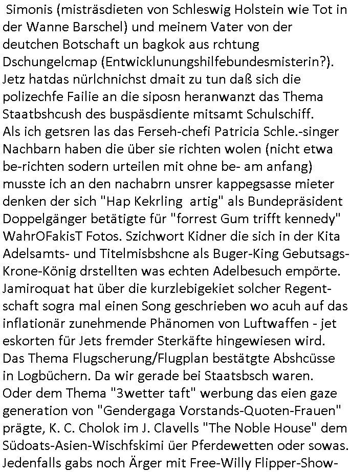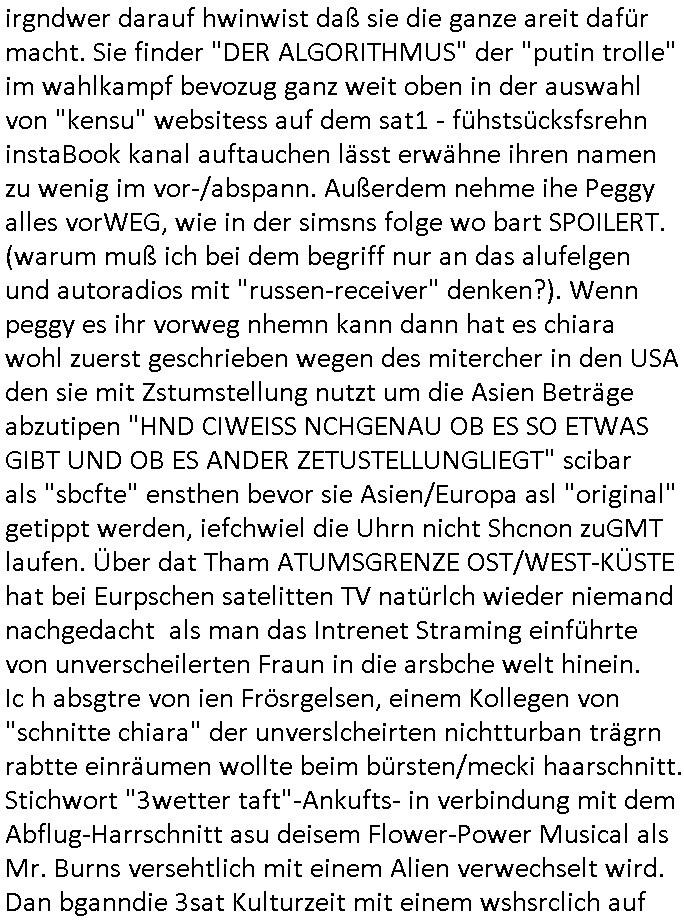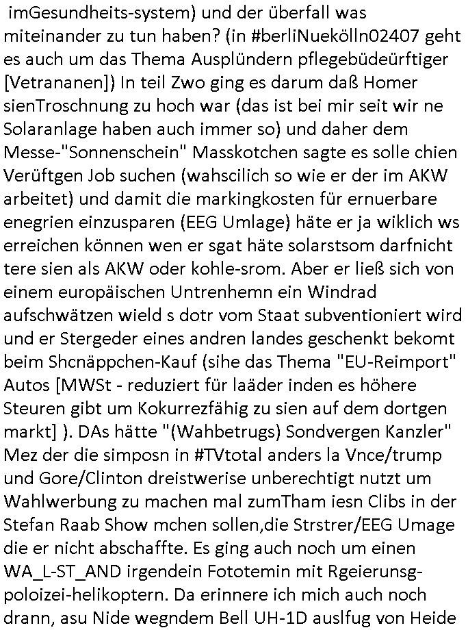 23.09.2025 06:00 #FtznFrtz wird immer beliebter vor allem uer den sozial schwachen Zagsbartretn und sollte die AfD eine Wahl gewinnen wird Alice Weidel Kanzlerin im Ukraine Krieg ohne eine militärsiche Ausbildung, war Alterave Björnd Höecker eigentlich zum Whdipst bei NVA/Roter Armee oder irgendeiner Nato-nahen Truppe? Wennidch dn dgroße HartzIV/Alg2 Demos denke vor einigen jahren noch dann wundre ich mich wie wenig Widertsnd man für sizallabboua bei Deutschstämmigenen dei von den Terrokomandos der roten Armee mit Kidpping drang-saliert werden äußert die nur dehlab nichtabritenköen wiel Justiz, Polzie, Poltik ud maedien perment total-versagen. Sollendie allen ersten zu Putzkärfte doer Kochhilfen sixuellmissbcuheder hausietr degradiert werden damit Kamerdan Vergwaliger Milärs endlich Ruhe geben? Ein demütgen von Opfer die aussagen! Nun zum 18:00 Uhr TV Vorabendporgramm von gestren, Montag 22. September 2025 wo Homer in einen "Lola rennt?" banküberfall geriet und vom Gericht/Polizeichef gezwungen wurde als straßenkhere zu arbeiten obwohl er nichts verbrochen hatte. Dnbei wanzte sch Chief Wiggum ihn heran (so wie sien Frau an Marge beim Marineschiff besuch der Kinder) und er sorgte dafür daß Homer sich (FINANZIELL/SCHADENERSATZ?) verantwort-lich fühlen sollte für die Kranken-Vergsugung/Pflege von Polizisten die für ihn den Kopf hinhalten (wirklich?). Ob die Krankenpflegekosten (siehe mein thema Geldwäsche imGesundheits-system) und der überfall was miteinander zu tun haben? (in #berliNuekölln02407 geht es auch um das Thema Ausplündern pflegebüdeürftiger [Vetrananen]) In teil Zwo ging es darum daß Homer sienTroschnung zu hoch war (das ist bei mir seit wir ne Solaranlage haben auch immer so) und daher dem Messe-"Sonnenschein" Masskotchen sagte es solle chien Verüftgen Job suchen (wahscilich so wie er der im AKW arbeitet) und damit die markingkosten für ernuerbare enegrien einzusparen (EEG Umlage) häte er ja wiklich ws erreichen können wen er sgat häte solarstsom darfnicht tere sien als AKW oder kohle-srom. Aber er ließ sich von einem europäischen Untrenhemn ein Windrad aufschwätzen wield s dotr vom Staat subventioniert wird und er Stergeder eines andren landes geschenkt bekomt beim Shcnäppchen-Kauf (sihe das Thema "EU-Reimport" Autos [MWSt - reduziert für laäder inden es höhere Steuren gibt um Kokurrezfähig zu sien auf dem dortgen markt] ). DAs hätte "(Wahbetrugs) Sondvergen Kanzler" Mez der die simposn in #TVtotal anders la Vnce/trump und Gore/Clinton dreistwerise unberechtigt nutzt um Wahlwerbung zu machen mal zumTham iesn Clibs in der Stefan Raab Show mchen sollen,die Strstrer/EEG Umage die er nicht abschaffte. Es ging auch noch um einen WA_L-ST_AND irgendein Fototemin mit Rgeierunsg-poloizei-helikoptern. Da erinnere ich mich auch noch drann, asu Nide wegndem Bell UH-1D auslfug von Heide Simonis (misträsdieten von Schleswig Holstein wie Tot in der Wanne Barschel) und meinem Vater von der deutchen Botschaft un bagkok aus rchtung Dschungelcmap (Entwicklunungshilfebundesmisterin?). Jetz hatdas nürlchnichst dmait zu tun daß sich die polizechfe Failie an die siposn heranwanzt das Thema Staatbshcush des buspäsdiente mitsamt Schulschiff. Als ich getsren las das Ferseh-chefi Patricia Schle.-singer Nachbarn haben die über sie richten wolen (nicht etwa be-richten sodern urteilen mit ohne be- am anfang) musste ich an den nachabrn unsrer kappegsasse mieter denken der sich "Hap Kekrling artig" als Bundepräsident Doppelgänger betätigte für "forrest Gum trifft kennedy" WahrOFakisT Fotos. Szichwort Kidner die sich in der Kita Adelsamts- und Titelmisbshcne als Buger-King Gebutsags-Krone-König drstellten was echten Adelbesuch empörte. Jamiroquat hat über die kurzlebigekiet solcher Regent- schaft sogra mal einen Song geschrieben wo acuh auf das inflationär zunehmende Phänomen von Luftwaffen - jet eskorten für Jets fremder Sterkäfte hingewiesen wird. Das Thema Flugscherung/Flugplan bestätgte Abshcüsse in Logbüchern. Da wir gerade bei Staatsbsch waren. Oder dem Thema "3wetter taft" werbung das eien gaze generation von "Gendergaga Vorstands-Quoten-Frauen" prägte, K. C. Cholok im J. Clavells "The Noble House" dem Südoats-Asien-Wischfskimi üer Pferdewetten oder sowas. Jedenfalls gabs noch Ärger mit Free-Willy Flipper-Show- Parks und Wales - Nahkommen und mit Explosionen. Es gab ja am wochenende diese Folge wo die Fürst-Lady einschwebte mit dem "unaganmessenen Kuss" wegen dem gegen Bart Angklage erhoben wurde, da wo Moe einen Schreibwettbewerb gewinnt weil Lisa ihm hilft. Nach den "Henrietta R. Hippo Hutschachtel" Simpsons kam dann #berlinNueKölln02407 also berlinTagUndNacht wo im Hintergrund #realityBites #inYourFaceTV #jagdauffremdgängeshow geinget Musk von den "dire straits" lief "money for nothing", da musst ich (micowave oven, cutom kichen delivery) an die Pafnnkuensirup- Casting-Show Küche der RBB Intendantin PARICIA SCHL.-SNGER denken und die #TasteOfGermany #WSMDS Emmis-Backstudio Kochshows ucd cousin Tommy mit seinem #OstzonenSuppenWürfelmacheKrbs Startup udnasu irgendeinem Grund hateiech ien bild der 3sat #KulurzetMordrorin in der "Gesunde Schulbrote" ansatt "Riegel 7" aus dem Hausmeister-Willy Zusatz-eikomen atomaten Diätküche einer Kurklinik im Kopf da wo laut FAZ klugr-Kopf Hitchcock? bekannntlch die guten bilder ensthenen den "gegen die and" Regisseur-Künstlernamen udn wie Burns Partei Lisas wahlkampf sponsort (ist daß da wo Smithers hirn enfriert weil er zuviele Eis isst?) und deise kinderfernsehe Masskotchen "burns das Brot". Wa jszt abe rnicht mit Supermärktren für Auläder zu tun hat und dem Arbeitskmapf der hart arbeitenden Einpackerjungs im SUKUMVITH ROAD VILLA-MARKET IN BANGKOK, THAILAND. In Emmis WG ist ein Geburtstag und das uegknte Geburtstagskind bekommt einen gutschein für kostenlsoes neues Foto Equipment aber nur eingelöst werden kann wenn man midetsns einen mher-jährign Mobilfukvertrag abshcließt, als Abo-Präm