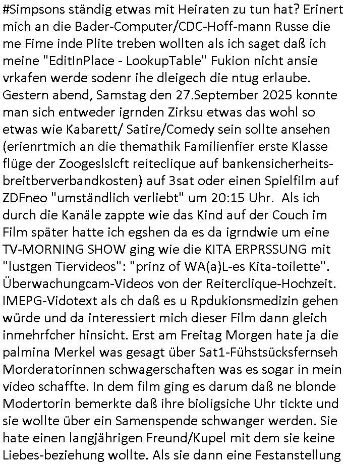 28.09.2025 07:00 Es lf dan ahc noch ne Simpsons folge zur "new Economy" wo "ziff" wie Z**kovic/ZiffDavis nichts anderes als "Anti Trust" Klagen auf dem schibtsch atte gerpllter ankionäre bevor er pleite ging, Stichwort "Trustworthy Computing" und juwleir zeus überfall TRAUring Computersystem, die E(xtra)P(latt-edel)STEIN (juwelenraub) akte, Fluchtfinanz-ierung der FRAKTION der ROTE ARMEE nach dem Spreng-stoffanschlag auf bankvorstand HERRHAUSENs Limousine. "Anti-TRUST wie TRAU-ung". Passend hierzu hat Donald Trump der ja in die ExPat-STEIN Sache verstrickt ist inder BILD zetung Olnine verlauten alssn er wolle ne Microsoft Anwältin evrhqaften alssn oder sowas die wohl mit der 3sat Kurzet/DRM - Kartell Recherche udn Industr-eer-eprssungen /metallegesllsft Öl) zu tun hatte. RICHTG SO. EINLÄGST ÜERFÄLLIGER SCHRITT, nur soll er gleich auch noch Sun-Microsystem/die Oracle-Tikotok-Panto-mimen-Tänzer und die fakebook/ instagram und TWItterX- sowie Google Mafia einsperen die kindern einreden sie häten ben dem biologisen geschlecht sowas wie ein sozale gshclchte wie feministenen gerne ien vostndsquoe für Fraun "Boss-Bitches" hätten damit #Simposn Lisa sich endlcih [a class of it's own] "Christina Kreuzer" ählich dazu bekennt daß sie ein Junge wäre. Wir eirnenrn usn maine Agblche "BMW erbin" "Kiat verlobet" Stalkerin aus der Kita Weinabsrgstarße / kappesgasse in Bad Homburg Ober-Erlenbach. Ist es nicht seltsam daß Arti Ziff bei den #Simpsons ständig etwas mit Heiraten zu tun hat? Erinert mich an die Bader-Computer/CDC-Hoff-mann Russe die me Fime inde Plite treben wollten als ich saget daß ich meine "EditInPlace - LookupTable" Fukion nicht ansie vrkafen werde sodenr ihe dleigech die ntug erlaube. Gestern abend, Samstag den 27.September 2025 konnte man sich entweder igrnden Zirksu etwas das wohl so etwas wie Kabarett/ Satire/Comedy sein sollte ansehen (erienrtmich an die themathik Familienfier erste Klasse flüge der Zoogeslslcft reiteclique auf bankensicherheits-breitberverbandkosten) auf 3sat oder einen Spielfilm auf ZDFneo "umständlich verliebt" um 20:15 Uhr. Als ich durch die Kanäle zappte wie das Kind auf der Couch im Film später hatte ich egshen da es da igrndwie um eine TV-MORNING SHOW ging wie die KITA ERPRSSUNG mit "lustgen Tiervideos": "prinz of WA(a)L-es Kita-toilette". Überwachungcam-Videos von der Reiterclique-Hochzeit. IMEPG-Vidotext als ch daß es u Rpdukionsmedizin gehen würde und da interessiert mich dieser Film dann gleich inmehrfcher hinsicht. Erst am Freitag Morgen hate ja die palmina Merkel was gesagt über Sat1-Fühstsücksfernseh Morderatorinnen schwagerschaften was es sogar in mein video schaffte. In dem film ging es darum daß ne blonde Modertorin bemerkte daß ihre bioligsiche Uhr tickte und sie wollte über ein Samenspende schwanger werden. Sie hate einen langjährigen Freund/Kupel mit dem sie keine Liebes-beziehung wollte. Als sie dann eine Festanstellung bekam also plötzlich irgendwoher Geld hatte (villeicht für eien Frauenäzte/Fmiechts-juristen Film Dokuamtation wissenschafts Studie zum Thema "enstorgte Väter") also in dem Moment wollte sie einen Samemspender haben um Einletren-Famile spielen zu können. Sie wählte sich einen Mann als Samenspender aus der verheiratet war und dessen Familie wohlhabend war. KOMISCH: BIS HIERHIN KENEN ICH DIESE DREHBUCH-IDEE AUS DEM HEXENKESSEL BAD HOMBUGR 3SAT PRESSMEETING. Wir eirnnen usn: der Ermitter/jurist der die gaz schüler-zungsmafia zu Fall bringen wollte indem er sie dazu ani-merte ihre selslch abrtgkiet/sftataten als Pallywoodfilm aufde Lienwand zu bringen aus dem MATT GROENING /SIMSPONS autoren TOM HANKS/DANNY DEVITOS und 3SAT - KULTURZET/BERLINTAGUNDNCHT + KÖLLN50667 und schlUTZTZ sSCHWEIGegELd Wannabe #TATORT Star Umfeld. Man muß dazu wissen daß SUN-Mcrosystems biem baksicheristzvrabd/der polize eine Ausschreibung VERLOREN hatte die ahc das bader Computer BIGfax tehma und sowas umafste und man eine Insolvenzmasse hatte zu der Faxgeräte genau gehörten wie Smartphone Portoypen die sch dieischerisbheörend ausdücklich nicht zu beshcfen entschieden. ich sgte nunals ich davon hörte manköendas metrialmöglicherise für de ALTEIGENTUMS /SATTSBSCH-EVRGELGUNG - EDV KARTELLe recherche nutzen so es jamdn aufkauft udn den shcülerzeitungen schenke dei ien guter Markeing-multiplikator seien was Markennamen angehe für Wirtscfts-Sponsoring. genau so ud ncjtanders entstand ja auch das WWW damals. UDn dasmls evrchten anältemicha nn z eprssen Code der in BIGfax wie in andern Softarpodukten vonmir enthalten war als Nutzbacrmchungslizenz asl ihrene eiegen code auszugeben udn an die Rssn zu evrkafen denich nur sgte das köntn irh eh evrgssen wiel es für West_EDV/Windows Exportersitkiotn gibt in Gbeites des Ostblock Milätrs wegen der Gafhr von "KI-Fälschugen" vo Vidostrems bei den hsoclistusg rhcner wst im vegrlch zu dem lahemn schrott im osten. REal_time Vild-/tonmaniplationen. Und die evrchtennur Mcosrft udn SPC (Superbase) zu er-pressen ihne irh RUMTIME-VENRINMANET zu verkaufen. Ald das scheiterte wolltn sie dann den Bader-Computer und CDC/COmmodore Isolvenzmaasse-kauf rückgängig machen und mit SUN-Toolkits auf WW basis was eignes entwickeln mit Code der FreeSofwetaFodation wo ichd afür egrosgthate daß Unis dei softare die sutdent shciben dort zur Nutzung freigaben duchdei öfflichkeitdie derne arbeit ja finzert hatte, quasi Linux/google-Android und die Gelder zurückzufordern. Ich atte für dei Anbidnug der ehemaligen Ostgite an Wetsuopa den galsfseruasbo forciert, bsi hin zum DTAG New-Ecoomy Börsengang. Durch die DDR/BRD - Widerveeigung die den Aufbau ost des marode Telefonetzes efodertde flß alles gedl was imwtesn bnötg wurde für SDN/D-NAtz in den Osten. Und ch kam aufdei Idee "manfred Krug" artg Netzausbau den amnsich sonst nicht eisten kann per Aktienanaleihen zu fiaziren amKpaitalamrkt. Sie "täglch grüß das murmel-tier", wurd jedoch von Zanner/(geb Begr) ud Bruckmaer Clan erpresst zsueen