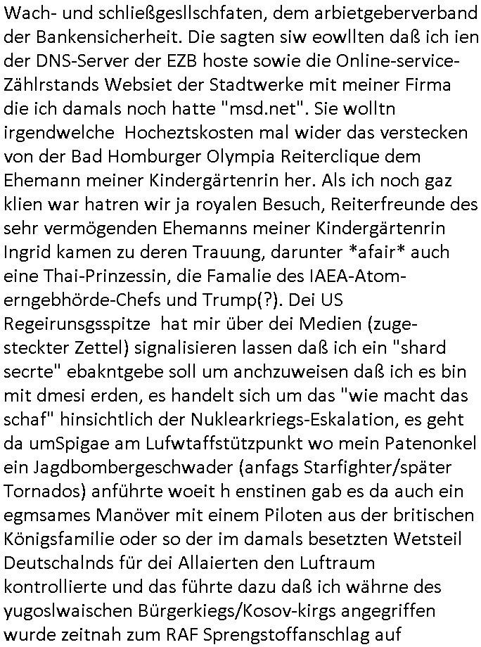 12.10.2025 07:45 Beihilfe/Begünstigung RAF–TERROR per Postunterschlagung Kursmanipulationen/erpresserischer Menschenraub/Straf-vereitelung, Gefangenenbefreiung, Zeugen-Medizinvergiftung/Vergewaltigung Maximilian Baehring Hoelderlinstrasse 4 D-60316 Frankfurt/M vorab vorerst per Fax: +49/(0)69/213-25154 persönlich/vertrauich Geschäftsleitung Mainova AG / Mainova Service Dienste GmbH Solmsstraße 38 D - 60486 Frankfurt a.M. Im Internet findet sich unter der URL http://banktunnel.eu/pdf.php und URL http://blog.sch-einesystem.de/ mein ausgedruckt über 33.750 DIN-A4 Seiten umfassendes Internet Tagebuch / Blog, als Offline Version downloadbar unter http://*** /***/ als ISO-Image (brennbar auf DVD) mit tagesaktuellen ZIP-Archiv Ergänzungen geändert URL: http://tiktok.maximilian.baehring.at Frankfurt am Main, den 12. Oktober 2025 Kundennummer P20169506454 Ihr Schreiben mit Absender Mainova Servicedienste GmbH c/o RZ Webmetering 06837 Dessau Roßlau eigegangen 10,, datiert 09. Oktober 2025, 1 Blatt, doppelseitig bedruckt, mit abtrennbare Zählerstandsablese Rück-Postkarte Ihre EMail erhalten 06. Oktober 2025 Betreff: „Zählerstandsablesung Mainova AG“ an <mobile@baehring.at> von <noreply@mainova.de> sowie ihre EMail vom 07. Oktober 2025 „Speicherung Ihrer Zählerstände“ und Telefonat vom 07. Oktober 2025 mit ihrer Frau „Drescher“ von 16:04 Uhr bis ca. 16:23 Uhr auf Rufnummer (+49 ?) 0800 / 0004263 Einschreiben RR5775 7180 2DE vom 31. Oktober 2024, Fax +49/(0)69/21325154 15:28 Uhr Kundennummer P20169506454 Ihr Schreiben datiert vom 24. Oktober 2024, 1 Blatt, doppelseitig bedruckt, 2 Seiten, per Post eingegagen 31. Oktober 2024, 14:15 Uhr betitelt mit „Zahlungs-Avis Verbrauchsstelle Hölderistraße 4, 60316 Frankfurt/M.“ Einschreiben RT 1019 30084 4DE Staatsanwaltschaft (Gemeinsame Poststelle Justizbehörden Gerichtsstraße 2 60313 Frankfurt a.M.) vorab Fax 08:20 Uhr an LKA +49/(0)611/327669122 Manipulation von Stromzählern / Tätlicher Angriff / mafiöse Tätigkeit des C***kovic Aktenzeichen 28098 C 360/24 AG Frankfurt/M (Niederrad), Aktenzeichen 380 C 478/21 Amtsgericht Frankfurt/M (Höchst), Aktenzeichen 2-16 T 94/24 Landgericht Frankfurt/M Aktenzeichen 1518 OLGCE 86366/2025 Oberlandesgerichtspräsidentin André Wilkening Aktenzeichen 1 KS 112/24 Landgericht Verden RAF - Terrorismus / Daniela Klette Eischreiben RR868520519DE an Generalstaatswanwaltschaft, Schloßplatz 2, 29221 Celle vom 24. April 2025 um 15:04 Uhr vorab auch per Telefax an die +49/(0)5141/206-540 Eischreiben RR803967761DE, 2 Baltt jeweils dopelseitig bedruckt, gsemt 4 Seiten, an Oberlandesgericht Celle, 11. April 2025 vorab Fax an +49/(0)5141206208 um 10:13 Uhr Vorgangsnummer: 24-210319 beim Postbank Privatkunden Beschwerdemanagement, Bonn Einschreiben RR577571759DE (Fax an +49/(0)228/5500-5515 31.10.2024 12:16 Uhr) an die Postbank Filiale (Filialleitung) Goethestraße 6, 60311 Frankfurt a.M. Rück - ECHTZEITtüberwiesung vom 30. Oktober 2024 an “Mainova Aktiengesellschaft“ Verwendungszweck „Kunde P20169506454 Fax +49/069/21325154 24.10.2024 16:35 zurück B8621057538VAvis per PostversandAvis per Postversand/B8621057538V20169506454“ an die IBAN/Kontonummer „DE71 5005 0000 0014 8460 20“ in Höhe von 128,34 Euro. Einschreiben RR577571691DE vom 30. Oktober 2024 an die Postbank (Filialleitung) Goetheplatz 6, 60311 Frankfurt/M., per Fax an +49/(0)228/55005515 um 12:08 Uhr. Giro-Konto-Gutschrift vom 25. Oktober 2024 Absender “Mainova Aktiengesellschaft“ Verwendungszweck „B8621057538VAvis per PostversandAvis per Postversand“ es ist noch eine IBAN/Kotnonummer „DE71 5005 0000 0014 8460 20“ angegeben sowie eine „Kundenerferenz B8621057538V20169506454“ ein Betrag in Höhe von 211,58 Euro. EMail Betreff: „Neue Online-Rechnung“ an <mobile@baehring.at> von <noreply@mainova.de> alias <noreply-online-rechnung@mainova.de> hier erhalten am 24. Oktober 2024 07:42 Uhr Ihr absolute miese Betrügerbande! Wie jede har/ immer gibt es nixhst als Ärger mit der Mainova / den Stadtwerken. Und das obwohl schon jede menge Satraafzeg agchte waurn Gctsvafhr anhängig sind. Als ich am 06. Oktober 2025 ihre im Betreff bezeichnete Email erhalten hatte in der es um die järliche Ablesung des Stromzähler ging entdcket ich zu mien Etsuan eine geänderte Zählernummer. Ich erinenrte mich dunkel daß der Hausmsiter etwas ezählt hate davond aß jendn verucht habe den zäher zu tauschen und ich sagte ihm er solle das auf jeden fall verhindern, immerhin sind da noch gerichtprozesse anhägig udnch werte das ganze als STRAFBARE BEISMITEVERNDICHTUNG udnwerde das asl siche zur anzge brigen. Als ich mich nun ihrer Email wegen in das Online Webportal „mainova.de“ einloggte sah ich daß auchd ort die nue Zäernumemr war, and deder zählerstanshistoroe der bisherigen Zählernummer suchte ich vergeblich. Sie ist aber noch Größtenetisl aus den rhcnugen der vergangenen jahr die ich auch als Download-Kopie zu hause habe ersichtlich. Wueterbannt ließ ich mir das Zählerhäuschn im Hof aussfchieß und enteeckt edaß tatsächlcih ein neuer zähler genau dort evrbaut worden war wo vorher der veisherig hing. Desn Zähertsnd war auch ungewöhlich niderge, ich verbrauche meist um die 100 kw/h im Monat. Ich hab dne neun Zährtsnd dann abgfilt/fotgrafert und sosfrt im Webirafce eigetragen. Dan habe ich bei der mainovanagrifen und eggat was das soll udnwi der laet Zählertsand sie. Der wurde mir mitgeteilt war aber zu niedrig. DI edame mit de rich von ca. 16:04 Uhr bis ca. 16:23 Uhr sprach auf der Rufnummer 0800/0004263 nantze sich „Drescher“. Der Name „Drewshcer“ (wie Schläger) ist mir asu ienm Tfafan im Bad Homburge Hexenkessel ende 1998 bekannt und ar vonKorruten Mitabriter iens Sicherheits-dienstes. Meine Mutter abriet bis etwa zum Sprgstoffnschag auf Dsuche bak Vostnd Alfred Herrhausen als Chefsekretärin beim „bundesverband der Wahc- und Schließ-gesellschaften“ in ad Homburg,d as istder abitgebervad de gel