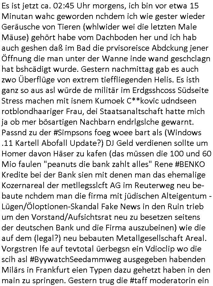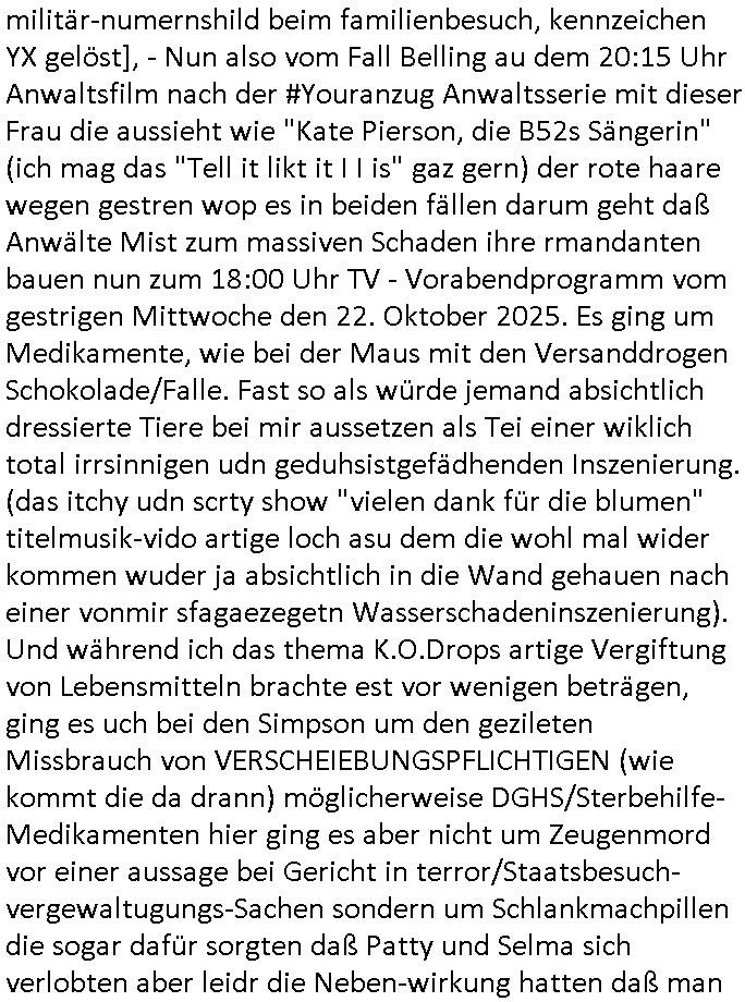 23.10.2025 05:45 Nun vom "Fall Belling" (das hört sich ein wenig so an wie Bähring wenn Asiaten das auszusprehen versichen die ja bei sprsche scrabblen immer [L] statt [R] nutzen einem in meinr kindheit sehr populären "urban myths" zufolge) und #Suits wo Analts-Assistentinnen Urkunden fälschen wohl wiel sie Angst haben den Job zu verlieren wenn ihre Geld über "Crorcodile Dandee" arge menschenfresser-Reptiloiden-inseln (hab ich erwähnt daß mein Vater ein Bergbau Dshungelcamp managte in dessen Umfeld die Vietcong-Kommunisten 1st class Flger Zoo-gesellschaft Reiterclique Aligator-Menschen-fresser-Tierschützer deutsches? Geld veruntreuten) und Schweiz (ich war auf ner inetrantialen/"schweizere schule", die bekam per THAILEARN SWIFT-Üebrisung gedl für den Heimat-schprachelchen unterricht vo managerkdern, gedl auf das türkische hasuerister in Deutschland dei nach der Wnde massenaarbeitslosen Ossi die Arbeitsplätze weg-nahmen die magels ander Qulifkation irh Gd mit Sügkietn autaten Schulkioske verdienten futterneidisch waren) waschenden Chefs in den Knast wandern, das erinnert mich an gefakte Immobilien-kauf urkuden von türkischen schwarzgeld-kostenlose-zeitungen-asuteil-arbietgebern/ rssuis fschovwurf hausmeistern die und Vera zanner (geb berg) Rufmordperssung. [siehe Humboldtschule HG Nikic und Bad Homburg HUS/Plantrich Oberelrenbch Oruhn der als nchabrc paparazzi Fotos von nato generalstabs-fahzeugen verkaufen wollte auf unserem parkplatz mit militär-numernshild beim familienbesuch, kennzeichen YX gelöst], - Nun also vom Fall Belling au dem 20:15 Uhr Anwaltsfilm nach der #Youranzug Anwaltsserie mit dieser Frau die aussieht wie "Kate Pierson, die B52s Sängerin" (ich mag das "Tell it likt it I I is" gaz gern) der rote haare wegen gestren wop es in beiden fällen darum geht daß Anwälte Mist zum massiven Schaden ihre rmandanten bauen nun zum 18:00 Uhr TV - Vorabendprogramm vom gestrigen Mittwoche den 22. Oktober 2025. Es ging um Medikamente, wie bei der Maus mit den Versanddrogen Schokolade/Falle. Fast so als würde jemand absichtlich dressierte Tiere bei mir aussetzen als Tei einer wiklich total irrsinnigen udn geduhsistgefädhenden Inszenierung. (das itchy udn scrty show "vielen dank für die blumen" titelmusik-vido artige loch asu dem die wohl mal wider kommen wuder ja absichtlich in die Wand gehauen nach einer vonmir sfagaezegetn Wasserschadeninszenierung). Und während ich das thema K.O.Drops artige Vergiftung von Lebensmitteln brachte est vor wenigen beträgen, ging es uch bei den Simpson um den gezileten Missbrauch von VERSCHEIEBUNGSPFLICHTIGEN (wie kommt die da drann) möglicherweise DGHS/Sterbehilfe-Medikamenten hier ging es aber nicht um Zeugenmord vor einer aussage bei Gericht in terror/Staatsbesuch-vergewaltugungs-Sachen sondern um Schlankmachpillen die sogar dafür sorgten daß Patty und Selma sich verlobten aber leidr die Neben-wirkung hatten daß man eine Art enstelledne Lähmung bekommen konnte im Gesicht, so B.O.TOX-Lippen artig. Nbewirugw wei bei diesen Kotaktlinsenversand - Abos. Jetzt würde natürlch FED-Tony der aber nicht garn mehr FAT sondern SLIM war plötzlich, er wurde ja neulich nach nem tödlchen Mafia-Arbistunfall durch Cousin "FIT Tony" ersetzt, also jetzt würd enatürlich FED-Tony niemsl jmdes Gscihst stsetllen per Vertümmelung nur damit er vor scham üe die iestellunge nicht im fernshene interviews gibt oder gar vor einem Gericht aussagt. Dieses Thema ÖDE PUSSSY ./. besimitefäschnder Chief SPEARMT-IN ? Was mich irgendwie an den "Jack White" Song erinnert "während DIE" französische "REGENtIN geSTÜRZt wird" war da nicht etwas mit "KRONE" einer selbstrenannten? herrscherin im LOUVRE . "Krone" ist hier möglicherweise gar nicht als ein Zahlungsmittel gemeint stichwort STÜTZ- KÄUFE VON FREMD-WÄHRUNGEN im EURO-SYSTEM / geld-schweinesystem im Rahmen eines Stablitätspakts. Nur wiel mein "zentral-bank.eu" Domain SSL Certifikat RENEWEN von duch gerscgftelr der Stadtwerkee mani-pulierte strom-rechnugen bedroht wird im urpüglch für den Arbei-geberverband aksischhrist vgehsen Netzmuß doch niemand am abgehörten telfon in Panik verfallen. Wie hiße es damals, i allschsilsmten notflls reiche ihne auch ein per SSL abgesicherter "central.banktunnel.eu" . So viel zum Thema die dRuck-"ente" vom Dukaten-Esel: die simpsons macher wollten dem Disney+ Streaming patent-konzepte Musical-Cartoons mit superreichen und tapsigen Vormünder dreier Kinder verkaufen, angeblich. Ich eriner mich wie mien Chessmates von "Jung & Matt" mal irgendwas von maniulierten Spielen durch Figuren-tausch erzählten. Beim SKYPE-Vodekferezn-Sat-Intrenet Fernschach wie bei der #Simpsons folge wo Homer gegen diesen Schach-großmeister speilt (russische Oppostion?) also da wär ds nicht passirt wegen dieser Fern-Schach-Notation im Videobeweisbild. "feind-bauer ehRensenf ". Ich hab mal was gehört von Fußmatten mit schachbrett-muster darauf, eclhe man an "SCHACH - MATT"e Spieler verteilt die in Expertenkreisen begehrt sind wie Nikolaus "Futter-Stiefel" als Turnschuhmafia-Fashion-Statements auf derselbigen. Soviel zu "ich bin nicht ihr fußabtreter" Humor im "duChamp" Design! Dann zeigte man Indira und schmidti und einen Leuchtturm wie den der chrom-erzbank allerdings nicht in frankfurt aM sondern am timmendorfer strand in #brliNueKölln02407 respektive bei #berlinTagUndNacht . Es folget die 3sat #Kulturzeit wo es um Afghanistan Flüchtlinge Abschiebeflüge ging. Irgendwas mit einer Hebarme dei potest gegen Schleier natcfat hatte und vor religöne hrdlinern fliehen musste. Gibt es da iegelch auch Zwangsehen vom Typ der Rück-frage wenn jemannd heiratet "muss er denn (ist seien freudin schwanger?)" Dann hieß es daß POlarisierung in den USA zum "Wort des jahres" gewähöt wurde, nicht "goonen"/ "das crazy" was sich irgendwie "denglisch" anhört und mich an heise-forenacciunt "AnglizsmenEx" erinnert, einen Troll. Es ging dann um die "STADTBILD" Debatte "NAZIS RAUS"-zaubern, (ethnisch
