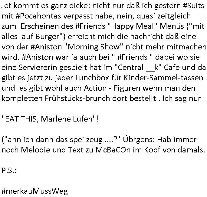 23.10.2025 13:30 Jet kommt es ganz dicke: nicht nur daß ich gestern #Suits mit #Pocahontas verpasst habe, nein, quasi zeitgleich zum Erscheinen des #Friends "Happy Meal" Menüs ("mit alles auf Burger") erreicht mich die nachricht daß eine von der #Aniston "Morning Show" nicht mehr mitmachen wird. #Aniston war ja auch bei " #Friends " dabei wo sie eine Serviererin gespielt hat im "Central __k" Cafe und da gibt es jetzt zu jeder Lunchbox für Kinder-Sammel-tassen und es gibt wohl auch Action - Figuren wenn man den kompletten Frühstücks-brunch dort bestellt . Ich sag nur "EAT THIS, Marlene Lufen"! ("ann ich dann das speilzeug ....?" Übrgens: Hab immer noch Melodie und Text zu McBaCOn im Kopf von damals. P.S.: #merkauMussWeg https://www.bild.de/unterhaltung/tv-fernsehformate/the-morning-show-schock-star-fliegt-aus-der-apple-serie-68f8b10d4fa665dfcbddd479 [0] "202510231330-0-1.jpg" [1] "202510231330-0-2.jpg" |