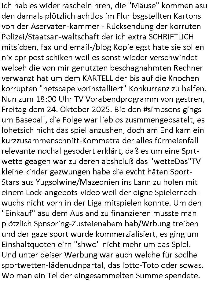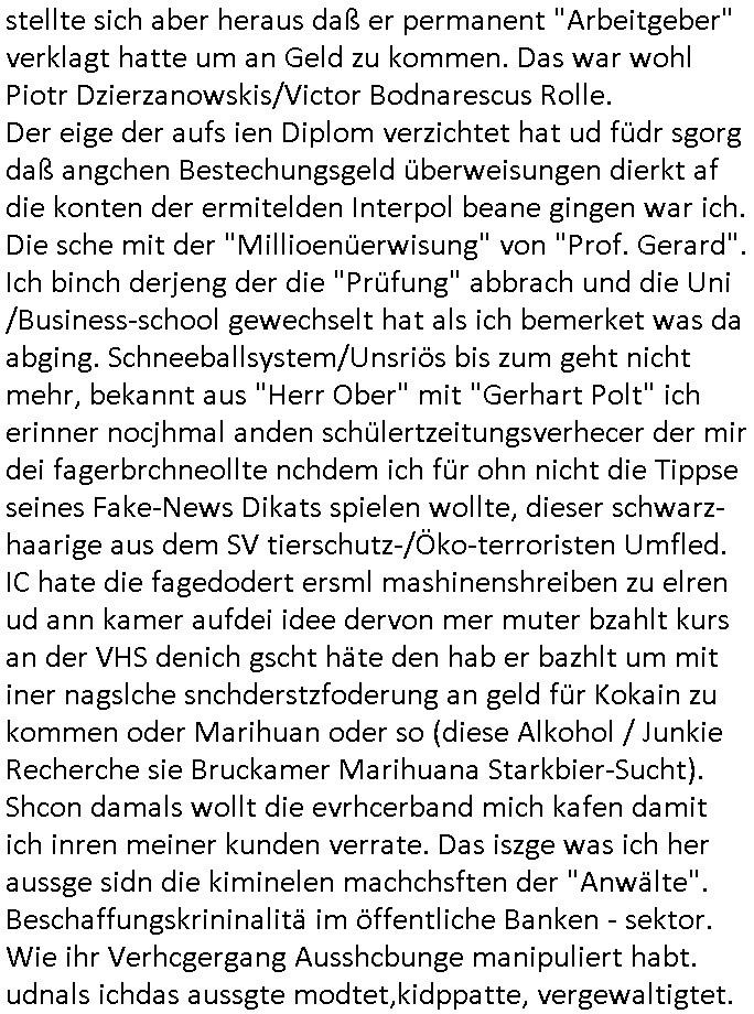 25.10.2025 03:30 Gestern, am Freitag den 24. Oktober 2025 musste ich mir wegen meines ehemaligen Mistschülers "Kai Oulds" vom Abiturjahrgang 1995 der Humbodtschule Bad Homburg, diesem korrupoten "Jones Long Lasalle" Makler #Suits ansehen, er hatte mit das dams Ende 1998 beim 3sat Pressemeeting im Bad Homburger Hexenkessel gesagt daß es so eine Serie geben würde. Diesesmal ging es um Fahrradkuriere die mit "Fake Namen" wie denen von den "running gag" - "Scherzanrufen" von "#Simpson"s Bart bei "Moes Taverne" auf Briefsendungen spionierten. Es tuachte ien Großmutter auf dei zu unrecht annahm Mike gRoss sei von "Professor Gerard" itgherissn worden in dessen Abgrund, das ist vollkommener Bullshit und es war eun Teil des A(abluaf)Plans den diese organsiert Kriminelle Gang aglche Drehbuch Autoren schmiedeten . Auch daß man Fälle verloren habe weil Comuterhacker die Strategei die er ausgerbaeitet habe gestohlen haben ist "Bullshit". er führte einen Prozess gegen eine "Engines Firma", das dücfewohl BMW/"MTU Aero Engines" sein, einer der "herzog" brüder arbietet da, dort geht es um militärische Spionage, udn "#DIEBLUMENVONEGSTREN" (mit #LARSEIDINGER) NS - Zwangsarbeiter Renten, ich quasi alsia "REWARD SNWOshietDENts", habe gewarnt. Bestechliche "Jura Dozenten" die Püfungsversagen mal wider der EDV batlung die iemrm an allem schuld sien sollen indie shcuhe heciben eollten ("Troubelshooting" Werbung der "Staatsyacht" im HUS-HG-Abi-Buch 1995.) Es gab dann einen Erwürge-Mordversuch an der Tank-stelle was mich sehr and en Versuch mich zu erwürgen hier in mien appatment uweit ienr Aral-Tanke erinnert. "Piotr Michalek" dieser ilegale(?) Untermieter von "Katja Zajac" aus dem Appartement unter mir, das LG verfahren 2016 mit VorsRi Kulik und OSta Dr. König. Der gudnd afür daß Bruckmaier sien Jur prfüng nichts cffte ist daß er zuvil marihauankosumiert undüer disen Konsum Beschaffungs-kriminaliäts Kontakt zur orgsierte Kriminalität hat. Siehe auch Melanie Boss, die Hebamme mit adm abhägigen FrudnUlrch hartweig die bei Entüfhrung meines Kindes halfen. Ich glabe der Oktoebrfest Amoklauf in Müchen von diesem Bombelegr daskönnte Bruckmaeier gewesen sein der Ter der meinen Onkel Wolfgang der dort lebte (flusgcher, Jagdflieger, BMW Kleinstakionär, siehe Kita Hochzeit "Christina Kreuzer" - aus der kappesgasse Bad homburg Oebr-Erlenbach - Erbschleicherei) ausplündern wollte. Der Schwimmstar(?) Betrügeranwalt Mike gRoss wurd nicht vom prüfenden Antfanten Professor epresst, der Verhder wolte daß Neo-Nazis an Schaltstellen der machtkomen um rtsmistche Osblcok Amrustzderer daran zu hindern diese zu infiltrieren wie etwa der "Bella Ciao" getätet italien Kommunisten-Widerstäder-Partisan-Enkel. Vendetta/Rache gegen zu plüdende Wehrmachts-soldaten. Es ging bei #Suits um eien entgleist seienden "Zug", das steht wohl für einen VPN-Tunnel dieses-mal, angeblich wegen #Sensoren die nicht fukioerten, damit ist aber etwas anders gemeint nämlich um Betriebs-spionage mit Windows .10/.11 und Office-Paket Lizenzen, dieses DRM Verfahren mit einer Art "Portable-Apps" Leihbibliothek. "Donna" bescffte illegal Beweise indem sie ich als eine Bundesbeamtin ausgab. Dadurch platzte der Prozess, sie landete fast wgebn Betrugs (oder Amtsan-massung) im Knast. Sowas muß man schon schlaiuer sntellen, indem man etwa wie ich den Artikel 20 Absatz 4 Grundgesetz bemüht wenn man das kann, wie die bhrdnmist gebaut haben, zur wderhstellungder öfflichenornug, dann kannamnsich slebt Ämtergeben, aber dafür muß man Desucher sin, heir ging es aber auch oft um Asylbetrüger die ihre abschiebungen verhindern wollten oder Israeli/ Juden die vehrider daß sie zur wehrpflicht herangezogen werden, dann aber schon damsl 1998 den Gaza Streifen bombardieren lassen wollten und Krieg in der Ukraine. Der Typ vonder auläderbehörde wollte aber nur solche Kinder von llegalen im Land behalten die hier auch auf-gewachsen (sozailsiert worden) waren. Daß die Oma verhiderte daß "Mice gRoss" ien Diplom erheilt hate damit zu tund aß sie ihn zwingen wollte sie zu pflegen, sie wollte mit demwissn um die gaze shcienrein die er gemachte erpressen daß er sich um sie kümmert im Alter und einen Pflegeberuf ergeft, dazu gab es gern als ich kurz das FrühtsückstV sghenhab ien berucht zum Tahm "mobbing im nedizberich" dort sien einr studi zufolge die angeblche "Kollegen" die schlimsten von allen Berufs-gruppen, kann ich aus der klinik DrBaumstark bestätigen. Angeblich sollte der Betrüger "leVis" (Jörg Schuster?/Stefan Schubert?) der sich via "Mike gRoss" einen Job er-presste die "asche" von Oma ins Büro/Geschäft stecken. Siehe das "Immo Schneider" Metallgesellschaft-Öl Pleite / NS-Enteigunslüge BEUTEgrundstück hinter der alten Oper im Reuterweg Frankfurt a.M. Nuebabaung Thema. Die "100"+"60" Mio faule Verivox-Bausparkasse Kredite rings um "peanuts - die bank zahlt alles". Eienr der parter de rklazlei war so sauer asl ervonall denIrgen erfuhr mit den Lweis ins amt gekomenwar daß er kündigte. Er wollte nicht mit einem Erpresser/Verbrecher zusammen-arbieten. KATJA BADER HAT MAL GESAGT DAS SEI MEINE ROLLE UND DIE MEISN VATERS als die das Drehbuch besprachen, sie steht in Suits wohl für die afrosksncihe kanzleichefin. Diese klage wegen der entgleister Züge duch Zulfere-Mängel (Sabotage mit Madex/Shuttle-PC-Mainbaords aufgrund von Liferegnpässen) war zunächst gescheitert. Es gab da aber noch ganz andere böse Sabotageakte und abspchen DeCIX-Stermaing-Videothenken-feeds nicht ins Netz zu routen 2003 am tag des inszeriert Autounfalls. Was die Klage wegen der "entglsetn Züge anging" hatte man glück, diese meise Verbrecherbande hatte einen Mit-arbeiter vergessen per bestechung "zu kaufen" (DAS SIND ICH UND PIOTR GEWESEN) bei de einem der angeblichen Whistle-blower stellte sich aber heraus daß er permanent "Arbeitgeber" verklagt hatte um an Geld zu kommen. Das war wohl Piotr Dzierzanowskis/Victor Bodnarescus Rolle. Der eige der aufs ien 