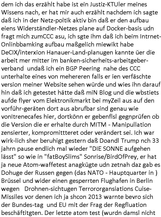 01.11.2025 05:45 Gestern wollte ich wegen der E-Mail vom Provider mit dem vorgezognen Rechnungsdatum deretwegen ich hatte am Monatsende noch das letzte Geld auf Koto einzahlen müssen von dem wenigen was ich noch an Bargeld zum Einkaufen in der Tasche hatte damit die Unvohergesehne Abbuchung nicht zurückgeht nochmal einen Kontoauszug holen. Dabi traf ich in der Innenstadt auf eine Art Stand von "corono verschwörungstheoretikern" von denen ich midnestens einen aus dem Terroermitelr Pressmeeting im hexenkessel Ende 1998 wiedererkannte, einer derjengen Leuet die mit der per "fake news" zu schüren gelpaneten "Vogelgrippe Pandemie Aktieenpanik" zu tun hatten. Es stand auch ein Fahrzeug der Polizei daneben. Die Innen- stadt war voller Menschemgrupen von Asiaten die eben-falls ewta vor der füheren "PEANUTS - DIE BANK ZAHLT ALLES" Zeilgalerie an der /myZeil Mall Stände aufegbaut haten und voll von Polizei. Als ich an der Konstbaler-wache zurück war fuhren zivle Pegtet-Kleinwagen der Kripo mit aufgesetztem Blaulich Richtung Gericht so las hab man den Vistkartegroßne Flyer den ich aauf Höhe der Haupt-wche andie polize üergab dorthin gebracht nchdem ich miennarben gezgethatet, mien duch Folter entstandenen zahstand und kalrgcht hate daß ich mit midnetsn einem gekidppaten Kind erprsst wurde mr vor lafdner webcam die Pulsadrn aufzuritzen damt ich nicht ausssage im RAF Tarfvorfahrn Herahsuen/Klette vor gericht. Dieser Mann von dem vershcörunsthortike Stand dem ich das erzählt habe ist ein Justiz-KTUler meines Wissens nach, er hat mir auch erzählt nachdem ich sagte daß ich in der Netz-poltik aktiv bin daß er den aufbau eiens Widerständler-Netzes plane auf Docker-basis udn fragt mich zumCCC asu, ich sgte ihm daß ich beim Intrnet-Onlinbbamking aufbau maßgelich miewikt habe DeCIX/interxion Hanauer-Land-planugen kannte üer die arbeit mer mItter im banken-sicherheits-arbeitgeber-verband undaß ich ein BGP Peering nahe des CCC unterhalte eines von mehereren falls er ien verfäschte version meiner Website sehen würde und wies ihn darauf hin daß ich getestet hätte daß miN Blog und die wbstiets aufde flyer vom Elektronikmarkt bei myZeil aus auf den vorführ-geräten dort aus abrufbar sind genau wie vonItrenecafes hier, dortkönn er gebenflsl gegnprüfen ob die Version die er erhalte durch MITM - Manipullation zensierter, kompromittteret oder verändert sei. Ich war wirk-lich sher beruhigt gestern daß Doandl Trump nch 33 jahrn pause endlich mal wieder "DIE SONNE aufgehen lässt" so wie in "fatBoySlims" Sonrise/BirdOfPrey, er hat ja neue Atom-waffetest anagkügte udn zetnah daz gab es Dohuge der Russen gegen (das NATO - Hauptquarter in ) Brüssel und wider einen gesperrten Flughafen in Berlin wegen Drohnen-sichtugen Terrororgansiations Cuise-Missiles vor denen ich ja shcon 2013 warnte bevro sich der Bundes-tag und EU mit der Frag der Regfluation beschäftitgten. Der letzte atom test (wurdn damsl nicht "Greenpeace" terroristen verhaftet und deren Boote versenkt von den franzosen wegen Spionage) fällt in die Nachwende-Zeit, im Jahr 1992 sei das gewesn schreibt die "Bild-Zeitung". Frankreichs ex-Päsident sitzt jetzt im Knast und aus ds britische Köngshaus hat wegen irgendwelcher Unter-schriften heftige probelme was Europas Atommächte betrifft, ich wieß ja nicht welchenn militärischen Rang Prinz Andrew hat so von wegen "Lufthoheit-KI-Videos" die Donald Trump verbreiten ließ auf denen die eigene Bevölkerung bombardiert wird. Ich erinnere mich daß einr der Royals vor der verweigerten Untershrift Bank-Budpräsdnet Horst Köhlers unter das nach "9/11" neue "Luftsischerheitsgesetz" mit für dei Kontrolle des NATO luftraums duchdei Siegrmächte eür der BRD zustädg war. Bin mir da aber nicht 100%ig sicher. Bitte überprüfen. Dei Chinesn habn derweil in den Medien heir darstellen wollen daß Eiegung im Zoll Streit und Atom-Drohungen zeitlich im exakte selben augen-blick geschehen, es kann sich also nur um Zufall handeln daß China genau in dem Moment unterschreibt als die USA nukleare Massen-vernichtung ins Spiel bringen das hat mit rehctugültgen aufgezwungenen Unterschriften also nichst zu tun. Die chisne bracuhne den Westen als Absatzmarkt (etwa für eAutos oder uch "es gibt ein peer mher auf Huawei" Elektronik) sonst ist der Aufschwung duch Exporte asu den Sonderwirtschaftszonen futsch. Der gloabls süden ist zwar ien goer makrt hab er kein Geld. https://www.bild.de/politik/ausland-und-internationales/trump-schock-in-china-explodieren-bald-wieder-atombomben-690325f7ce65bea0d55e4a39 https://www.bild.de/news/inland/fluege-umgeleitet-drohnen-alarm-am-berliner-flughafen-69052c74a6bc3e9242fc87f3 https://www.bild.de/politik/ausland-und-internationales/putin-vertrauter-droht-nato-land-dann-wird-belgien-verschwinden-6904dfaca6bc3e9242fc84e2 https://www.bild.de/unterhaltung/royals-adel/koenig-charles-zieht-schlussstrich-seine-handschrift-williams-sieg-690494f36af191ff5d2887e5 https://www.bild.de/unterhaltung/stars-und-leute/nicolas-sarkozy-im-gefaengnis-carla-bruni-besucht-ihren-mann-6904e3dbb9e7d6b545d108fc [0] "202511010545-0-1.jpg" [1] "202511010545-0-2.jpg" [2] "202511010545-0-3.jpg" [3] "202511010545-0-4.jpg" |