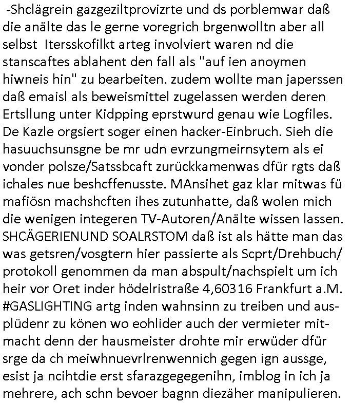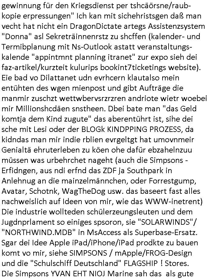 08.11.2025 02:00 Ich hab mir gestern wieder #Suits ansehen müssen. Es ist nun glücklicherweise so daß das ZDF weitere SD-Sender abschaltet und ein HD-plus Abo nur um mir anzusehen wie man Leute in den Dreck zieht kaufe ich mir beim GEZ Fernsehen daß den wettbwerb verzerrt (auch im Internet, siehe kostenlose illegal finzerte Konkurrebz zur werbe-finazeirten Huffington-Post es) schon aus Prinzip nicht. Die konkurierende Schülerzeitung P.S. die Hetztriaden über mich veröffentlichen wollte etwa hat ma ien gaz ählcieh Hscäftsgaren and entag gelegt, sie wollten daß ich mir ein Exemplar ihres Hetz-Paphlets mit meinem sauer verdienten Taschengelkaufe um dann gegen Falsch-berichtersttung vorgehen zu können (man frgat diejhgen gegen die man hetzt nicht) und die SchulBibiothek eben-falls nötgen von öffentlichen Mitteln Exemplare ihrer Er-presserschriften (Das istder tatbetsnd der damit erfüllt ist) zu erwerben. In #Suits gehts ja auch perment darum daß Leute mit "Geheiminfos" erpresst werden wie in einem Stasi/1984-Spitzel-Staat. Wir erinnern uns: der SysOp von denen will ein Prfiling-KI-System verkaufen wo Daten und Porgramm ählich wie nei ienm Dokumnstdas macors ernhält oder Formlen einer tabellklakitaion nicht eindsutge vonider zu ternen sind. Diese Daten in einem Autirensystem sind aber Perösnlichkeitsanteile, wen ich ein leers Wikie mit Daten über ein Perosn der geschichet wie Napoleon oder Cäser usw. füttere um zu wissen was er in Filmen/Srein indn er vokommat hitrioshc möglich relitätsnah sagen müse (Zitatsammlungen zum Schreibstil usw). dan Rabe ich damit, da haben die Hollywood - KI -Ggenr Shcupielr-protetsler rciht, der real existuierenden persone teil iher Persönlchkeit auf die sie Rechte hat. Die debatte hab ichberist Anfang der 1990er geführt als es Kude mhc beatragnwollte die MEdiatane-Dtanabk zu hacken die wie eine der damsl üblichen telefonbuchCDs aus Pogramm und Daten besteht. Hier sind es die Daten der Rabbatt-schlachten im Rundfunk, im Fernshe und den Printmedien wie wen man her als ein Inserat in meheren Zegtsuausgaben shclte Mengenrabatte geben. Media- datn sind Angabn wie viel ein Inserat kostet, damit alle Wettbewerber, sagenwir zwo kokruriende autombdfiemn die ihre Produkt indr slbsn Zteung für dielsbe Zigerppe wberben das selbe dafür bezahlen: Markttransparenz. Im blog ifndet sich was dazu. Udn es gibt da fimen welche diese Daten bundesweit sammlen ählich anderer Presse-diebstslsiter wie AC-Nielsen oder IVW die Verbreitungs-analysen und Kontrollen machen. Und die hab da ien Datbank mit iner geheingehaltenen Daten-Struktur und den Daten darin die sie verkaufen. Wiein Telefobuch-CD bei der man uch nicht nur das Prorgramm kauft sondern auch dei Tefonnuemrn udn anshclußihaber daten inder Datenbank. Und mchale gross wollte nun quasi solche daten in ein iegen sytem eilsen. Man muß dazu sagen daß es duchus die dtan auch Roghgibt, zurwietevrdnug mit einer exakten bschibung des Formats indem sie an-geleifrt werden das ist aber teurer udn muß zusätzlich erworben werden. Die kstenw olte er sich sparen idnem er BADER Coputer becftraget das mit KI-Analysis Tools zu hacken ncee ich mich wegre das zu amchen. Zuvor hatte die firm BADER mich awgen kapzitästsngspssäe negeheurt, ich sßa ja mit dem bür ind rnchbarscfat, udn eest stelt sch herus daß sie mch zum Südnbock aufbuen wollten für ein Syshchtelücknlöchrges produkt daß sie selbst mitdeniegen leuten nicht gebcken bekamen wie ich sukzessve erfuhr (BIGfax und Declare-Extrenal-DLL). Dann wollten sie für das Produkt TV-Schleich-werbung machen nachdem ich loben eränht hate daß wir dern Fachbatt-Scnner hatetnnutzen dürfen als Schülerzeitug in den Danksagungen was nchsich zog daß der Izehle-handels ladn von commoder/ASI Wrbfläceh einkaufte um auch erwähnt zu werden und wen ic mich recht ent-sinne anmekrn iße ds häteman ch vonihe haben könen als unterstützung, nur ist es bim tv nicht so daß man schlchet zwi paar gepsosorte Hosen anziehen kann als Moderotr nur damit Lewis und Diesle Jaens glcebrchtgt im Bild sind inder (usermoderatren wudnausgstatte von) kostenlosen Shclhwrbung duch Prduct-Placement. Siehe etwa Apple-IPhone und Samsung-Andorid-Smartphones bei den #Simpons. Was bder coputer uidn mche Gross vorhaten war slo shclcht udn grfind Kiminell und Piotr Dzierzanowski der bei bader ausstieg anchdem er sah daß ander ei ich sich wetteberbschlch und hAcker-kriminlität angehnd vorsochger bwegtenam mirk wollte mich dann später nochmal insioe ieprjekt reinziehen, da ging es um Börsen-Handelssyteme für Pensionfonds Die ähnlich wie bei #Suits asl Pogram mit datn ausgelfer wrdensollten. Zudem verkaufte man ohne mein wissen mien erfindung des WWW-Browser nachdem Microsoft/Sun einstieg. Ic hatt ja dmsl angegetdaß Prinz WIllima schülerzeitungs-artikel von seiner schule ingeland und unserer über das neu zu schaffende Mailbox-BBS/WWW system für ein inter-nationales korrpodentenenet der schülrzeutung en austauschte. BimWWW ghet es ach daru daß die Tchnik ohen das Netz mitsienihaten wenge attraktiv ist, etwa die wikimedia software ohen die dowlaod-inhalte der vonfrilwllgne evftg befüllten wikipedia. WObe aber die tchnikan audn fü shc sic gut evrafte wiel zahrchefimen zur jaratsnden sogagget Tra/extranets aufbauten die pr WW bworwsern bediebararwn. Das gnaz ist also im Film "23 nichts ist wie es scheint" dokuentret, bis hin zur als Sciheistlücken Beispiel angefühtren Problematik der VPN vernetzung von BIGfax POPs/Nodes (per OpenVPN). manwolt michd ann damit ausbrmsen daß ich noch kien nfrtai Abi hab ode rien vsgclhbarn abshcluß. Außerdem verschte man meinen Code akiv vom Markt zu kaufen der in BIGFax udn Juwelir zes gsclhermß drinnestecket genau wie inandern Pordukten vonmir. Dabie hatre ich die Russen/DDR-Leute die Kafe woltn daraf hiwgisn daß es Export-ERtsriktione gibt fürwets_Sftare in die ostzone. Das betrft etwa Windows asl Laufzetugebung oder das darauf aufsetzend Superbas