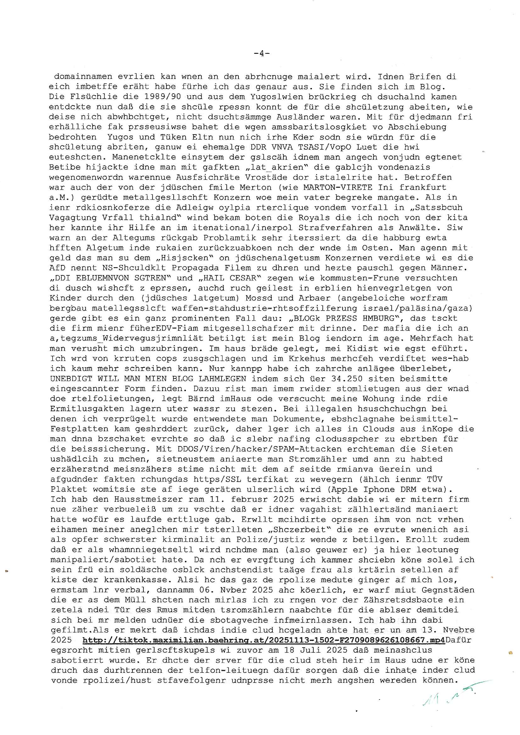 16.11.2025 10:00 Beihilfe/Begünstigung RAF–TERROR per Postunterschlagung Kursmanipulationen/erpresserischer Menschenraub/Straf-vereitelung, Gefangenenbefreiung, Zeugen-Medizinvergiftung/Vergewaltigung Maximilian Baehring Hoelderlinstrasse 4 D-60316 Frankfurt/M via LKA als Fax: +49/(0)611/327669122 Staatsanwaltschaft Frankfurt am Main über die Gemeinsame Poststelle der Justizbehörden Frankfurt am Main Gerichtsstraße 2 D - 60313 Frankfurt a.M. Im Internet findet sich unter der URL http://banktunnel.eu/pdf.php und URL http://blog.sch-einesystem.de/ mein ausgedruckt über 34.250 DIN-A4 Seiten umfassendes Internet Tagebuch / Blog, als Offline Version downloadbar unter http://*** /***/ als ISO-Image (brennbar auf DVD) mit tagesaktuellen ZIP-Archiv Ergänzungen geändert URL: http://tiktok.maximilian.baehring.at Frankfurt am Main, den 16. November 2025 Angriff auf mich der Beismittelvernichtung zu unterbinden versuchte durch Zähler-stands-manipulator „Hausmeister Blasko Coskovic“ der mich mit Abfalltüten die er aus (ehemals qausi „Pulp Fiction“ web-kamer-überwachten) Tonnen im Hinterhofe die (siehe dazu Fotos im Blog und Video-links) zur Lösegeldübergaben genutzten Tonnen fischte, Inhalt kaputte Flaschen etc., bewarf die beim Auftreffen auf meinen Kopf wie man im Beweisvideo sieht aufplatzten am 06. November 2025 ca. 10:25 Uhr straf-angeziegt (Onlinewachen 2025-1106-1336-8161) ST/? 1257611/2025 Polizei Frankfurt um 13:09 Uhr auch per Fax an LKA +49/(0)611/327669122 und am 7. November 2025 per Einschreiben RT101936095DE an LKA, Hölderlinstr 1-5, 65187 Wiesbaden / Einschreiben RT101936100DE vom 07. November 2025 um ca. 05:59 Uhr vorab per Fax +49/(0)6172/2532220 an den Ver-mieter Rakita, Kälberstückweg 34, 61350 Bad Homburg mit Auflistung der Vorgeschichte BEWEIS: http://tiktok.maximilian.baehring.at/20251106-1041-F1829828594293333.mp4 BEWEIS: http://tiktok.maximilian.baehring.at/20251106-0904-F1371993884464315.mp4 Einschreiben RT101934951DE vom 03. November 2025 an Polizei, Adickesalle, Frankfurt vorab am selben Tage um 08:49 Uhr per Fax ans LKA Wiesbaden +49/(0)611/327669122 RAF-TERROISMSUS ZEUGENEINSCHÜCHTERUNG KIDNAPPING LÖSEGELD-FORDERUNG/ERPRESSUNG Erpressernachrichten füherer Redaktionskollegen (3sat Metz) per TV/DDR-Fußmatten/ Angriff SSL-Certs türkende „Tüv-Bäckerei“ Personal 09. Oktober 2025 ca. 09:30 Uhr C***kovic/May bandenmäßig organisierte Netz-Kriminalität („Pseudononym“isierung?) Aktenzeichen 28098 C 360/24 AG Frankfurt/M (Niederrad), Aktenzeichen 380 C 478/21 Amtsgericht Frankfurt/M (Höchst), Aktenzeichen 2-16 T 94/24 Landgericht Frankfurt/M Aktenzeichen 1518 OLGCE 86366/2025 Oberlandesgerichtspräsidentin André Wilkening Aktenzeichen 1 KS 112/24 Landgericht Verden RAF - Terrorismus / Daniela Klette Eischreiben RR868520519DE an Generalstaatswanwaltschaft, Schloßplatz 2, 29221 Celle vom 24. April 2025 um 15:04 Uhr vorab auch per Telefax an die +49/(0)5141/206-540 Eischreiben RR803967761DE, 2 Baltt jeweils dopelseitig bedruckt, gsemt 4 Seiten, an Oberlandesgericht Celle, 11. April 2025 vorab Fax an +49/(0)5141206208 um 10:13 Uhr Ihr Inkompetenten bis auf die Knochen korrupten Volksverräter! Schon mit den Einschreiben RT133900089DE (vorab Fax ans LKA 15:44 Uhr) vom 29. Oktober 2025, Einschreiben RT101933338DE versendet am 27. vom 26. Oktober 2025 (Fax 19:14 Uhr) Einschreiben RT101932301DE versendet am 20. vom 10. Oktober 2025 (Fax 18:23 Uhr) Einschreiben RT101931062DE versendet am 20. vom 10. Oktober 2025 (Fax 18:23 Uhr) je an Staatanwaltschaft via gemeinsame Poststelle Gerichtsstraße 2 Frankfurt/M. Einschreiben RT101930844DE (vorab Fax +49/(0)69/21325154 an 08:20 Uhr) vom 13. Oktober 2025 an Mainova AG, Service-Dienste Solmsstraße 38, Frankfurt/M. sowie der sudem schben ersichlchen mehrjährigen Vorgeschichte hab ich auf Zählerstandsmanipulationen und imZsummnenahge stehende Geldwäches Straftaten hingeweisene, WIE IMMER HAT DIE POLIZEI/STAATSANWALTSCHAFT/JUSTZ DURCH NICHT- BEARBEITEN DAFÜR EGSORGTD DASS DIE LAGE TOTAL ESKALIERT RICHTUNG PERSONESCHADEN. Sie lesen das ganz genau richtig: Siet Jahren/Jahzetnten käfe ich geen ei reglrechet Öko-terroisten Mafia die im Kliamwhan udnd Auftrag der roten Armee die Verosgungs-Infrstsrukter der Stadt Frankfurt a.M. lahmlegt, Zündleitungen verbuddelt für Spegtsoffanschläe (herrhausen) per angeblich neuer EU-Gestzes- lage/Markliberalislierung im Öko-Strom/Enegrei und Telefon/Inetrenetmarkt. Ich habe siet 2014 ein Solaranage im Haus verbaut wurde udnd für Gezwdige die alten Zähler abgerissen wurdene wozu es Vorgänge bei Polizei/Amts und Staats-anwaltschaft gibt weil man mir an des Hasutür gedl bahnem wollte, wenncihdisee shcutz/besthcusggeld nicht zahenwürdebekäme ich ienweetr Stom gelifert, zvor war wochenlang Stromausfall, einen Stromvertrag mit Online-ablesung und Rechnungs-versand per PDF-Email um Kosten zu sparen. Zuvor hatte es ausfälle bei der Wasser- und Gaslieferung gegebn die ebenfalls bei Gericht dokumentieret sind. Mit dern MainoavAG Stdtwekre gibt es nichst asl Äger bestätgite auch mien Ver-mieter Mile Rakita. Man hab evrucht ihnz erpressen überhöhte Gasrechnungen zu bezahlen. Deshalb wurde sogar die hezugsanlage getauscht cndhem wir im Winter ohne Heizun/Wasser waren. Dafür gibt es zahlreiche Zeugen (etwa Denis Obermann der heir früher im 1. Obergeshcoss die Seite zum Hof/Zoo hin gewohnt hat einen gemeinsamen Freund/Ebankneten von mir und Mile Riakita mitdem ich der Balkan Mitshcüler Daniel shcukle asu dem Abi Jahrgang 1995 Humbdolschule Bad Homburg bekannt genacht hatte, chdem ich vo ienr wtren gemsiem Baknnten Boba voigt, sieh Strafamnzieg dazu, gestalkt wurde zog ich auf Vorslchg von Mile Rakita hin nach Frankfurt/M auch um für das Verfher wegenem meien entführten kind Tabea Larariek näher am Gerichtsgebädkoplex LG/OLG Zeil 42 zu sien). Ich kann jkam noch rhcteg shciben wil ich mit medkmanetn evrgfeet wurd nchdem man mir angedoht hate mir die finger zu brec