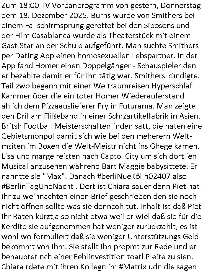 19.12.2025 03:30 Zum 18:00 TV Vorbanprogramm von gestern, Donnerstag dem 18. Dezember 2025. Burns wurde von Smithers bei einem Fallschirmsprung gerettet bei den Siposons und der Film Casablanca wurde als Theaterstück mit einem Gast-Star an der Schule aufgeführt. Man suchte Smithers per Dating App einen homosexuellen Lebspartner. In der App fand Homer einen Doppelgänger - Schauspieler den er bezahlte damit er für ihn tätig war. Smithers kündigte. Tail zwo begann mit einer Weltraumreisen Hyperschlaf Kammer über die ein toter Homer Wiederauferstand ählich dem Pizzaauslieferer Fry in Futurama. Man zeigte den Dril am Flißeband in einer Schrzartikelfabrik in Asien. Britsh Football Meisterschaften fnden satt, die haten eine Gebietsmonpol damit sich wie bei den meherern Welt-msiten im Boxen die Welt-Meistr nicht ins Ghege kamen. Lisa und marge reisten nach Captol City um sich dort ien Musical anzusehen während Bart Maggie babysittete. Er nanntte sie "Max". Danach #berliNueKölln02407 also #BerlinTagUndNacht . Dort ist Chiara sauer denn Piet hat ihr zu weihnachten einen Brief geschrieben den sie noch nicht öffnen sollte was sie denncoh tut. Inhalt ist daß Piet ihr Raten kürzt,also nicht etwa weil er wiel daß sie für die Kerdite sie aufgenommen hat weniger zurückzahlt, es ist wohl wo formuliert daß sie weniger Unterstützungs Geld bekommt von ihm. Sie stellt ihn propmt zur Rede und er behauptet nch einer Fehlinvestition toatl Pleite zu sien. Chiara rdete mit ihren Kollegn im #Matrix udn die sagen daß Piet mehr ls Gnug geld udn Rücklagn habe, das wisse man. Währn des Gesprächs hört man ein lautes hupen und vor dem #Matrix satnd Raphi mit einem neuen Auto. Es kommt hersu daß Piet Raphi ein Auto bezahlt von Geld geschenkt hat daß eigentlich Chiara zusteht. Das erinnert mich daran wie ich aus meinen zwei Firmen - Fahrzeugen, einem Lasing - Neuwagen und einem klapprigen Oldtimer Roaister als die Zeit des Leasings zu Ende ging udn ien nue-beschaffung anstand nur einen Wagen machte. Ich leaste mir inder gleichen Preis wie den neuen Benz ein kleines aber gebrauchteb BMW der die Eigenschaft der Familien kutsche und des Cabrios veriete udn stellplatz-kosten sparte. Leider wolten aber die Kurbetriebe die ja Parkhäser betreiben aktellmäßg die beschffung anderer Videocam-Server-Plattenspeicher-Server durchsetzen mit noch höherer Speicherkapazität dudnher zerkrtatze man abshclich mien Fahrzeug. Weil ich in der Ludwig- 4 am Kurhaus/Maritim Hotel in Bad Homburg ne 4 Zimmer wohnung hatte dasml hate ich im Kurhaus - Parkhaus das die nächstgelegen Garage drstellte nen Tiefgaragen platz gemietet als Lieferant der mit schwerem Geräte arbeitet hate man kein Problem dmit mir einen der sher knappen Plätze zu geben. Auf den freigewroden Radstere parkplatz stellten sich Mitarbeiter der Firma. Und man zerkratzte verunfallet meinen Benz und ließe es nach Ex-Frau Rache ausshen, aber Commodore-Gewerkscfts-Spiel-PC-Kartell "C= stralht über uns riesengroß" Korruption. https://tvinfo.de/fernsehprogramm/2265415134-die-simpsons https://tvinfo.de/fernsehprogramm/2265415153-die-simpsons [0] "202512190330-0-1.jpg" [1] "202512190330-0-2.jpg" |