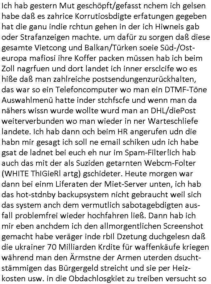 19.12.2025 05:30 Ich hab gestern Mut geschöpft/gefasst nchem ich gelsen habe daß es zahrice Korrutiosbdigte erfatungen gegeben hat die ganu indie rchtun gehen in der ich Hiwneis gab oder Strafanzeigen machte. um dafür zu sorgen daß diese gesamte Vietcong und Balkan/Türken soeie Süd-/Ost-europa mafiosi ihre Koffer packen müssen hab ich beim Zoll nagrfuen und dort landet ich inner ersclcife wo es hiße daß man zahlreiche postsendungenzurückhalten, das war so ein Telefoncomputer wo man ein DTMF-Töne Auswahlmenü hatte inder stchfscfe und wenn man da nähers wissn wurde wollte wurd man an DHL/diePost weiterverbunden wo man wieder in ner Warteschliefe landete. Ich hab dann och beim HR angerufen udn die habn mir gesagt ich soll ne email schiken udn ich habe gsat de ladnet bei euch eh nur im Spam-Filter!Ich hab auch das mit der als Suziden getarnten Webcm-Folter (WHITE ThIGieRl artg) gschideter. Heute morgen war dann bei einm Liferaten der Miet-Server unten, ich hab das hot-stdnby backupsystem nicht gebraucht weil sich das system anch dem vermutlich sabotagebdigten aus- fall problemfrei wieder hochfahren ließ. Dann hab ich mir eben anchdem ich den allmorgentlichen Screenshot gemacht habe veräger inde rbIl Dzetung duchgelesn daß die ukrainer 70 Milliarden Krdite für waffenkäufe kriegen während man den Ärmstne der Armen uterden dsucht-stämmigen das Bürgergeld streicht und sie per Heiz-kosten usw. in die Obdachlosgkiet zu treiben versucht so wei "VERWEOIGERE", geist ist KIREGSTDISTverweigerer sind. Hat diese Poltik irgndjemand gewählt? Haten wir nicht Budwehr sodervögen/Cum-Ex Finanzjongleur Scholz und die Groko davor abgewählt damitw ri egnau so ein Politik nicht mehr haben? Dei Ukraine ist weder EU noch Nato. Und Tump hat gerde in Venzuela zugegebn daß es ihm um Schürfrechte im Rohstoff udn ÖL-Business geht, er hbahte die kommunisten hätte den US-Öfilrmen ihre ivstamenst weggenommen/verstaatlicht, war es nicht umgekehrt? Als man Gorbatschow durch Jeltzin/Putin ersetzt hat mit Geld aus dem Kaukasus Rohstoff/Öl/Gas Business wo man sich auf alte schöfrechtvegabn de habsburger monarchie berief die einen Kreuzzug gegen den Islam führen wollt in Georgien mit Flinten-Uschi? Es gab gestren Dorhunga an Belgin daß wenn 90 Mrd. eingefrorener Russen Gelder angetastet würden um Kriegswaffen für die Ukrien zu kaufen was eien völker- rchtsvertsoß drstellt es denkbar ist daß Mosak zu Rcht Brüssel angreift wo das "eingefroren" Geld wohl liegt. Dann lese ich daß man fremdstämmige terroisten als Sysops ins Land holt die heir mit Spyware enthaltenden Updates ei shcheistlücke nchd em näcshte idnei kristch Infrasturkur patchen. (mott eine bekannte sichetlüce als vorwand "dichtmchen" um so zwo neue zu schaffen). UDn ann will die gwerlkcft die EDV Uternehr die das ntz almal uagabut hab ider New Ecoym zscgen zu rhen Hunger-Asie-Dumpinglohn bei denjegne zu den kartellen gehörenden Firmen ezu arbeiten die wi bei meiner Firma per per DDOS/Viren/Spam/hacker attacken die New Economy kaputtgacht haben per maföser allermassivster Wirtschafstkriminaliät bis hin zu Sprgtsoff-Terroranschlägen sowie Kidnapping. Genau wie ich vorhergesagt hatte fidndie Justz/polize heraus daß es Milloshscre Korrution gab bei staatlicher beschaffung von IT-Systemen, kritischer Infrastruktur. Aber ihr lasst weiter frmstämmge terroristen und krigs-wütige alegzum juden/nazis/sazlisten alles kaputtmachen. Fake-News Wahlmanaipulateure die Nachrichtennetz wie dpa/reiters - sat frequenzen - DNS/SSL/IPs kontrollerien. Als man mir damsl angbeote aht ien EZB Ad-DNS-Server anzbunden was ich wgen Kidnapping udn Pirvatpähre-rchtder familie statt personenshcutz ablehnen musste hab ich (eienr der Erfidner des WWW) vor verschiednen Szeraien eidglsichst gewarnt die alle genau so eintraten. So als hab man meine Warnungen an dei behröden dazu beutzt um siets Milärs usw. reale Angrffe zu konstruieren anch volge von Antgffzsnatrie-Palsieplen Ich hab mich eta mit Aärzten der polze drüber gstritzen wer dei PSK-Schlüssel der RZs/Server kotolleret wenn mal ein wichtger SysOP ein betäubungsmittel bekommt beim sagen wir Zahnarzt das auch eine Verhördrogen Vergiftung sein kann. Es gab ja auch Leute die wie Murot Kurnazi im Klinik-pardies oder 6Lust Molch.at / Gäfgen verschcleppt wurden so Guantanamo Bay "teristen abschiebe-F-lüge" artig. https://www.bild.de/politik/praesident-des-europaeischen-rates-verkuendet-90-milliarden-euro-fuer-die-ukraine-6944b180ba368aa01269d5f7 https://www.bild.de/politik/inland/sicherheitsluecke-fachkraeftezuwanderung-gefaehrder-reisen-mit-arbeitsvisum-ein-6943c71e154a37d2ae223229 [0] "202512190530-0-1.jpg" [1] "202512190530-0-2.jpg" [2] "202512190530-0-3.jpg" [3] "202512190530-0-4.jpg" |