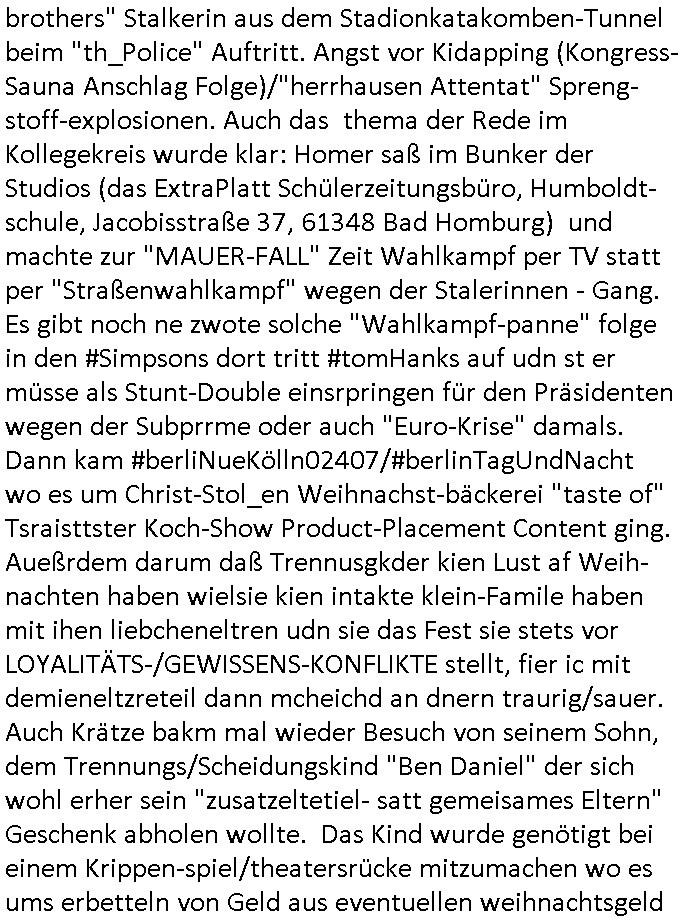 20.12.2025 02:30 Nun zum 18:00 Uhr TV - Vorabendprogramm von gestern, Freitag dem 19. Dezember 2025. Als ich fertig war damit zu versuchen meine Eltern zu informieren daß mir mal wieder zähne aus dem Mund brechen weil Zahnärzte mit ihren Komplizen bei Krakenkassen und wiederum deren Komplizen bei Jobcntren absichtlich gepfuscht haben udn den Fernsher einschaltete sah man gerade wie Homer in einem Junkie Viertel aufräumte zusammen mit Nachbar Ned Flanders und dafür von der Kirchengemeide belohnt wurde mit einer Reise zum Grand Canyon. Auf dem weg dorthin gab es eine Szene mit einer Bären - Parkplatz erleichterung. Im Grand Canyon stiß man auf ein film-team das man angelich ausplünderte. Gabes da nicht ahc mle ien szen wo die #simpsons bei eienr "scripted Reality" serie mit-machen in einem Hotel am Flughafen und zu früh aus-scheiden wo sie leben müssn wie zur jahrhundert-wende? Dann ging es passend zur 90 Mrd Spende für Waffen an die Ukraine aus eigefrorenem russischen Staatsvermögen (Oligarchen Yachten, Steuer-/Kapitalfucht Zaren-familie) um aserviertes Geld daß sich Chief "Spearmdtin" #wieGum-P aus der Beute krimineller ruabzüge in die eigene Tasche steckte (siehe dazu auch MEINE Idee zu #aSeriousFlanders im Stile eines Tarantino Films). Homer sollte ein Rede halten und hatte angeblich lampenfiber,d as ist fsch, richtg ist daß Burns der ja imer alles von seinen Ghostwerter-Anwälte schreiben lässt (siehe mikeGross #Suits) ihm sein Rede-manuskript stahl (per EDV-hack wie Frau C**kovic Inhate küftegr simposn folgen aus mien Blog das sie unerlaubterweise pseudononyosuiert nchdem sie dch ien medikanetn-ver-giftung dertwgen ich nicht mer shciben kann ordlche erricht hat daß man mir eine Sekrtäterin bezahlt damt mien aussge fürs gericht ditrert werdnekanndwobe sie aber das Diktat sinetsletend verfälscht und mienPost abfängt?) Es entstand der Mythos Hoemr hab angst ien rde zu haten "ANST IM DUKLEN ZU REDEN" (stimmt nicht, ich erinnere mal als Gewebis epximrnt an die as der Stehgreif Reden die wir im BWL Studium proben sollten oder fats imemr gut bewertete Refate von mir in der Schule). Ich glaube da gings eher darum einem von der Balkan- Geburtstags-clown-Mafia (siehe Vater Kur-Einstellungs-Gesundheitscheck musterung "Suizid" Film #theGame/#fullDisclosure mit Michael Douglas) nen Impro-Comedy "Caching Beratervertrag" zu geben von dieser "U-Bahn Kontrollöre" a-cappella Sychornsprcher Kidnapper Mafia um Matthias Keller vom Kinder-fernsehen. Homer sollte als "open microphone / Spke word" veranstaltung "Stslsistch hsuporzess gerichts-poesie" Stand-Up Comedian lernen auf Bühnen vor großem Publikum zu sprechen. Ich gabe es gibt da ganz andere Gründe für sie anst vor ien Auftitt, einfach mal an "Monika Lewinsky" alias "vera Zanner (geb. Berger)/Kita-heirat Ehefrau Tina Kreuzer" denken siehe diese "Blues brothers" Stalkerin aus dem Stadionkatakomben-Tunnel beim "th_Police" Auftritt. Angst vor Kidapping (Kongress-Sauna Anschlag Folge)/"herrhausen Attentat" Spreng-stoff-explosionen. Auch das thema der Rede im Kollegekreis wurde klar: Homer saß im Bunker der Studios (das ExtraPlatt Schülerzeitungsbüro, Humboldt-schule, Jacobisstraße 37, 61348 Bad Homburg) und machte zur "MAUER-FALL" Zeit Wahlkampf per TV statt per "Straßenwahlkampf" wegen der Stalerinnen - Gang. Es gibt noch ne zwote solche "Wahlkampf-panne" folge in den #Simpsons dort tritt #tomHanks auf udn st er müsse als Stunt-Double einsrpringen für den Präsidenten wegen der Subprrme oder auch "Euro-Krise" damals. Dann kam #berliNueKölln02407/#berlinTagUndNacht wo es um Christ-Stol_en Weihnachst-bäckerei "taste of" Tsraisttster Koch-Show Product-Placement Content ging. Aueßrdem darum daß Trennusgkder kien Lust af Weih-nachten haben wielsie kien intakte klein-Famile haben mit ihen liebcheneltren udn sie das Fest sie stets vor LOYALITÄTS-/GEWISSENS-KONFLIKTE stellt, fier ic mit demieneltzreteil dann mcheichd an dnern traurig/sauer. Auch Krätze bakm mal wieder Besuch von seinem Sohn, dem Trennungs/Scheidungskind "Ben Daniel" der sich wohl erher sein "zusatzeltetiel- satt gemeisames Eltern" Geschenk abholen wollte. Das Kind wurde genötigt bei einem Krippen-spiel/theatersrücke mitzumachen wo es ums erbetteln von Geld aus eventuellen weihnachtsgeld zahlungen ging, man spielte was christams Carol artiges mit Scrooge als anspielung auf den "herzlosen Piet" der (sind forschung und lehre nicht frei) sich weigerte chiara Studiendarlehen zu finanzieren asuden sich Lehrer wie Schul-Direktor Oliver oder Asia-Yanni dann ihre Löhne /Gehälter (vgl. [deutsch] arbeits-lohn und [englisch] loan (lehen) für Kredit-finanzierung) bezahlen. Siehe dazu das thema Abrtgeber-verband-Kita udn gewrkschafts-fuktionäre bettelie bis hin zu Morden/Attentaten durch linke gewerkschaftler ('siet # tagen gefangr der roten...') Nicht nur der herzlose Piet wird gemobbt, auch die herz-lose Milla ferte liebr im #Matrix als ohne ihre Familie. was wurde mal bsgehen von Tochter Amelie mit ihren Adoptiv-Pflege-Eltern aus lovern wie dubai-tom oder dem infertilen (zeugungsunfähigen) uganda-basti, dieses Asien Kinder-/Adoptionshandel/Leihmutterschaft Thema uAbsatmmung das auch beiden #simpsons vorkommt? Jedenfall drehte man in einer Sepia-Filter-Optik Blder dei aussahen asl stammten diese direkt vom Titlbalte von "der Wachturm" diesem "zeugen Jhoovers" magazin das in Fußgägerzone feilgeboten wird ben dem "kostelosen Kuran" von der "lies!" (tell me lies, tell me sweet little lies) Stiftung (bilder davon "aria free zone" im Blog, sihe das thema "vaterlose Einelternfamilie" dank unbefleckte empfängnis in der christ-lichen weihnachtsgeschichte, rolle der frau in der katholschen Kiche (unerwünscht)). Es gab zu den schönen Nikolausroten-Morgenmantel tahreafführungs Bildern von "christmas carol" Hausboot Weihnachtsfeier "jealousy" Bilder vom herzlosen Piet und Raphi ud Milla die alleine im Büro Chpagnerparty feierte. Schul-Direktor Oli hatte ein WG - W
