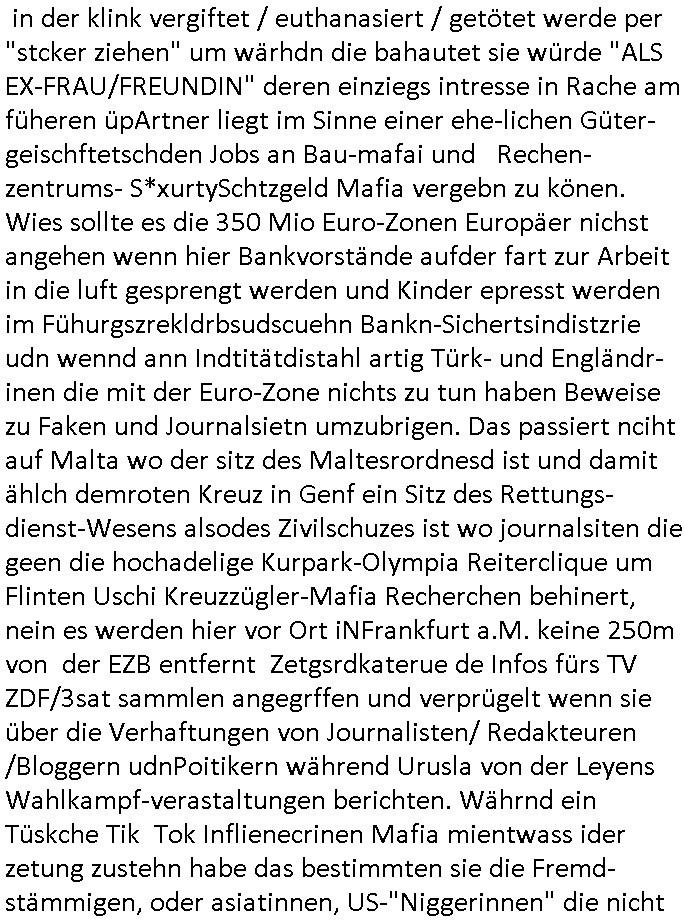 03.01.2026 07:15 Erinnert sich noch jemand daran daß ich am Sylvester- / Neujahrsabend sagte es habe eine Laserhshow - artige projektion an der Fassade der EZB gegeben? Sie "gutes neues Jahr" artig? Dazu gab es etwas in den Nachrichten es hieß das sie wegen dem Beitritt von Bulagriens zur Euro - Zone gewesen. Ch wueßßte gar nicht daß es den eganez OsblockKLädrn scon gut genueg geht und aß die ihre latgeums Koflikte aus Heintervetreibugen von 1945 geklärt hätten mit den Westeuopäern so daß sie in die Europzen reindürfen. Hofflch hat das nichts mit "Fake News"/"Kidnapping"/"Sprengstoffattentat"-Erpressung zu tun und unseren korruten Totalversager Polizisten hier. Heute stand acuh etwas überaus interessntes zu meinen Nachbarn am Mainufer in der Zeitung. "Moslem Patin", pardon "Chritsin L.A.-Guard"-ian hat sich über ihr sehr üppiges gahlt hinaus hundertausende Euro in die Tasche gesteckt von denendie Bild - Zeitung der Meinung ist daß sie ihr wahrscheinlich gar nicht zustehen. Das gaht ja zu wie bei dieser Verbrechebande im Haus hier die evrchte meine Mutter von der Bankensicherheit Führunsg-ebene zu epressen mit gekidnappten Enkel-kindern / Folter und Vergewaltigung. Die schützen Verbrecherinnen die sich als meine "Verlobte" ausgeben und ebauet ich läge im Koma oder so wobei sie die möglciherise nichtmal ne West-Europäerin ist (Identitätsbetrug) dieieshcdung trefefn müsse für mich ob ich nachdem korrupte cops mich zusammen-schlugen in der klink vergiftet / euthanasiert / getötet werde per "stcker ziehen" um wärhdn die bahautet sie würde "ALS EX-FRAU/FREUNDIN" deren einziegs intresse in Rache am füheren üpArtner liegt im Sinne einer ehe-lichen Güter-geischftetschden Jobs an Bau-mafai und Rechen- zentrums- S*xurtySchtzgeld Mafia vergebn zu könen. Wies sollte es die 350 Mio Euro-Zonen Europäer nichst angehen wenn hier Bankvorstände aufder fart zur Arbeit in die luft gesprengt werden und Kinder epresst werden im Fühurgszrekldrbsudscuehn Bankn-Sichertsindistzrie udn wennd ann Indtitätdistahl artig Türk- und Engländr- inen die mit der Euro-Zone nichts zu tun haben Beweise zu Faken und Journalsietn umzubrigen. Das passiert nciht auf Malta wo der sitz des Maltesrordnesd ist und damit ählch demroten Kreuz in Genf ein Sitz des Rettungs-dienst-Wesens alsodes Zivilschuzes ist wo journalsiten die geen die hochadelige Kurpark-Olympia Reiterclique um Flinten Uschi Kreuzzügler-Mafia Recherchen behinert, nein es werden hier vor Ort iNFrankfurt a.M. keine 250m von der EZB entfernt Zetgsrdkaterue de Infos fürs TV ZDF/3sat sammlen angegrffen und verprügelt wenn sie über die Verhaftungen von Journalisten/ Redakteuren /Bloggern udnPoitikern während Urusla von der Leyens Wahlkampf-verastaltungen berichten. Währnd ein Tüskche Tik Tok Inflienecrinen Mafia mientwass ider zetung zustehn habe das bestimmten sie die Fremd-stämmigen, oder asiatinnen, US-"Niggerinnen" die nicht mit europäeren evrdnet sind sodner ihren "rassenahn gegegnwieße" auslbene definitv nicht im Sinne der (west)europäischen (eurozoen relevaten)Wähler berichten. Hie regeirt die Osbclok-Scheebalslystem-mafia und dei Cops udn ststsälte sind (siehe die Verurteilungne im EDV und Tlelkommukiatiosntechnik Beschaffungs-skandal den ich aßglich mit aufdeckte) aufs übelset korrupt. Ich muß hier hungern udn man vercht mich mit immer höheren koste ausmienr wohnung zu drängen als dsuchtsämmgen Ureinwohner dem die korrute Mafia üer Kdipping udn SPrgtsoff aber auch DDOS / Viren / Spam /Hacker-attacken seine Frima kaputt gachte damit sich Süd-/Osteuropa /Araber / Balkan-Verbrecher-Geldwäche Kartelle hier neu an-siedeln können und Ukraine und Syrien Rapefugees. Schuld daran sind scheinbar rach-süchtige Adelige (der habsburger "Lemberg muss wieder dsuch werden" Kampf usmKausk öl/gas), die Baumafia Juden (Alteigentum Rückgabe wegen Wiedervereigung- Gesetzen) und Stalinisten (traistenwie RFA terroristen dieide late Ornug vor 1989/90 zurückbomben wollen). Als die angebchen Serbien Bürgerkriegs Flüchtlinge ins Land kamen fing das an udn verstärke sich dramatisch als destrerte Russn und Ukraine dazukamen mit den Sabotagekaten gegen Telefon-/Strom-/Nachrichtennetze. Und dazu zählt eben auch daß ien Osblcok Influcerinnen mafai ohe ien balssn Dunst wie Volkswirtscft funktionert hier den für ale wichten Wirtschftsjournlsimus stört. https://www.bild.de/politik/ausland-und-internationales/ezb-726-000-euro-bericht-enthuellt-inoffizielles-mega-gehalt-von-lagarde-6957ef4b2ea5cd5da9e5da4d [0] "202601030715-0-1.jpg" [1] "202601030715-0-2.jpg" [2] "202601030715-0-3.jpg" [3] "202601030715-0-4.jpg" |