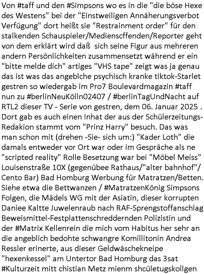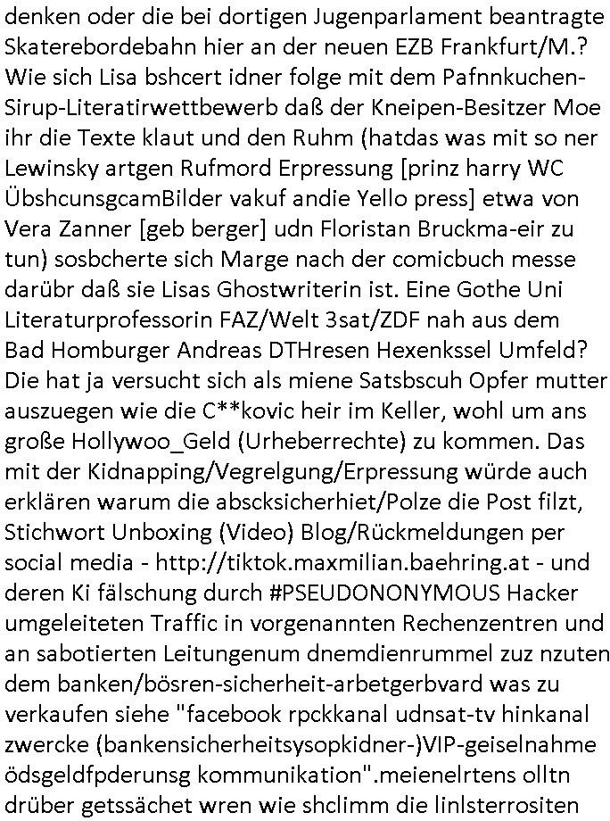 07.01.2026 00:45 Nun zum 18:00 Uhr TV Vorbandprogramm vom gestrigen Dienstag den 06. Januar 2026. Bei den #Simpsons lief ne Folge aus der Zeit der Hexerei und des Feudalismus. Lisa lernte zaubern, um geld für eine medizinsche behandlug von Marges Mutter zu bekommen lernte sie aus Erz/Blei [ versteckte Anspielung auf den METALLGESELLSCHAFT Öloptionen-Skandal? ] Gold/Geld zu machen. So wie ich hatte die Großmuter Erfrierungen an den Händen nach- dem sie sich mit der süd-Osteuropa (smboliserte druch einen Graf Dracula) Drückerolonnen? Mafia eingelassen hatte (war da nicht irgendwas mit Koste für ein Musical?) Es gab "König der Löwen" Musical-Charaktere die mich daran erinerten wie "Michael Jackson" in Berlin Babys von Balkone werfen wollte bevor er wegen Straftaten die sich gegen Kinder richten verurteilt wurde (könnte es da um Kidnapping gehen?). Zudem einen "Dragonheart" (Waren Dragoner nicht eine Balkan oder Süd-/Osteruopa Militär-reiter?-Einheit?) [dieser Film über die Schutzgeld-erpressung] Rachedrachen den man nur durch Menschen- opfer besänftigen konnte. Lisa konner aber nur Geld/Gold machen und Hislstein-Amulette verkaufen solang dieser Drache Feuer speite (ein Anspielung auf die Rüstungs- und Pflegemafia/Prothesen für Kriegskrüppel-Industrie?). Es ging um "Fields of Gold?" Ähren-/Ehren(-grab)-felder. In Teil zwo ging wurde Lisa zu ner Therapeutin geschickt an einer Uni Klinik asl Versuchskarnickel. Die Frau hatte sich schwägnern lassen udn bekam daher ihr Studium nicht fertig wie männliche Kollegen die nch von ienr quitergelung pfiteren aber mher von ihrer Lebesarbeits- zet der Geminschaft anstatt Kindererziehung widmen, be den sind Studienfädergelder des Staats also besser auf-gehoben. Die frau wollte das Scheidungsopfer Lisa ein THERAPIETAGEBUCH schreibt/malt per Kunst-Therapie. Die weblcehs shcidgsopfer Lisa selbt konnte aber nicht geut zeichen udn so zeichnete ihre Mutter Marge für sie. Duch "FrdichDrünerremmat Die pyhsiker" zufall(?) geriet das therapietagebuch der "#STRUWWELPETER" Klinik ähnloch Krankengschichtenfilem ForrestGump/Phildphia in die Hände einer Frau einer Firma die Cartoons/Comics "Hollywoo_Storyboards" alsbuch rausbrachte/verfilmte?Der comic "SAD GIRL" traf ählcih wie "ANGRY DAD" von Bart einen Nerv beim Publikum. Gabs nicht mal ne 3sat #Kultrzeit Sendung zu Kunstherapie (für Scheidungskinder die seelsich an elterlichen Ehe-Probelemen zerbrechen)? Mal die TV-Redakion vom Schüelrztusgkollegen Christian Metz fragen. Im Comic ging es umdas (weg)werfen von Essen (Schulbrote wiel Konsumtertor und Gruppedruck Mobbing ausgesetzte Kinder lieber Süßgkeiten aus dem Riegel7 hausmeister Kiosk-Automaten klauen - Dessert essen bevor es den hauptgang gab? -hab Psychologie Studenten der Uni nicht auf meine Schülerzeitungs und Judperlemenst anregung hin dazu geforscht?). Die Frau die das Comic evrlegetw ar eine Asiatin (ne Thailänderin wie aus der Schweizer Schule Bangkok: FUTUR(e)RAMA die Kita-VPIP-Heirat Bad Homburger Kurpark Poloturnier Olympia Reiterclique Hochadelige Prinz-Harry Bekannte mit dieser "Henrietta R Hippo" Krone?) Jedenfalls wurde das Ding ein Verkaufsschlager (lag wohl daran daß man in Asien billig Zeichnen konnte und den von seinen Bongo Einohrhasen-( nicht zu verwechsen mit #veriVox )-Comic Büchern (life/work/school/...is hell) bekannten udn idn Europa (Supps uchaldung abd Homburg) vor dem Durch-bruchs tehdne KARRIKATURsiten #MattGroening enga-gierte, war das wohl gesponsort hat? Die YVANEHTNIOJ Bundespräsident/Staatsbesuch-vergewaltigungs Marine? Die Kinder in Hafen-Rotlichtviertel locken sollte für die Paparazzi (siehe Marge meldet Homer bei dieseer MTV Fegdhe Show an). Ehemann in den scheinbaren Rufmord hetzen um mittels dem WITWENSTEIN-Verlobusgringe (siehe das thema SSL-Smart/PGP/Key-"Ringe der Macht") an dessen Familenvöregn zu komen (urheberrechte usw.) Wir eirnnenr uns:VIP Winter-Olympia-Medaille/ Luftwaffe Taufpaten Engelhardt / Engelbart Ver-wechslung wegen der von apapahtebe/Legasthiearitgen Kita Bettel-Kinder ausgespähten Tauf-urkunde? Erpssung von Promis durch Pparazzi/Groupies udn Abwehr-mßnahmn von S*xuritys? ( siehe 380 C 478/21 Amts-gericht Frankfurt/M. Höchst ) Der Mann der Verlegerin hate ien falbe für "cast away mit tom hanks" artgen "Unboxing videos", scheinbar kam des öfteren bei der Post etwas weg. (siehe dazu übrigens den neuen 1984- Cam lieferkitte LIDL TV-Spot). Wir iernnernusn miene Kiat hritae stalkeriu hate mir die Bundeswehr auf den hals gehetzt wiel es irh mit der erb-schaftnahcdeme manmcih umgebracht hätte per angeb-lichmManöverufall nicht schnell genug gehen konnte. Es gab auch eine Comic-Buch-Messe wie die aus diesem LEIPZIG #tatort Krimi mit dieseer entführten Kellergeisel. Möglicherweise hat das mit den Einohr-#verivox-hasen von der bausparaksse ("Scha_f sagt das kind und zeigt auf den hund" wieß ZDF Autorn / EU abgordte Sybille Berg) Etwa mit Sicherheits-fragen zu tun die Identitätsdiebe / Kidnapper di es auf große evröge abgesehen haben nicht kennen (wir ierniern us:so frag an die eltern ählich wie heißt diese oder jenes Puppenspeilzeug) THE BRITEN WILL NOT TSOP US... THEY'LL FIND "IAEO -El BARADAI" was amchte Homer nochmal beruflich, Atominspektion? Doch nicht etwa in der Tshernobyl-Sarkophag Ukraine? Da würd je ekrlären warum das WWW-schülerzeitungs-netz "Ärte gegen atomkrieg" ptzieteakte enthalten sollte auch aus Japan (wer investiert nochmal am DeCIX hier in der hanauer-land- Frankfurt - NTT Docomo aus Japan)? Gab es zum Tham YANEHTNIOJ / jCloud - DRM Musik nicht mal mindestens eine Folge wo RZ - S*xuritys der Firma von Homers Chef etwas verkaufen wollten mit Südsee- Urlaubsreisen und Fahrad(alden)-Sponsoring? Warum muß ich immer nur an dei #weddingplanermafia rings um den "SNOW AND BIKE ACTION Bad Homburg" denken oder die bei dortigen Jugenparlament beantragte Skaterebordebahn hier an der neuen EZB Frankfurt/M.? Wie sich Lisa bshcert idner folge mit dem Pafn