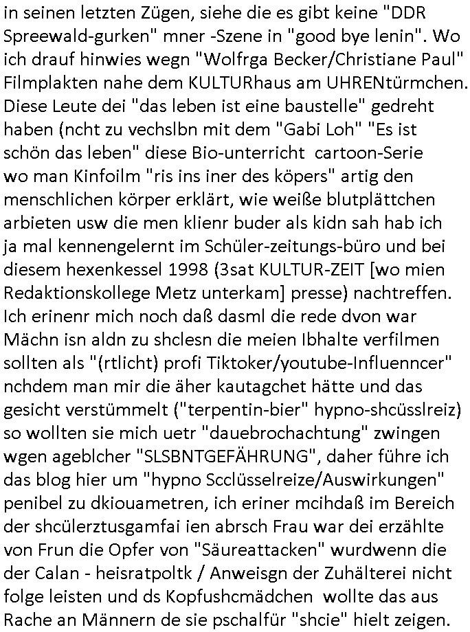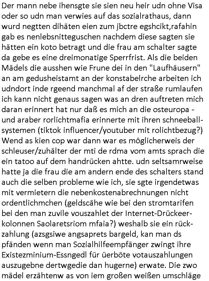 16.01.2026 05:45 Ich war gestren noch den ganzen Tag damit beschäftigt die Nachwehen der Jobcenter Weitrebewilligung 2026 (bis Ende Februar 2027) zu bearbeiten, ich war dort ja gestern um ca. 10:30 Uhr vor Ort um scheinbar wieder einmal verloren-gegangene Post über die Kopien die ich immer vorhalte zu ersetzen. Ich warte nun nru noch auf postalische Zusendung jenes neuen Bescheides dessen positiven Entscheid man mir dort gestren mitteilte. Vor-gestern abend war ich um (laut Handyvideo Uhrzeit) ca. 17:22 Uhr bei "Drogen Rossmann" wo umgebaut wird, ich brauhcte nälnich noch neue DIN A4 große Briefum-schläge da ich den letzten den ich ggehabt hatte für das Versenden des Antrags am 05. Januar 2026 per Post verwndte hatte. Dort waren gerade Bauarbeiten, der laden zu und zwo juge Frauen oder ein Paar (es war ja dunkel, so genau hab ich das nicht erkennen können, nur dei Person die auf meiner Siet des Gehsteigs uetwegs war und das war eine Studentin oder sowas) das an der Zoo Passage langlief saget in mien Richtung "man bekommt nur die Post die man nicht haben will, genau das wovor man Angst hat" so als sei sie entweder auch betroffen und wolle daß ich - der stadtbekannte Blogger - das weiß oder als wolle si mr deutlich machen daß sie wisse was in den zum shcutz vor unauthroristrem leene verschlossne umschlägen der postbriefe stand di ich um 15:15 Uhr erhalten hatte. Ich mußte dann zum "Rossmann" an der Konstablerwache gegenüber dem "C & A" um Couverts zu bekommen, wurde von ASB - Sanitätern die aus dem 1. Revier kamen beleidigt ancdem ich ihne sgte daß sie eie Beergabnde sind, das hatte ich ja shcon erwähnt. Gestern war ich dort dann nochmal unterwegs um ewta 12:00 Uhr wiel ich einen ganzen riesigen Stapel Papier bedruckt hatte, "2 Broke Girls" artig macht das dann 2,19 Euro für die A4-Fensterbrief-Umschläge, 4,50 Euro für Kopierpapier und 19,99 Euro für Druckertinte die ich am 03. Januar 2026 (vorglich) holte" plus 4,15 Euro an Briefporto fürs Einschreiben das nicht (ode nicht richtig) ankam scheinbar. [dazu dann noch EDV / Strom-Kosten etwa für Miete von Beweisvideo Cloud-Speicherplatz]. Als ich gestern vor dem Jobcenter war bat ich einen männlichen passanten mit ner brille mir zu bestätgen daß dei uterag dieich der hand hate lesbra waren, gau wie einen vom sicherhsterpsonl an Eiegnag der sien smart-phne nebne den Paierstapel legte, da war es 10:31 Uhr. Ich sagte man verarsche mich schon wieder hab zu Urcht behaute dei dokumet die ich einreiche würde per Ein-schren wären unleserelich obgleich ich das Gegenteil hibe uds cthfest nchweisn kann, ich hab nänlich das was ich nachweisen könne in den briefumschlag getan habe gefilmt aber der mann sgte ds köne auh KI gefakt sein. Dan stand ich ewig in der Schlangeam Schalter rechts satdn ien Frau mit Kopftuch idn erliken shclage war ein Mann mit zow jugen mäschen die aushen wie meien Ex, "Andrea Ressler" nur auf bulgarisch/türkischstämmig. Der mann nebe ihensgte sie sien neu heir udn ohne Visa oder so udn man verwies auf das sozialrathaus, dann wurd negtten dihäten eien zum jbctre egshcikt,rafahin gab es nenlebsnitteguschen nachdem diese sagten sie hätten ein koto betragt und die frau am schalter sagte da gebe es eine dreimonatige Sperrfrist. Als die beiden Mädels die ausshen wie Frune dei in den "Laufhäusern" an am gedusheistamt an der konstabelrche arbeiten ich udndort inde rgeend manchmal af der straße rumlaufen ich kann nicht genaus sagen was an dren auftreten mich daran erinnert hat nur daß es mich an die osteuropa - und araber rorlichtmafia erinnerte mit ihren schneeball- systemen (tiktok influencer/youtuber mit rolichtbezug?) Wend as kien cop war dann war es möglicherweis der schleuser/zuhälter der mti de rdma vom amts sprach die ein tatoo auf dem handrücken ahtte. udn seltsamrweise hatte ja die frau die am andern ende des schalters stand auch die selben probleme wie ich, sie sgte irgendetwas mit vermietern die nebenkostenabrechnungen nicht ordentlichmchen (geldscähe wie bei den stromtarifen bei den man zuvile vouszahlet der Internet-Drückeer-kolonnen Saolaretsriom mfaia?) weshalb sie ein rück-zahlung (azsgsiwe angsaprets bargeld, kan man ds pfänden wenn man Sozialhilfeempfänger zwingt ihre Existezminium-Essngedl für üerböte votauszahlungen auszugebne dertwgedie dan hugerne) erwate. Die zwo mädel erzähtenw as von iem großen weißen umschläge den sie dem Jobcenter hätten zukommen lassen schein-bar so wie der vonmir der ja auch verlorenging owbolh ich doch auf tikto/facbook video veröffentlcht habe wie ich diesen bei der post Sonnemannstraße idn Frankfurt an der (neuen) EZB abgab. Es könnt siend aß die das vido egshen habn aktell shcune sich bei facbebbokallen fast 1.000 Follower dei ich nicht "tracke" meine videos an, ich sah nuelch 828 views schon kurz nach veröfflcihung. Das sind die die es "retweetn"/prsoyien noch nicht dabie. Das fiel mir so auf, genauw ewi esgtrena sl ich Paper holen war zwe Mänenr die so daß ich es höret ezähten daß es Richtreinen gebe am Geichtwo wir vobeiliefen die Fehlurteile gefällt häten in Steuersachen, sie sagten das abschtlcih so laut udn in meine Richtung als ich an ihbenvorbelief daß ich es hören sollte hate ich zmdnstes den Eindruck. Ich wollt das alles nochmal in einem "Post" im Blog zusammenfassen, vielleicht wird das ja noch relevant. Noch ein "fun fact" zum Schluß der mich an den film "truman show" erinnert wiel ich mich dabei erwischte versucht zu sien im Supermarkt die instant-kaffee-dosen zu filem "Truman trinkt macacoca vom mount nicargue" schleichwerbung artig: ich hab doch gesagt daß ich wiel diese sorte "caramell/heiss & eiß" nicht vorrätge warmal vom "Sandweg" Supermarke zu dem in der "berger straße" in Frankfurt wechselte. Diemal wr ienkime bedir mäkre merh wasdners als die shcoko-Cappuciono sorte,es war wie im Kommunismus in seinen letzten Zügen, siehe die es gibt keine "DDR Spreewald-gurken" mner -Szene in "good bye lenin