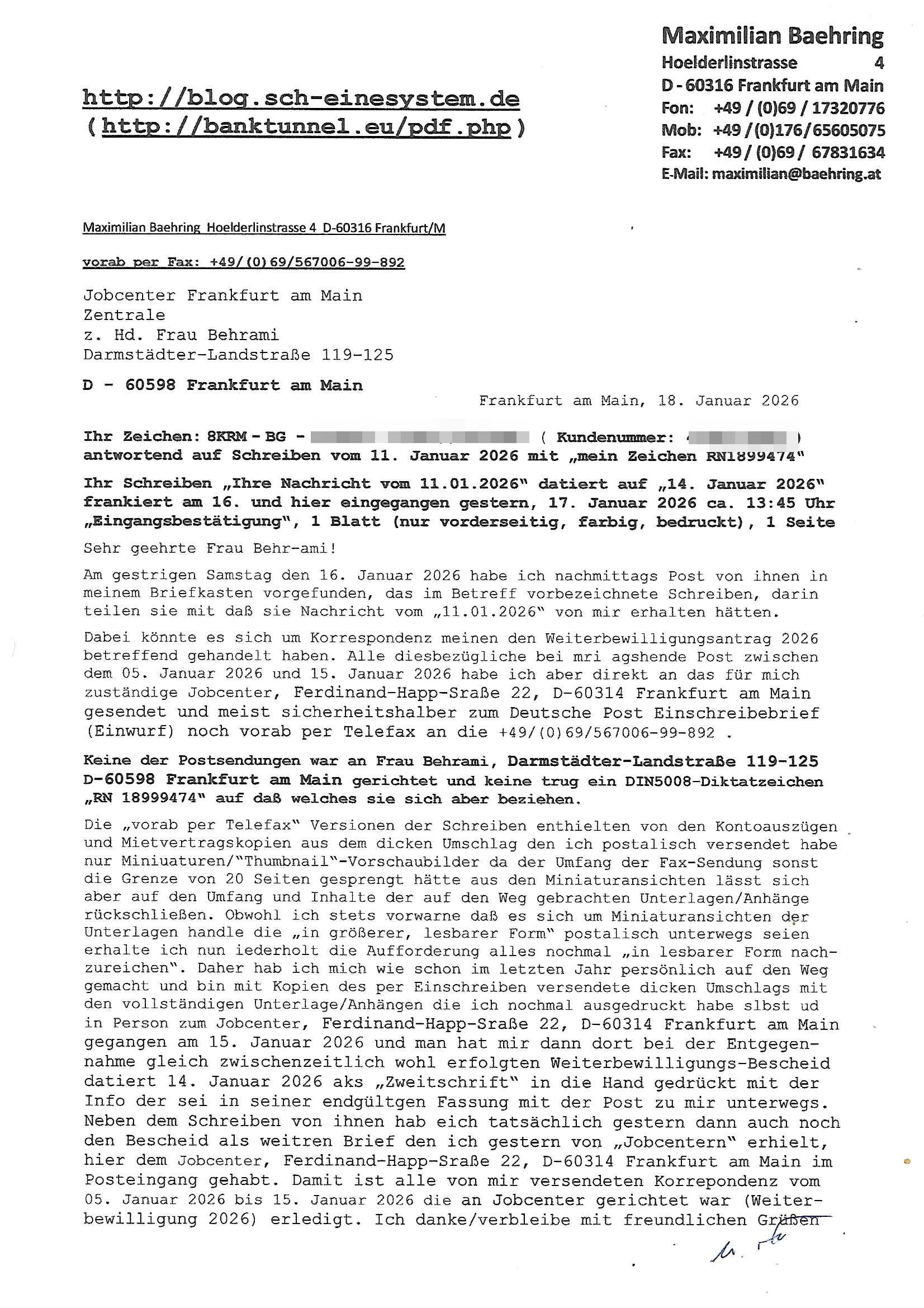 18.01.2026 08:15 http://blog.sch-einesystem.de ( http://banktunnel.eu/pdf.php ) Maximilian Baehring Hoelderlinstrasse 4 D-60316 Frankfurt/M vorab per Fax: +49/(0)69/567006-99-892 Jobcenter Frankfurt am Main Zentrale z. Hd. Frau Behrami Darmstädter-Landstraße 119-125 D - 60598 Frankfurt am Main Frankfurt am Main, 18. Januar 2026 Ihr Zeichen: 8KRM - BG - Nummer: *** ( Kundenummer: *** ) antwortend auf Schreiben vom 11. Januar 2026 mit „mein Zeichen RN1899474“ Ihr Schreiben „Ihre Nachricht vom 11.01.2026“ datiert auf „14. Januar 2026“ frankiert am 16. und hier eingegangen gestern, 17. Januar 2026 ca. 13:45 Uhr „Eingangsbestätigung“, 1 Blatt (nur vorderseitig, farbig, bedruckt), 1 Seite Sehr geehrte Frau Behr-ami! Am gestrigen Samstag den 16. Januar 2026 habe ich nachmittags Post von ihnen in meinem Briefkasten vorgefunden, das im Betreff vorbezeichnete Schreiben, darin teilen sie mit daß sie Nachricht vom „11.01.2026“ von mir erhalten hätten. Dabei könnte es sich um Korrespondenz meinen den Weiterbewilligungsantrag 2026 betreffend gehandelt haben. Alle diesbezügliche bei mri agshende Post zwischen dem 05. Januar 2026 und 15. Januar 2026 habe ich aber direkt an das für mich zuständige Jobcenter, Ferdinand-Happ-Sraße 22, D-60314 Frankfurt am Main gesendet und meist sicherheitshalber zum Deutsche Post Einschreibebrief (Einwurf) noch vorab per Telefax an die +49/(0)69/567006-99-892 . Keine der Postsendungen war an Frau Behrami, Darmstädter-Landstraße 119-125 D-60598 Frankfurt am Main gerichtet und keine trug ein DIN5008-Diktatzeichen „RN 18999474“ auf daß welches sie sich aber beziehen. Die „vorab per Telefax“ Versionen der Schreiben enthielten von den Kontoauszügen und Mietvertragskopien aus dem dicken Umschlag den ich postalisch versendet habe nur Miniuaturen/“Thumbnail“-Vorschaubilder da der Umfang der Fax-Sendung sonst die Grenze von 20 Seiten gesprengt hätte aus den Miniaturansichten lässt sich aber auf den Umfang und Inhalte der auf den Weg gebrachten Unterlagen/Anhänge rückschließen. Obwohl ich stets vorwarne daß es sich um Miniaturansichten der Unterlagen handle die „in größerer, lesbarer Form“ postalisch unterwegs seien erhalte ich nun iederholt die Aufforderung alles nochmal „in lesbarer Form nach-zureichen“. Daher hab ich mich wie schon im letzten Jahr persönlich auf den Weg gemacht und bin mit Kopien des per Einschreiben versendete dicken Umschlags mit den vollständigen Unterlage/Anhängen die ich nochmal ausgedruckt habe slbst ud in Person zum Jobcenter, Ferdinand-Happ-Sraße 22, D-60314 Frankfurt am Main gegangen am 15. Januar 2026 und man hat mir dann dort bei der Entgegen-nahme gleich zwischenzeitlich wohl erfolgten Weiterbewilligungs-Bescheid datiert 14. Januar 2026 aks „Zweitschrift“ in die Hand gedrückt mit der Info der sei in seiner endgültgen Fassung mit der Post zu mir unterwegs. Neben dem Schreiben von ihnen hab eich tatsächlich gestern dann auch noch den Bescheid als weitren Brief den ich gestern von „Jobcentern“ erhielt, hier dem Jobcenter, Ferdinand-Happ-Sraße 22, D-60314 Frankfurt am Main im Posteingang gehabt. Damit ist alle von mir versendeten Korrepondenz vom 05. Januar 2026 bis 15. Januar 2026 die an Jobcenter gerichtet war (Weiter-bewilligung 2026) erledigt. Ich danke/verbleibe mit freundlichen Grüßen [0] "202601180815-0-1.jpg" |