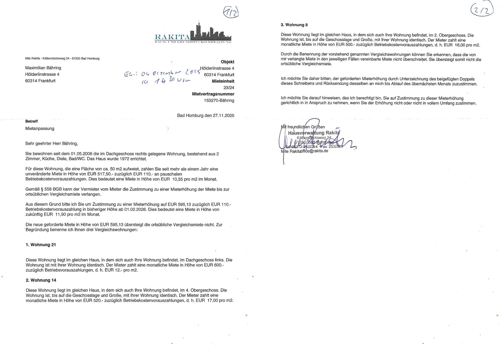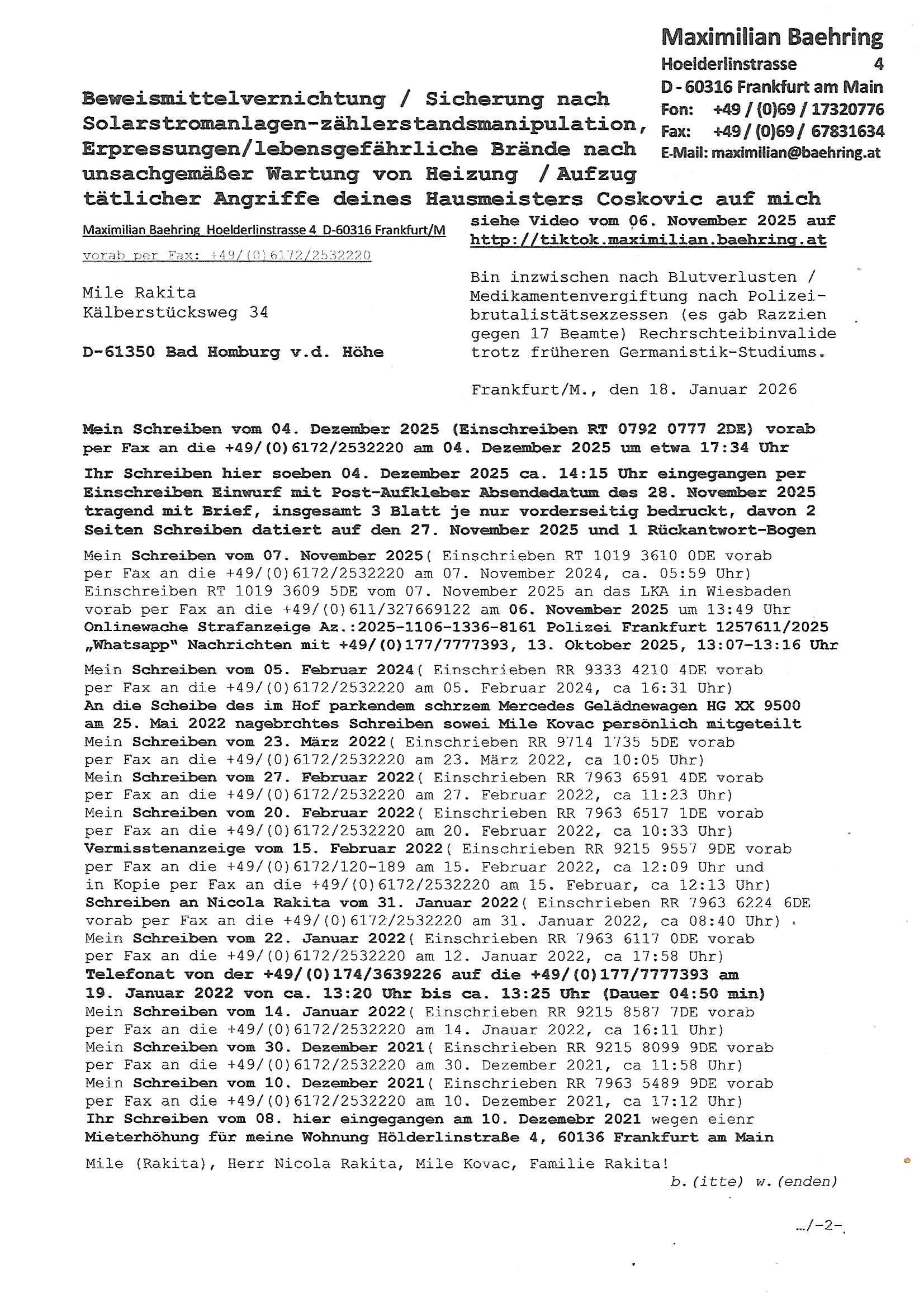 18.01.2026 18:30 Beweismittelvernichtung / Sicherung nach Solarstromanlagen-zählerstandsmanipulation, Erpressungen/lebensgefährliche Brände nach unsachgemäßer Wartung von Heizung / Aufzug tätlicher Angriffe deines Hausmeisters Coskovic auf mich siehe Video vom 06. November 2025 auf http://tiktok.maximilian.baehring.at Bin inzwischen nach Blutverlusten / Medikamentenvergiftung nach Polizei-brutalistätsexzessen (es gab Razzien gegen 17 Beamte) Rechrschteibinvalide trotz früheren Germanistik-Studiums. Maximilian Baehring Hoelderlinstrasse 4 D-60316 Frankfurt/M vorab per Fax: +49/(0)6172/2532220 Mile Rakita Kälberstücksweg 34 D-61350 Bad Homburg v.d. Höhe Frankfurt/M., den 18. Januar 2026 Mein Schreiben vom 04. Dezember 2025 (Einschreiben RT 0792 0777 2DE) vorab per Fax an die +49/(0)6172/2532220 am 04. Dezember 2025 um etwa 17:34 Uhr Ihr Schreiben hier soeben 04. Dezember 2025 ca. 14:15 Uhr eingegangen per Einschreiben Einwurf mit Post-Aufkleber Absendedatum des 28. November 2025 tragend mit Brief, insgesamt 3 Blatt je nur vorderseitig bedruckt, davon 2 Seiten Schreiben datiert auf den 27. November 2025 und 1 Rückantwort-Bogen Mein Schreiben vom 07. November 2025( Einschrieben RT 1019 3610 0DE vorab per Fax an die +49/(0)6172/2532220 am 07. November 2024, ca. 05:59 Uhr) Einschreiben RT 1019 3609 5DE vom 07. November 2025 an das LKA in Wiesbaden vorab per Fax an die +49/(0)611/327669122 am 06. November 2025 um 13:49 Uhr Onlinewache Strafanzeige Az.:2025-1106-1336-8161 Polizei Frankfurt 1257611/2025 „Whatsapp“ Nachrichten mit +49/(0)177/7777393, 13. Oktober 2025, 13:07–13:16 Uhr Mein Schreiben vom 05. Februar 2024( Einschrieben RR 9333 4210 4DE vorab per Fax an die +49/(0)6172/2532220 am 05. Februar 2024, ca 16:31 Uhr) An die Scheibe des im Hof parkendem schrzem Mercedes Gelädnewagen HG XX 9500 am 25. Mai 2022 nagebrchtes Schreiben sowei Mile Kovac persönlich mitgeteilt Mein Schreiben vom 23. März 2022( Einschrieben RR 9714 1735 5DE vorab per Fax an die +49/(0)6172/2532220 am 23. März 2022, ca 10:05 Uhr) Mein Schreiben vom 27. Februar 2022( Einschrieben RR 7963 6591 4DE vorab per Fax an die +49/(0)6172/2532220 am 27. Februar 2022, ca 11:23 Uhr) Mein Schreiben vom 20. Februar 2022( Einschrieben RR 7963 6517 1DE vorab per Fax an die +49/(0)6172/2532220 am 20. Februar 2022, ca 10:33 Uhr) Vermisstenanzeige vom 15. Februar 2022( Einschrieben RR 9215 9557 9DE vorab per Fax an die +49/(0)6172/120-189 am 15. Februar 2022, ca 12:09 Uhr und in Kopie per Fax an die +49/(0)6172/2532220 am 15. Februar, ca 12:13 Uhr) Schreiben an Nicola Rakita vom 31. Januar 2022( Einschrieben RR 7963 6224 6DE vorab per Fax an die +49/(0)6172/2532220 am 31. Januar 2022, ca 08:40 Uhr) Mein Schreiben vom 22. Januar 2022( Einschrieben RR 7963 6117 0DE vorab per Fax an die +49/(0)6172/2532220 am 12. Januar 2022, ca 17:58 Uhr) Telefonat von der +49/(0)174/3639226 auf die +49/(0)177/7777393 am 19. Januar 2022 von ca. 13:20 Uhr bis ca. 13:25 Uhr (Dauer 04:50 min) Mein Schreiben vom 14. Januar 2022( Einschrieben RR 9215 8587 7DE vorab per Fax an die +49/(0)6172/2532220 am 14. Jnauar 2022, ca 16:11 Uhr) Mein Schreiben vom 30. Dezember 2021( Einschrieben RR 9215 8099 9DE vorab per Fax an die +49/(0)6172/2532220 am 30. Dezember 2021, ca 11:58 Uhr) Mein Schreiben vom 10. Dezember 2021( Einschrieben RR 7963 5489 9DE vorab per Fax an die +49/(0)6172/2532220 am 10. Dezember 2021, ca 17:12 Uhr) Ihr Schreiben vom 08. hier eingegangen am 10. Dezemebr 2021 wegen eienr Mieterhöhung für meine Wohnung Hölderlinstraße 4, 60136 Frankfurt am Main Mile (Rakita), Herr Nicola Rakita, Mile Kovac, Familie Rakita! b.(itte) w.(enden) Am 04. Dezember 2025 habe ich im umseitigen Betreff zuerst aufgelistetes Antwort -Schreiben auf ihren Brief datiert auf den 28. November 2025 versendet und zwar vorab per Telefax, per Deutsch Post Einschreibebrief, per E-Mail / Blog-Internet und als PDF ausgehende „Whatsapp“ Messenger Nachricht an die +49/(0)177/7777393 [eingehende Nachrichten sind für den „Whatsapp“ Dienst sind bei mir aus formal- juristischen Gründen blockiert, genau wie Nachrichten andrer Messaging-Dienste]. In ihrem Brief vom 28. November 2026 erbitten sie meine Stellungnahme/Zustimmung für eine neue monatliche Zusatzzahlung, von Ihnen „Mietanpassung“ genannt. Dabei führen sie an daß die angestrebte Miete ortsüblich sei und die Kosten gestiegen. Um ostüblche Vergleichsmieten zu belegen führen sie drei andere Mietvertrags-Verhältnisse hier im Hause – alles Verträge mit Ihnen als dem Vermieter – auf von, wie sie behaupten, vergleichbaren Wohnungen. Ich stell hierzu folgend fest: Die anderen Wohnungen hier haben (anders als mein Dachgeschoss Appartement) oft-mals einen Balkon, keinerlei die qm-Zahl der Wohnfläche mindernden Dachschrägen und zudem eine Zustiegsmöglichkeit zum Fahrstuhl / Aufzug die „ebenerdig“ ohne zusätzliche Treppen zu steigen wie in meiner Etage erreicht werden kann. Man hat dort zudem überwiegende ein Tageslicht-Fenster in einer richtigen Küche anstatt wie bei mir nur eine extrem enge Kochniesche in die keine Stanrdgröße Einbau-geräte passen. Die Bäder in den anderen Wohnungen sind Wannenbäder und von der Fläche her vile üppiger bemessen, dort ist platz für Waschmaschinen, ich aber habe lediglich ein extrem eng bemessenes Duschbad, derart eng das am Heizkörper nicht mal ein richtiger Thermostat verbaut werden konnte. Von vergleichbar kann also nicht im geringsten die Rede sein. Die Mietsteigerung die sie begehren ist seit ich die Wohnung Mai 2006 anmietete (damals war hier noch überall Baustelle, ich mußte daher damals oft bei meiner damaligen Lebensgefährtin Manuela Nowatius, Edith-Stein-Straße, Heusenstamm das Bad in Anspruch nehmen und übernachten) die inzwischen Dritte, die erste Miet-erhöhung kam versteckt per Einbau einer Photovoltaikanlage als der vorher im Pauschal/Komplett-Mietpreis (Sie vermieteten die Appartemens als all-inclusive Rundum Sorglos Paket