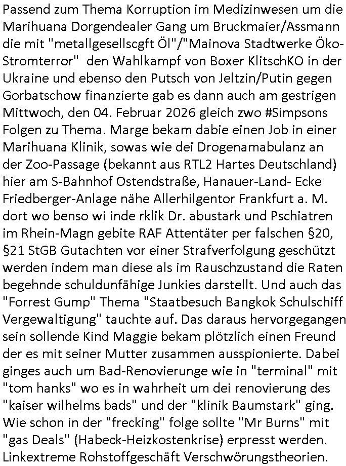 05.02.2026 06:00 Passend zum Thema Korruption im Medizinwesen um die Marihuana Dorgendealer Gang um Bruckmaier/Assmann die mit "metallgesellscgft Öl"/"Mainova Stadtwerke Öko-Stromterror" den Wahlkampf von Boxer KlitschKO in der Ukraine und ebenso den Putsch von Jeltzin/Putin gegen Gorbatschow finanzierte gab es dann auch am gestrigen Mittwoch, den 04. Februar 2026 gleich zwo #Simpsons Folgen zu Thema. Marge bekam dabie einen Job in einer Marihuana Klinik, sowas wie dei Drogenamabulanz an der Zoo-Passage (bekannt aus RTL2 Hartes Deutschland) hier am S-Bahnhof Ostendstraße, Hanauer-Land- Ecke Friedberger-Anlage nähe Allerhilgentor Frankfurt a. M. dort wo benso wi inde rklik Dr. abustark und Pschiatren im Rhein-Magn gebite RAF Attentäter per falschen §20, §21 StGB Gutachten vor einer Strafverfolgung geschützt werden indem man diese als im Rauschzustand die Raten begehnde schuldunfähige Junkies darstellt. Und auch das "Forrest Gump" Thema "Staatbesuch Bangkok Schulschiff Vergewaltigung" tauchte auf. Das daraus hervorgegangen sein sollende Kind Maggie bekam plötzlich einen Freund der es mit seiner Mutter zusammen ausspionierte. Dabei ginges auch um Bad-Renovierunge wie in "terminal" mit "tom hanks" wo es in wahrheit um dei renovierung des "kaiser wilhelms bads" und der "klinik Baumstark" ging. Wie schon in der "frecking" folge sollte "Mr Burns" mit "gas Deals" (Habeck-Heizkostenkrise) erpresst werden. Linkextreme Rohstoffgeschäft Verschwörungstheorien. Dann folgte #berliNeuKölln02407 / #berlinTagundNacht wo sich Piets Verlobte Raphi in dessen Abwesenheit an Malte ranmachte. Danach kam dann die bereits erwähnte 3sat #Kulturzeit (wo Christian Metz jobte, ein ehemaliger Schülerzeitungskollege von mir). Es ging da Anafgns um die bereits erwähnten "E.P.STEIN" Akten, Bill - Gates Ex Ehefrau meldete sich zu Wort udnes ging um ien EDVler der angelce "KI froshcung" betrieb und "Bach" heiß (wie imClockworkOrange Vergewaltigungs Film: "Beethoven") der den schülerzeitung E(xtra)P(platt-juwekieredle)STEIN Raubüberfall auf Juwelier Zeus Bad Homburg nach dem Sprengstoffanschlag mit der bei der RAF Terroristin Klette gefudnen Beute dazu nutzen wollte das damals von mir programmerte Warenwirtschafts-system zu ersetzen und zwar indem er Router/Standleitungsbadrf generierte für den angeblchen Datenabgleich mit der Versicherung wo es aber in wahrheit um die DRM frag ging ob man an zwo Windows Arbeistplätzen die sleb wor lizenz nutzen kann. So kommt "Bil Gates" und sein "setup /A" office Paket der Firma micsoft zur Netzwerkinstallation ins Spiel wobei man sich mit dem staatsbesuchs Vergewaltigungs Vorfall der auch besprochen wurde Sendezeit erpressen wollte. Dabei wollet man auch israelisch zionistische Rufmord - Kampagnen verbreiten gegen palästinser und in dem Missbrauchs Film "das kler epxeriment" ging es ja ganz seltsamerweise auch um Palästinenser-Kinder die vor zionisten Hetze nch Deutschand geflohen waren udndort von Homsexulen Juden zurzagspriotutuion gezwumngen wwrden sollten. (siehe zwotverwettung Juwlier/Alexa -Pflegeklinik PayTV Netzes für True-Cime Folter-Pr0n Cam Zuhälterei [DRM Copyrghets] durch schutzgelderpressnde Rechenzetrums S*xurty-Mafia [ auch Bundesverband der ostblock banksicherheit] ). Mit der Präsidenten eprssung (daher geht es bei "EPSTEIN" ja auch um "Bill Clinton") erpresste man sich von westlichen Firmen/Orgasiationen wie "Metllagesellschaft AG" Konzern und dem Bundes-verband "Wach und Schließ" Geld für ein "antifa - netz" indem es dem vorwand nach um rcherchen zu jüdischem ostblock Alteigentum gehen sollte. Ich hab ja erklärt wie das WWW (auch um das Thema Folge/Autoradio Zubehör Lieferkette und Staattsbesuch-Vergewaltigung und Atom-Patientenakten) herum al erchrechnetz entstanden ist. Es gibt also zwichen Vergewaltigungen und alteigentum Debatte sowei Cybrcime ien unmutelabern zusmahang von diesem Fall hier und der "EPSTEIN" Akte. Um das Altegtum von Juden/Palästinsern ging es dann auch in der 3sat #Kulturzeit weiter, eine arabisch/ jüdisch/israelische "Comedian" worden in einem Dokufilm potraitiert der "Coexistance 'my ass'" hieß. Was ist eigentlich mit den Juden passiert dei in Dschaldn bliben als die Zionisten mit roher 9/11 Flugzeug-entführung Terrorismus Gewalt [inszneirter kriegsgrund gegen die araber/moslmes] Palästina/GAza besiedelten". Mit der Frage beschäftigten sich homerotsche Fotos von "Benyamin Reich" einem Aussteiger aus der jüdschen Orthodoxie. Es ging um den missbrhcn von Pflgern und um den missbrauch durch Mediziner (Vergewaltgung hilfloser "K.O. Drops" artig Medikamentierter umihen unerwünschte Kidner in die erblin iezu mogeln aus finanziellen gründen). Er sagte "FOTOGRAFIERN IST WIE SCHIESSEN", das war so inder Ära vor den Phothop/KI-Fakes ForrestGump/Titanic. Und dann gab es einen Pogrammhinweis daß man unbdingt di nachfolgenden sndungen ansehen sollte. Angeblich gab es entführte Israelinnen. Anschließend gings um Häuser (angebliches Vertiebne "Villa" Alteigentum vom Vortage: wo Bäume anch histroschemvorbild gepflanzt wurden). "Archtektr des Glücks?", ich würde sagen "Bauruine" von "Peanuts die bank zahl alles - immo Schnider" und "Rene BnK.O.".Dcnh gab es ien Ausstllung zu der Disco "omen" in Frankfurt a.M. eien der kontaktanbahnungs- Clibs sich das 9. klässler afro-merkianshce Waisen-kind "Mona Offergeld" (Waisenhaus Haus "Gottesgabe" und Humboldtschule Badf Homburg schülereutung) sich meines wissens nach tengsershcfsercfts-schwängern ließ. Es ging um Galrene-"Slave to the ryhtm" Techno/Musik. "negermusk" nannate das die Altnazis. Das ist was ganz anderes als Musk mit TextInhalt wie thePolice/Sting's Russiandsd as auch vom Klang her "Ethno Pop" ist oder "Billy Joel"s St Pertsburg song "leningrad". Danch ging es um den Inhalt vonRchtren "katharina fischer" die mir von der optik her zimlch bekannt vorkam, sie sieht einer mit-schülerin von mir überas ählich, udn ihre kollgeinnen veröffentlichten dort hörsp