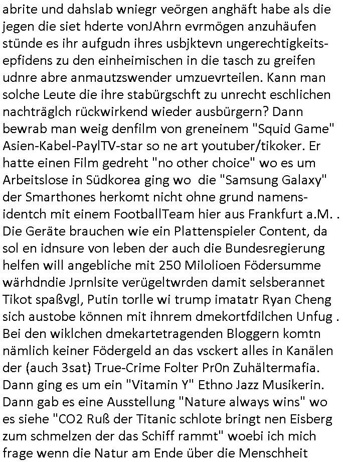 06.02.2026 05:15 Die Bild-Zeitung schreibt hier daß sich die Kosten bei der Behörde für die Verwaltung des Bürgergleds verdoppelt hätten in 10 Jahren, das muß wohl an der Abschaffung von Faxgeräten und Digitalisierung per Bundestrojaner - App liegen. Und jetzt kommts, die etwa 500 Euro Regel-satz Bürgergeld pro Monat kosten pro Jahr das vierfache also 2.000 Euro an Verwaltungskosten pro Fall. Nhemnwir mal meien Fall, ich hab bie de rbatrgaung gesgat ich wiel das Bürgergeld nicht als nircht rückzahlbare Leistung haben sondern als Darlehen bis die gerichte meinen Fall entschieden haben da wqud mir evrgeiergt, sattdesnw ollte man mir unbedignt eine Krankebversicherung ver-kaufen mit deren Hilfe ich zum Rechtschreibe Invaliden vergiftet wurde udn man mir gesunde Zähbe aus dem kiefer riss. Ich bkaomm jaihgrdnwannshcdenrstz dann bekommt von mri der Staat/das Sozilasystem auch sein Geld zurück. Es liegt also wie ich shcon ab 2000 immer wider sagte als mich Gerichte regerlchte zu verarshcen begannen wes-halb ich ja auch üerhuat erst abrtslsoe wurde am Staat. https://www.bild.de/politik/inland/buergergeld-wahnsinn-jeder-stuetze-empfaenger-kostet-2000-euro-verwaltung-698471547f5bc5017ea8011e [0] "202602060515-0-1.jpg" [1] "202602060515-0-2.jpg" |