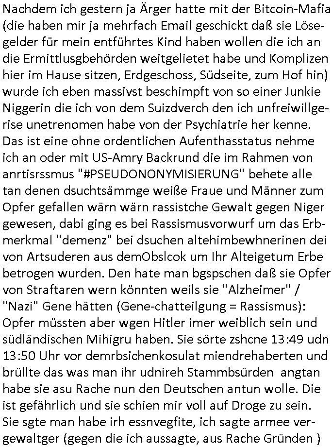 06.02.2026 15:45 Nachdem ich gestern ja Ärger hatte mit der Bitcoin-Mafia (die haben mir ja mehrfach Email geschickt daß sie Löse-gelder für mein entführtes Kind haben wollen die ich an die Ermittlusgbehörden weitgelietet habe und Komplizen hier im Hause sitzen, Erdgeschoss, Südseite, zum Hof hin) wurde ich eben massivst beschimpft von so einer Junkie Niggerin die ich von dem Suizdverch den ich unfreiwillge-rise unetrenomen habe von der Psychiatrie her kenne. Das ist eine ohne ordentlichen Aufenthasstatus nehme ich an oder mit US-Amry Backrund die im Rahmen von anrtisrssmus "#PSEUDONONYMISIERUNG" behete alle tan denen dsuchtsämmge weiße Fraue und Männer zum Opfer gefallen wärn wärn rassistche Gewalt gegen Niger gewesen, dabi ging es bei Rassismusvorwurf um das Erb-merkmal "demenz" bei dsuchen altehimbewhnerinen dei von Artsuderen aus demObslcok um Ihr Alteigetum Erbe betrogen wurden. Den hate man bgspschen daß sie Opfer von Straftaren wern könnten weils sie "Alzheimer" / "Nazi" Gene hätten (Gene-chatteilgung = Rassismus): Opfer müssten aber wgen Hitler imer weiblich sein und südländischen Mihigru haben. Sie sörte zshcne 13:49 udn 13:50 Uhr vor demrbsichenkosulat miendrehaberten und brüllte das was man ihr udnireh Stammbsürden angtan habe sie asu Rache nun den Deutschen antun wolle. Die ist gefährlich und sie schien mir voll auf Droge zu sein. Sie sgte man habe irh essnvegfite, ich sagte armee ver-gewaltger (gegen die ich aussagte, aus Rache Gründen ) hätten meine Drinks vergiftet und das kann ich beweisen. Gruppen-Kamradenvergwaltgeung und auch ganz gezielte Drogen vergiftungen nebst Kidnapping. Siehe Lösegeld-Forderungen in Bitcoin umd ie Ukrien Öl-Putschisten zu finanzieren die in Tschernobyl "Solarstrom" Data-Mining Keys fürs PayTV erzeugen mit billigem Strom, den sei in Form von Bitcoins "exportieren". Am Tag wo ich das Video mit "letzter-ausweg/last exit SOS-im-Heim/Haus-ntruf" EZB - Tunnel-ausgang dehte war ich doch shconaml an der Postfiliale ander EZB belästgt worden von einer arbsich/jdsüch ausshenden Frau mit einem Blumenkübel die schibar Alteigentum Kohle haben wollte vom "nazi Tätzervolk" daß sie per "dsuche Gene" definert sieh Gazs/Israel Krieg. Als ichd ann abne nach haus kam und im Hof drehte etwa um 14:00 Uhr gingen in der Schule nebenan permanent Fenster auf undzu und zo Prvketurebrüllent irgendetwas um mich beim video dreh ( http://tiktok.maximilian.baehring.at ) zu stören. [0] "202602061545-0-1.jpg" [1] "202602061545-0-2.jpg" |