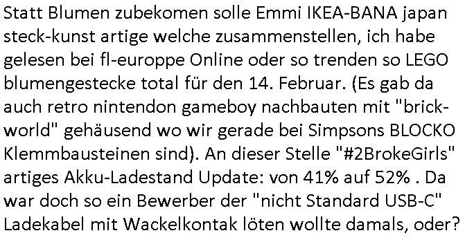 11.02.2026 08:15 Huet mrog rschte jedenfasl mal wider mehrfach meine Windows - Miet - VPS im RZ ab nachdem irgendewelche komischen "KGB/CIA Bundstrojanner"(?) auf einem voll (samt ateier virepattern) gepatchten Win11 aufpoppten. Auch das billig Android Smartphone das ich mir geholt hab wegen der Onlinbanking Freigba TAN - App macht probleme,der akku is so gut wie leelgelutscht nachdem ich gestern einen "treu Crime" Podcts mit mienr Lieblings Sat1 FrühstücksTV Morderatorin ansehen/-hören wollte. Ich bin da drauf gelandet als ich die <alamerk@> Email Addresse googlete respektive in der wikipedia suchte. Nun zum 18:00 Uhr TV Vorabandprogramm von gestern, Dienstag dem 10. Februar 2026. Zwoter Versuch: Es ging um Flugangst bei den #Simpsons und ich musste da aus irgndeinem Grudn an einen Artikel über diese Ostblock Charter - Airline "fischAir" dneken den ich aus irgendnem Grund verlinkt habe gestren als ich "Flugbenzin in Cuba" oder so was ählcihes in die Suchmaschine getippt hatte . Das würde man doch mitbekonmen hier am Airport in Frankfurt wenn die Ucaber Miltärs Kraftstoff rationieren. So lang ich die gecancelten mashcinen (da gibt es ja auch eine Simposn Folge zu, CIA/Pilotenbars und Medzinische Flüge ins Cuba Klinikpardies ) nicht mit eigenen Augen gesehen habe glaub ich Lügen-Trumps Propaganda gar nichts. Aber zur #flugangst Folge der #Simpsons: Skinner reiste mit chalmbers ncah cincinatti zu einem Kongress mit (schon wideer) Chili-Essen in einem Edward-Hopper "nighthawks" artigen Gastro-Betrieb. Beide hatten nen Zwischenstop bei ner Richterin, Anhalter mitgenommen, sich mit Bikern mit Trainingsdaten Computern angelegt. In teil zwo ging es um die entwicklerin von einem Navi Satellittensystem Gladys West zu der Lisa referierte. Sie spionieret außerdemaus daß ihre lehrerin bei der sie sich entschuldigen sollte Rückenprobleme hatte. Dann kam #berlinNueKölln02407 / #berlinTagUndNacht, Carlas Chfe strengt diszipliarrechtliche Ermittlungen gegen sie an und sie ist frustriert da sie den Computer - Fehler nicht findet deretwegen Akte verschwinden/geleakt werden. DAnn erfhren wir noch daß Bruno Blumeebstellt hat und emmi soch shcon freute aber die waren gar nicht für sie. Dann begann die 3sat #Kulturzeit. Es gehe ein "Riss durch Deutschland" besagte eine eingeblendte Stdio-Grafik. Die Autorin "Jana Hensel" stellte ihre neues Buch "es war einmal ein Land" vor, das voherieg das sie schrieb heißt "Zonenkinder" erfuhr man. Dann gab es ein Interview wo es hieß der AfD - Politiker "Timo Chrupalla" sei eiegech nur ein gescheiter-ter (glükloser doer unfäger?) Unter-nehmer der sich zusammen mit andern Ossi-Arbeitslosen radikalisiere. Dan zeigte man ne #berlinale" Retrospektiv" "win o change" wo 1992 inRumänine Caucescu mit dem Heli evakuiert werden musste voNSzialkärften vom Dach eines Regierungsgebäudes udn wie er danach trotzdem später erschossn im saatlchen Fernshen gezeigt wurde. Der annkam mir irgendwie bakannt vor. Spielt der denn vielleicht bei HBOmax SPY/Master mit oder sowas? Dann ginges um einen Film "der Kontrolleur" über den Personalabbau an der früheren Zonengrenze und die Angst vor Vandalismus an Grenzanlagen/Zäunen usw. . Ich mein wer will sowas schon haben, für wen ist das wert-voll? warende Luet amals nicht eher froh wenn das alle beseitget wurde? Ic muß gerade an #Schtonk denken die Anfangsszene mit dem Antiquitätenhandel. Dan ien beitrag "so schnell geht es nach Dresden" von Andreas Dresen. Und dann kam "hola rennt" mit "Bleibtreu" von "Tim Twyker" oder so. Der hat docjhso tolle Soundtracks beigesteuert zu "Babylohn Berlin", oder war das "Bar-dalimenti",ich galb ich verwechle gerade diesen Kapital-Flucht "brger kind geburtstagskrone" Juwelenraub Film mit irgendnem "pakt der Wölfe" Grenzregion - Morde Krimi. Sows häuft sich ja dier sich Grenzen verschieben, sihe Ukraine oder Gaza. Dann gabs nen "Bullet Tanz" in Dresdn von der Sempron (R)TM Oper "BY WAYS" wo eine "Frankfurt (oder?) ganz Kompanie" mitwirkte. Dann die Sängerin "Embassy of Sound" die "Sirens" von dem album "undRte" zum ebsten gab. Darauf folget dann ein asiattscher kinofilm "Winter in Sokcho" der i Kino kam. Damnach ging es um ein vehrdienst-kritischen Roman "im ertsen licht" von "noerbet gstrein". Er berichtete über ein Vater der den Sohn zum Invaldien verstümmelte um ihn vor dem Kriegsdienst zu retten. Man zeigte Bilder von "Gesichtsverletzten". Der östereichisch Autor (so ich recht entsinen salzkammreut?) lebte im Schnzten-viertel in Hmburg und sinerte üer die kriegsschuld von Waldheim. Er sagte er zeieh es vor anonym zu bleiben beim kauf von Büchern, er würde sich ungern outen. Sondst würddeder beim EIkaufen näclih angesprochen Was der wohl liest? Pr0n-Literatur? Dann ging es um Nagelküstler Uecker. Der ist ja (siehe Blogeintrag in Nähe seines Todesstags) krzlcih verstorben uddn jezt gab es eine erst posthume Ausstellung. Sargangel Todesanziege asu dem Dotmatrix Printer: google:/""pixel dotmatrix truetype vector font"? (man kann Fonts aus Postscript/PDFs reverse engineern, so wie wenn man Podcaste SpeechtText als buch druckt). Es gab einen alten "sesam mit der maus" Beitarg über ihn. Im Reich der Nieten und Bolzen die alles zsummen halten tummeln sich ja Mäzene. Zum shcluß dei Berliner Band "von wegen Lisbeth" mit dem musik video "Madame Tussauds" wo es irgendwie um varofufakes Handsahke "Tom Hanks" ging aber der zusammhenag wurde nicht klar. Danach leif dann #berliNueKölln02407 / #berliTagUndNacht "Fraun anpumpen geht gar nicht" fand Mike. Denstz hab ich umZsmmnhag mit der ersonalie/bestzung irgeneines Bankenchfsposten iNIsderkeisen schon mal vernommen. Carla ist immer noch frustrietrt we ihr irgewas in ihrem Notebook zu komplizierte ist,sollte sie mal lieber einen eeePC "netvertible" nehmen "3 * EASY 2" : ""Easy to learn, Easy to work, Easy to play," Keep It Short/Simple. Statt Blumen zubekomen solle Emmi IKEA-BANA japan steck-kunst artige welche zusammenstellen, ich habe