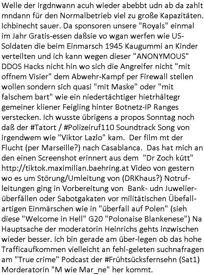 17.02.2026 09:30 Nun aber zum 18:00 Uhr TV - Vorabendprogramm von gestern, Rosenmontag dem 16. Februar 2026. Wiel Maggie einen Zauber-sate habe wollte besuchte die Familie einen Laden eines magier der ihnen die Tarot Karren legte und die Zukunft inhrem Lügen Universum vorhersagte, was nicht sonderlich schwer ist wenn ähn-lich wi im Film "#trumanShow" alles um einen herum geschau-spielert ist. In Teil zwo wurde aufgedkeckt das Grandpa Ape als Spion für eine feindlche mcht arbeitete, Deckname "Grey Fox", was mich daran erinnert das zuder zet als Polez noch in Mod waren meine Mutter ne graue Fuchs Mütze und nen passnden Handwärmer hatte. Dann begann #berliNueKölln02407 / #berliTagUndNacht woe Mike jetzt der Gigol von seiner Freundin Sarah ist, da passt zu den von interpol abgeblockten Veruche Geld zu bezahlen per Bitcoins usw. um sich falsch als mein Untermieter auszgebenm dem dei gamzen Prozesakten Urheberrchte gehören von denen dei #Pseoudonymous Mafia (um es mit den #Simpsons zu formulieren lebt) . Es git dischaus lze shcibar die geld mti meinen Ibhalten erdien aber die haben mit mir defitive nichst zu tun. Sarah amct Miek also Abhägig indem sie ihm geld zur Miete dazuzahlt. Aufsowas würd ich niemals eingehen. Polietsse Crala efuhr daß Olivai von einem Immobilien- betrüger gestalkt wird. Kärtze hate ne neue türkisblaue Mütze auf beim Frühtscük im #fernsehwerft Hausboot.Olivia lügt mal wider als Carla sie beim Inetrnet surfen ertappt udn sie weint. Sie tut so als hab das nichts mit der Erpressng durch den Immobilienhai zu tun sodnr sie wegne eines zuHerzen egehden Straßkinder blogs den sie gelesen habe. Der Chef der EDV der Polizei kommt vorbei und Oliva wittert eine neue Chance wiede ridnas netz derpolzei iezuchen idnemseisch an den heranmacht um per vakuaf vonInfos üer gaplte Polzeioperatioen erreichen zu können daß der Immobilien-/Kredithai vonhr abläßt. Sie bahte sie sei Fan von "TREU CRIME" Blog/Podcasts. Dann begann die 3sat #Kulturzeit mit einem beitrag über die veröffentlichung des euen Buches von "Gisel Pelicot" dieses Mehrfach Vergewaltogunsg-opfers in Frakreich das währnd er taten genau wie ich unerDoegn gestzt wurde. Das Hau sin südfrakrich in dem sie gelebt hate war sehr schön, ebso ihr Stadtwohnung. Sie sgte sie habe vonder Vergewaltgung gar nichts mitebkomenbis manihr Filem vonder vtscktenKarea zget welehe die POlzei afsgtellt hate galbicha ls si ewgeeisn andern deilkst ermittelte gegen ihrn Mann. Das buch hieß "Hymne an das Leben". DAnn kan filem von der Berlinale wo die Rapperin "Charlie XCX" Stargast ist. Sie stellte ihren film "the Moment" vor. In ihm ging es um das" "MELKEN" der "KUH",asol das größtmöglch subsuten von "Künstlern" duch deren Management mit Marketing Tricks wie ne "grüne Kreditkarte". Dann ien Weltuntergangs film "Good Luck, have fun, don't die". Dacn berchte man üer angrffe von JusnlsitIennen auf Berlinal Jury Präisdnet wim Wenders demparticia Turle die fstvallietrin beispiegn muste. Es ging darumd aßman ich nicht zur nahost likt äßernmuß wenn so man nicht will in Pressekonfernzen. "Filem sidn das Gegenteil von Poltik" sagw wenders wiel sie Poltik kiristch betrachten oder sowas. Dann ginges darum daß de shcupsielr "robert Duval" aus "der Pate" gestorben sei. NShcließnd kam ien bericht üer ein drei-tägeegs Theaterxperiment von "Milos Rau", "Herta Däuler-Gmelin" war vstzende eisn Tribuals vonshcten Jusrtendas afde rbüe shcindosllte üer ien AFD-Verbot, man veris desiche ans BVerfG, verbot die Partei nicht. DAn ien Bildabnd, die schönsten Gärten Frankreichs. Gfeolgt von ienrBcht üerdie afführen de rOper "luisa Müller" von "Verdi" (dergwersfct?)" in Wien. Dann gig es um ienInnrschteketen "heriette naumann" oder so die Epochen nachbildet, it Einrichtungen, etwa die NS-Zeit. Sie hatte das Jugendzimr von der NSU Terroristen Beate zshcäpe nacgbaut mit dem 4stellige-PLZ-Makottchen als Plüschtier. Dann irgenche RA_ Musik? Irgendwie wirkte Celie Shortmann gestern SCHWER ANGESCHOSSEN umes mal mit Trixie Dörfel Klinikparadies Füshtsüfsreh Kitiken zu formulieren. Danach dann wieder #berliNueKölln02407 also #berlinTagUndNacht . Mike hat in der kneipe "Cräsh" gearbeitet für Schmidti. Er hat ie Jobagabot aus Portgal erhate daßer wahrnhemenwill. Kärtez vernstaltet eine Strip Show mit ih slet als haupdarsteller für Raphi die ihn heimlch dabie filmte und mit dmematrail dann sofort zu erprssen begann. So wie Krätze es mt ihr vorhatte. Cral drohte Olivai daß sie noch rausfinden werde was lost stnchdem sie wohl den Immobilien-typen observeirt hat. Es gab noch eimen interessanten "HUK Coburg" Spot mit einem Mars-Roverunfall Rückholungs-Rettungsnotruf. und in #Brisant oder #taff bescherte sich "Anuschka Rienzi" über hohen Lsbhaltunsgkosten in der "paris bar". Der wirkte irgendwie nachsychroniesiert dieser Beitrag . https://tvinfo.de/fernsehprogramm/2303176764-die-simpsons https://tvinfo.de/fernsehprogramm/2303176777-die-simpsons https://tvinfo.de/fernsehprogramm/2279712956-kulturzeit https://www.horizont.net/agenturen/nachrichten/debuet-der-neuen-agentur-von-martin-eggert-maison-acme-und-huk-coburg-entfuehren-in-scifi-spot-auf-den-mars-233175 [0] "202602170930-0-1.jpg" [1] "202602170930-0-2.jpg" [2] "202602170930-0-3.jpg" [3] "202602170930-0-4.jpg" [4] "202602170930-0-5.jpg" |