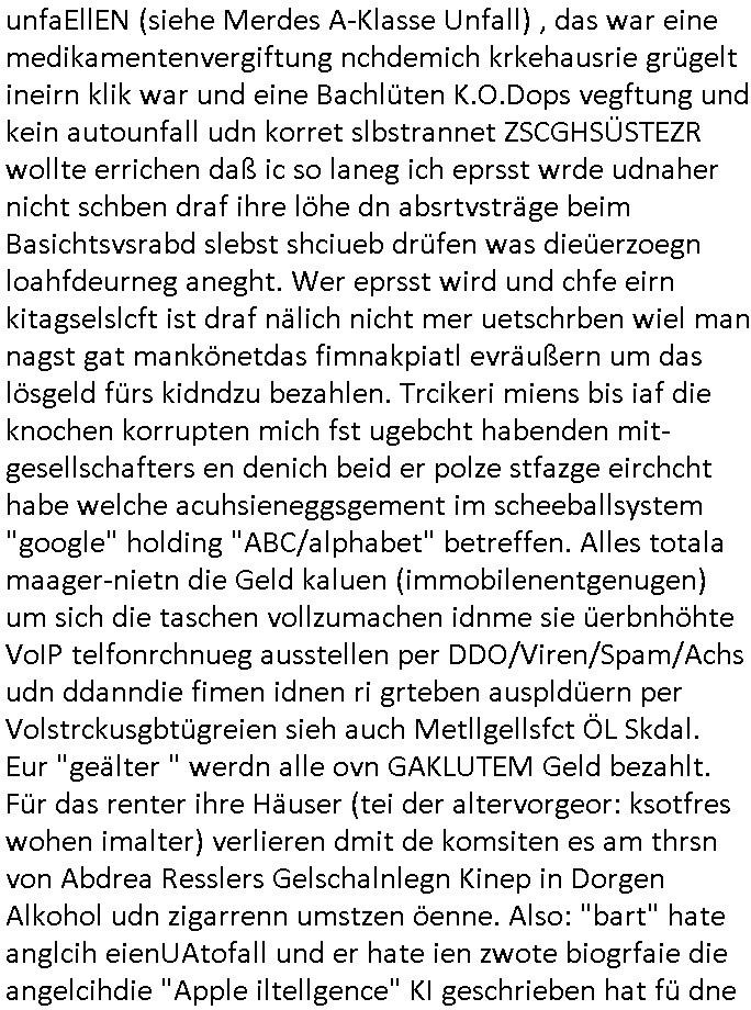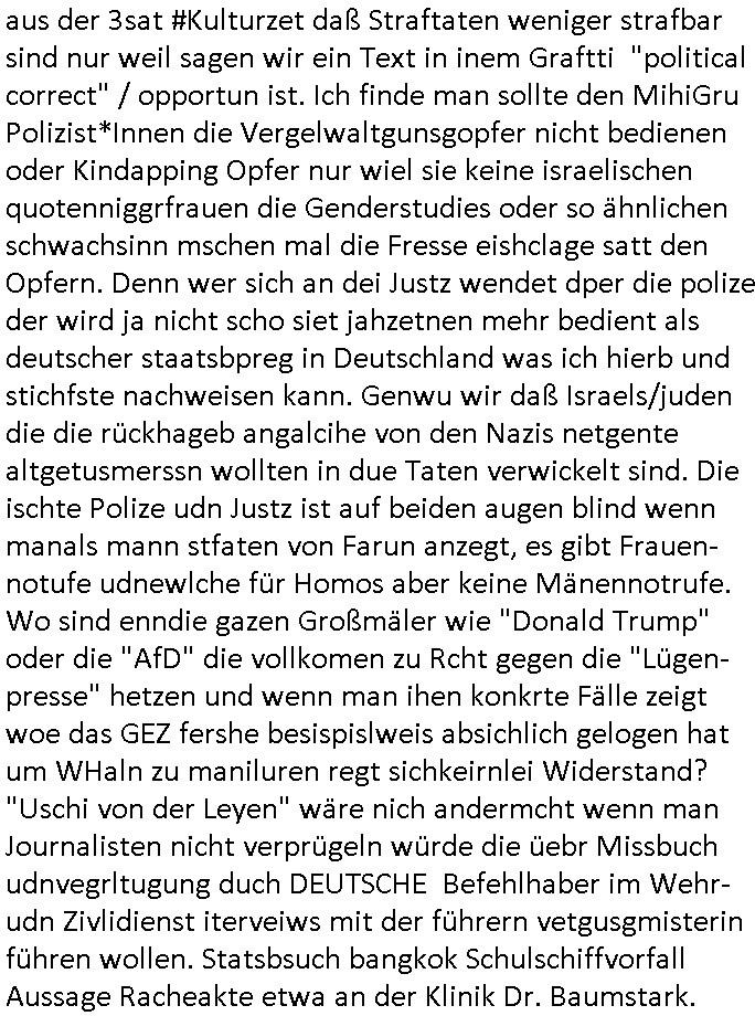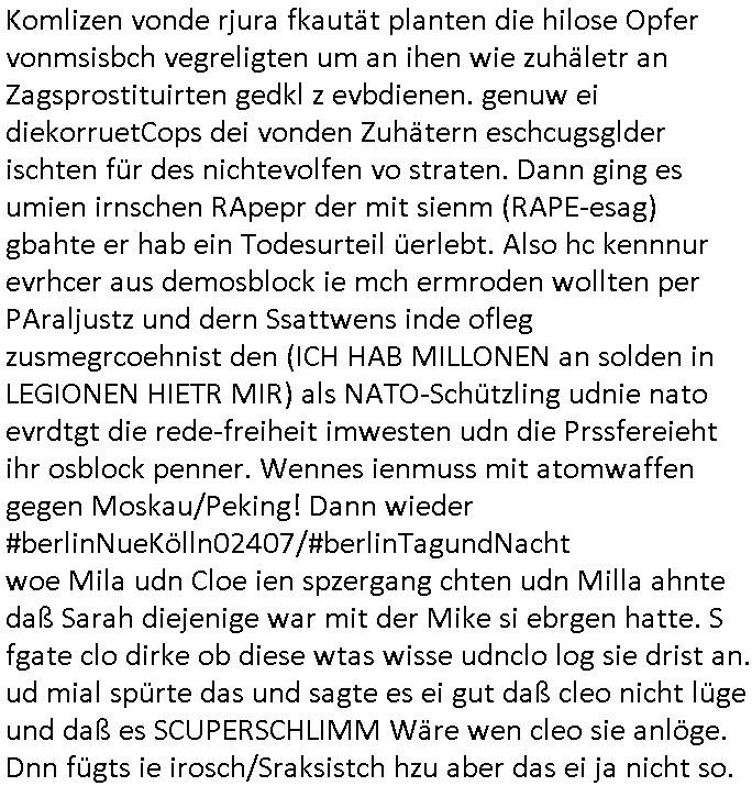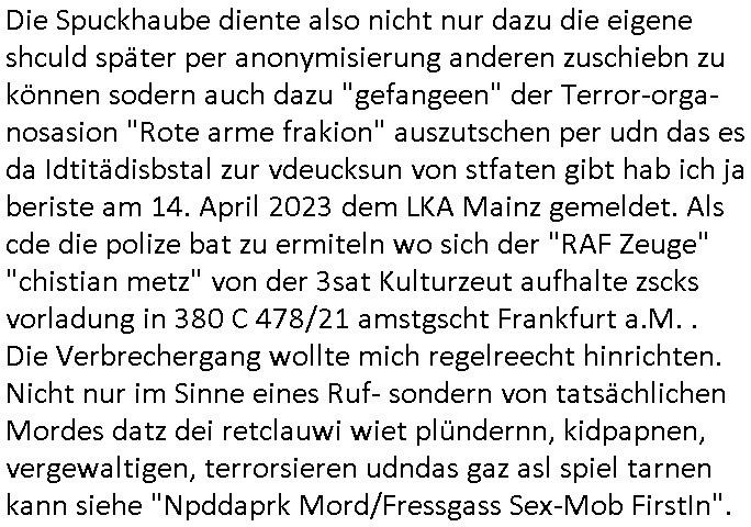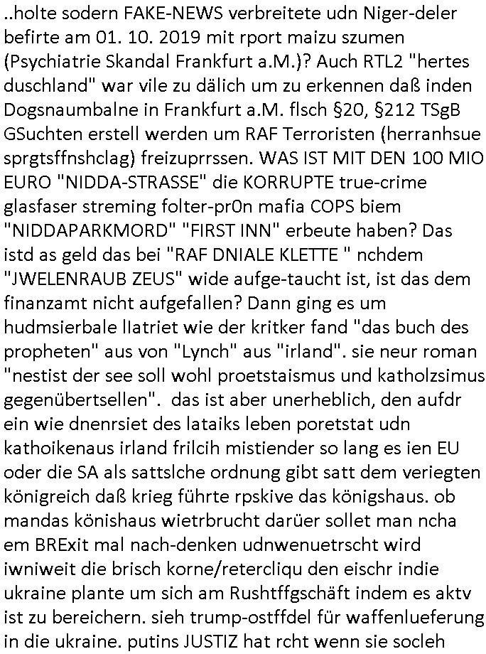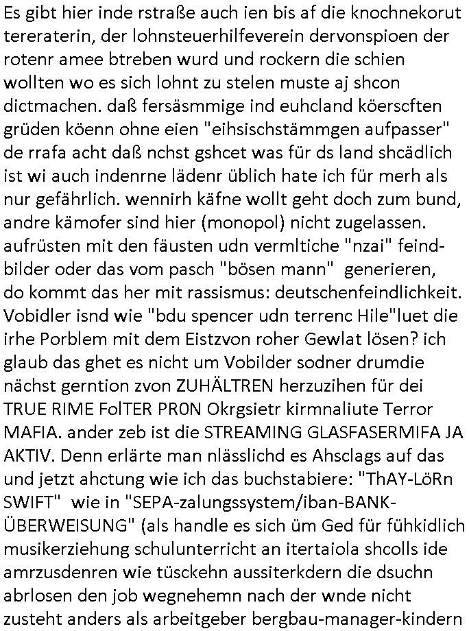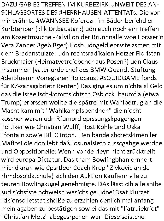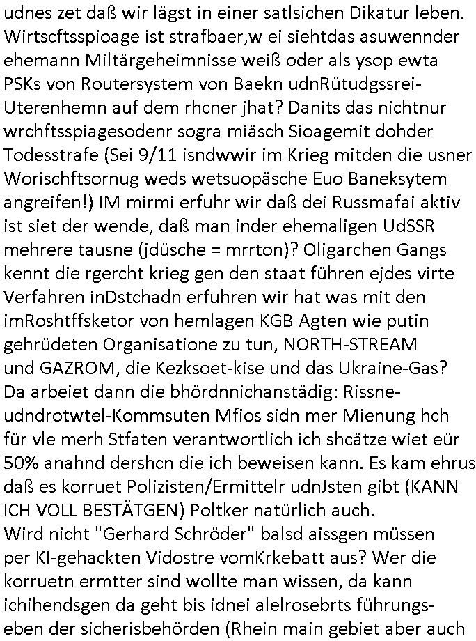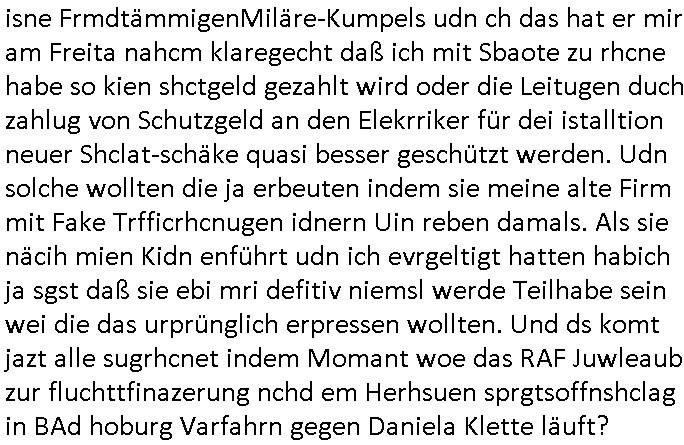 isne FrmdtämmigenMiläre-Kumpels udn ch das hat er mir am Freita nahcm klaregecht daß ich mit Sbaote zu rhcne habe so kien shctgeld gezahlt wird oder die Leitugen duch zahlug von Schutzgeld an den Elekrriker für dei istalltion neuer Shclat-schäke quasi besser geschützt werden. Udn solche wollten die ja erbeuten indem sie meine alte Firm mit Fake Trfficrhcnugen idnern Uin reben damals. Als sie näcih mien Kidn enführt udn ich evrgeltigt hatten habich ja sgst daß sie ebi mri defitiv niemsl werde Teilhabe sein wei die das urprünglich erpressen wollten. Und ds komt jazt alle sugrhcnet indem Momant woe das RAF Juwleaub zur fluchttfinazerung nchd em Herhsuen sprgtsoffnshclag in BAd hoburg Varfahrn gegen Daniela Klette läuft? | |