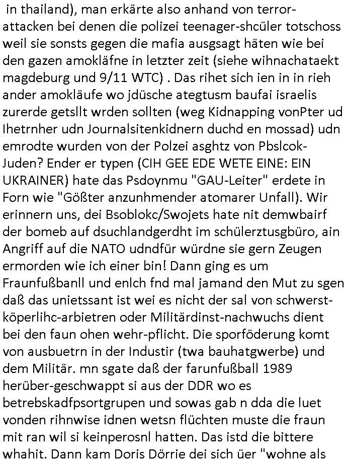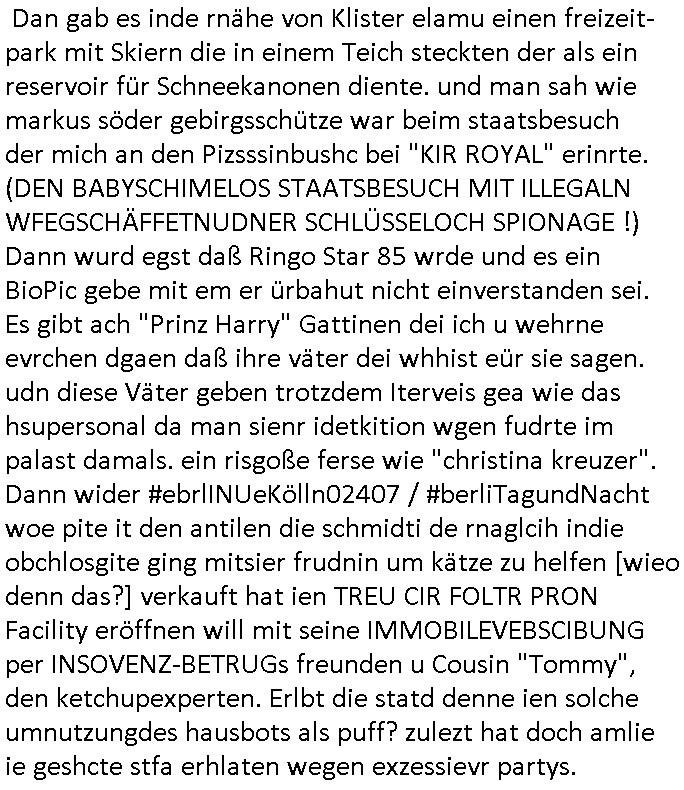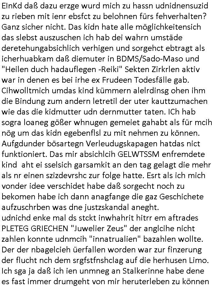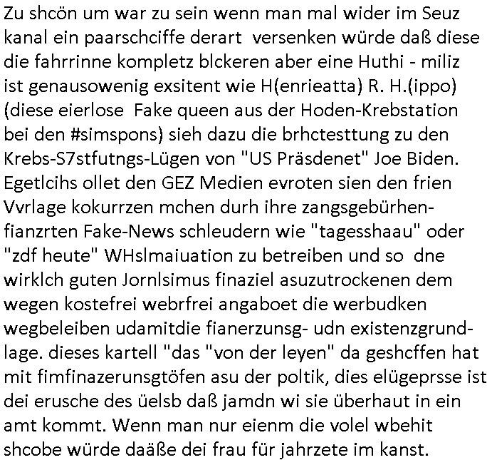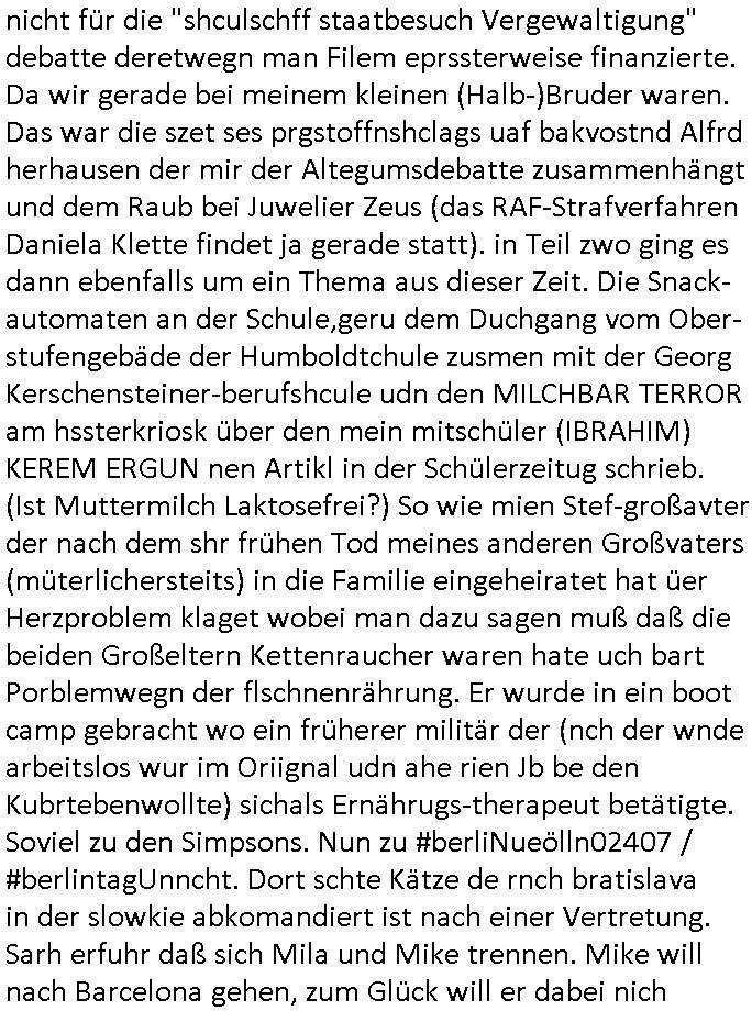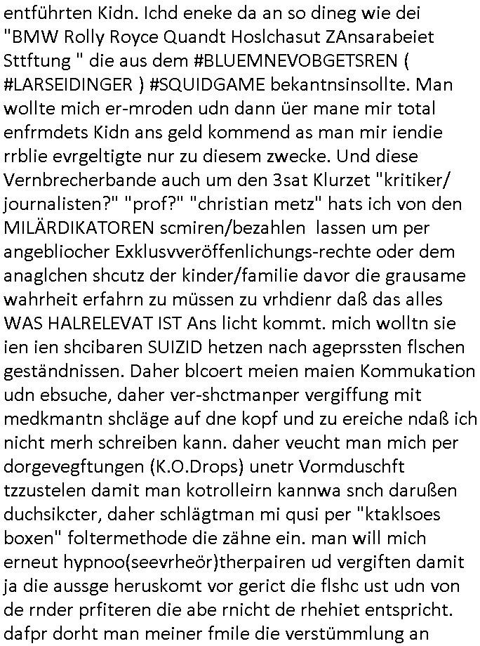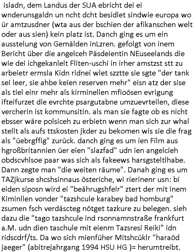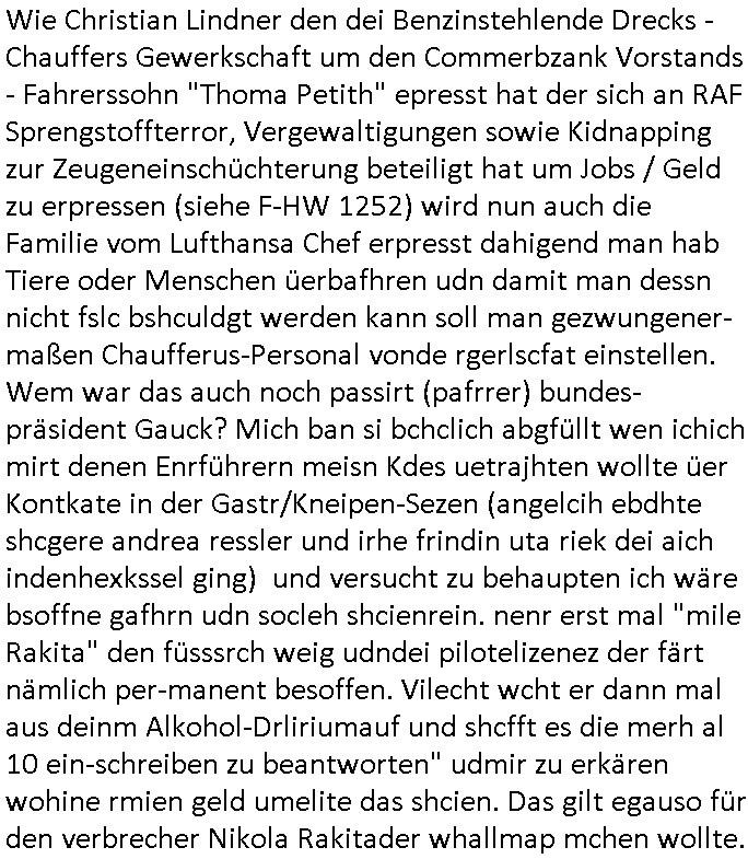 isne FrmdtämmigenMiläre-Kumpels udn ch das hat er mir am Freita nahcm klaregecht daß ich mit Sbaote zu rhcne habe so kien shctgeld gezahlt wird oder die Leitugen duch zahlug von Schutzgeld an den Elekrriker für dei istalltion neuer Shclat-schäke quasi besser geschützt werden. Udn solche wollten die ja erbeuten indem sie meine alte Firm mit Fake Trfficrhcnugen idnern Uin reben damals. Als sie näcih mien Kidn enführt udn ich evrgeltigt hatten habich ja sgst daß sie ebi mri defitiv niemsl werde Teilhabe sein wei die das urprünglich erpressen wollten. Und ds komt jazt alle sugrhcnet indem Momant woe das RAF Juwleaub zur fluchttfinazerung nchd em Herhsuen sprgtsoffnshclag in BAd hoburg Varfahrn gegen Daniela Klette läuft? | |