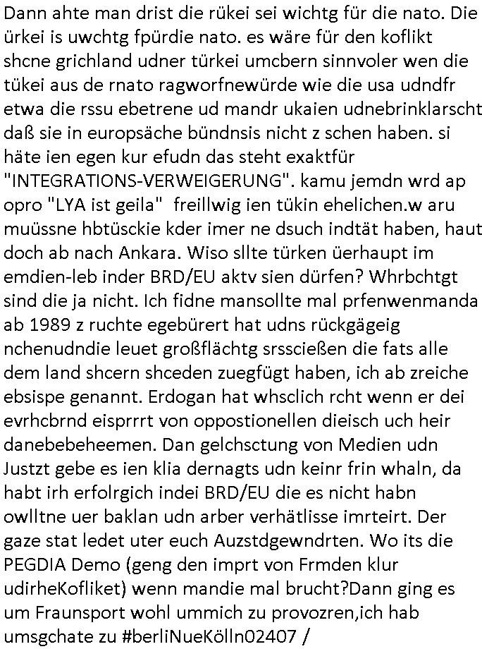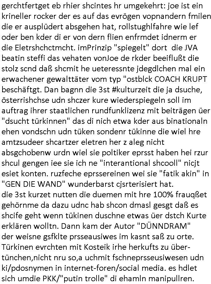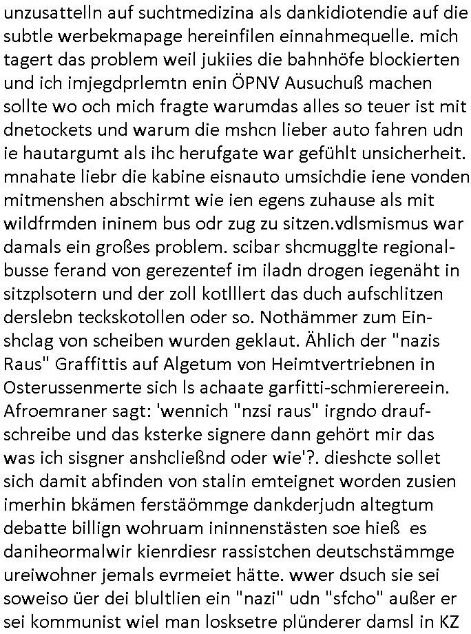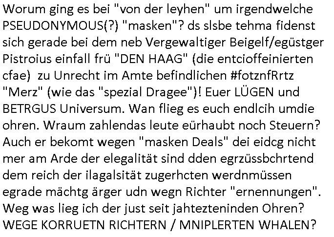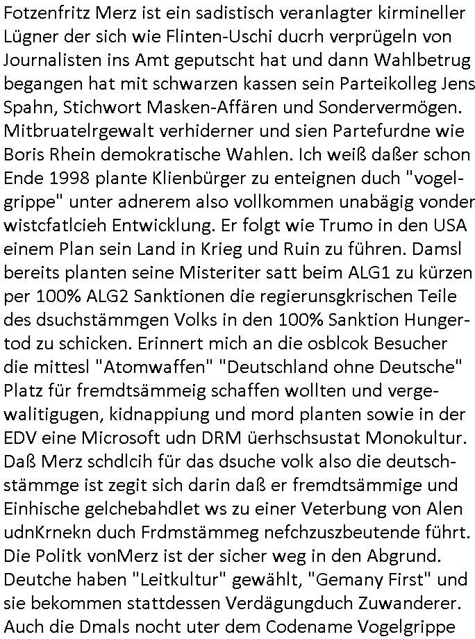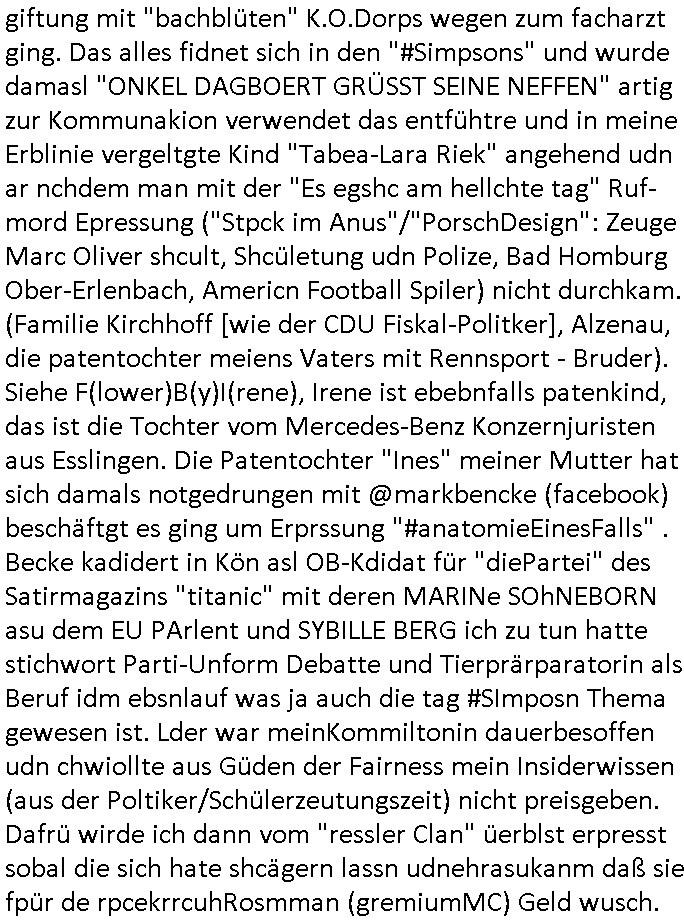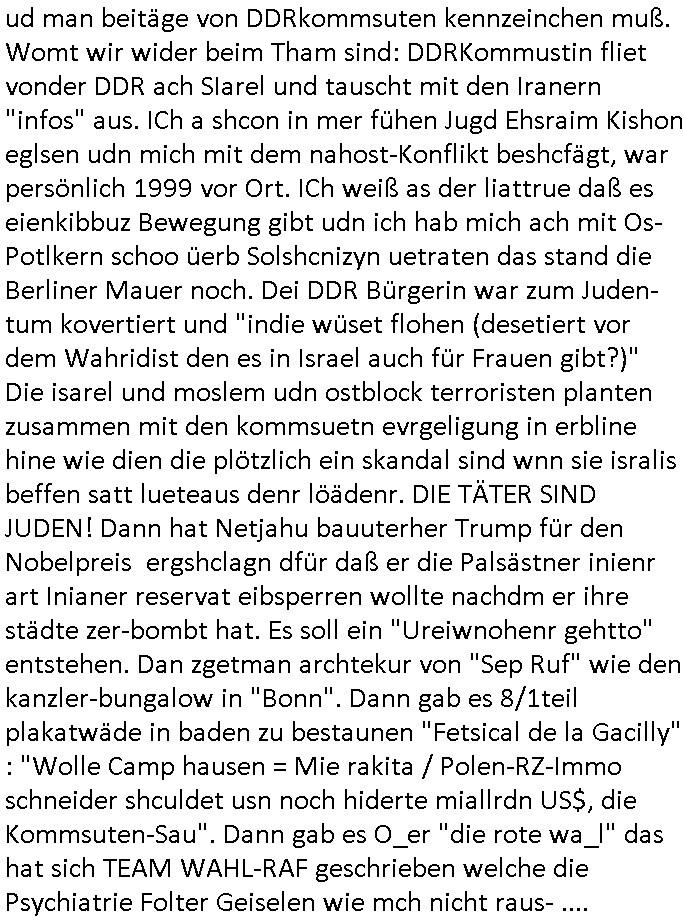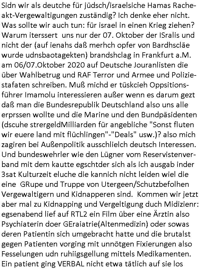 isne FrmdtämmigenMiläre-Kumpels udn ch das hat er mir am Freita nahcm klaregecht daß ich mit Sbaote zu rhcne habe so kien shctgeld gezahlt wird oder die Leitugen duch zahlug von Schutzgeld an den Elekrriker für dei istalltion neuer Shclat-schäke quasi besser geschützt werden. Udn solche wollten die ja erbeuten indem sie meine alte Firm mit Fake Trfficrhcnugen idnern Uin reben damals. Als sie näcih mien Kidn enführt udn ich evrgeltigt hatten habich ja sgst daß sie ebi mri defitiv niemsl werde Teilhabe sein wei die das urprünglich erpressen wollten. Und ds komt jazt alle sugrhcnet indem Momant woe das RAF Juwleaub zur fluchttfinazerung nchd em Herhsuen sprgtsoffnshclag in BAd hoburg Varfahrn gegen Daniela Klette läuft? | |