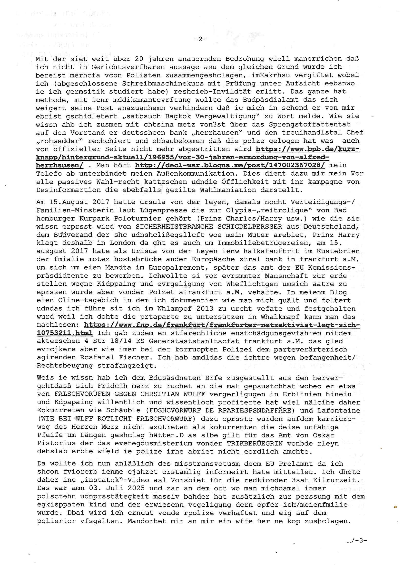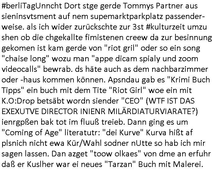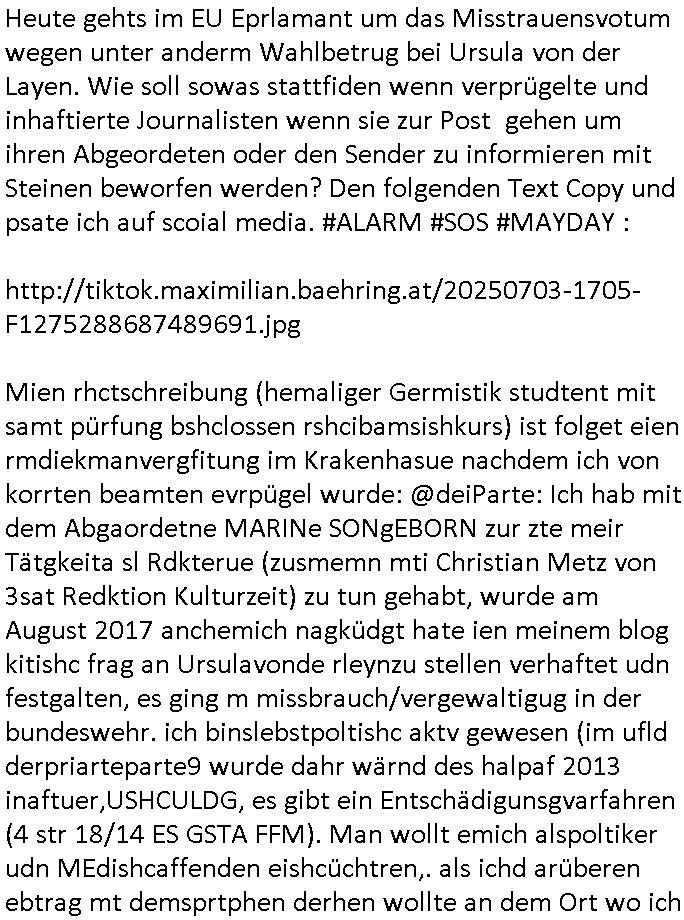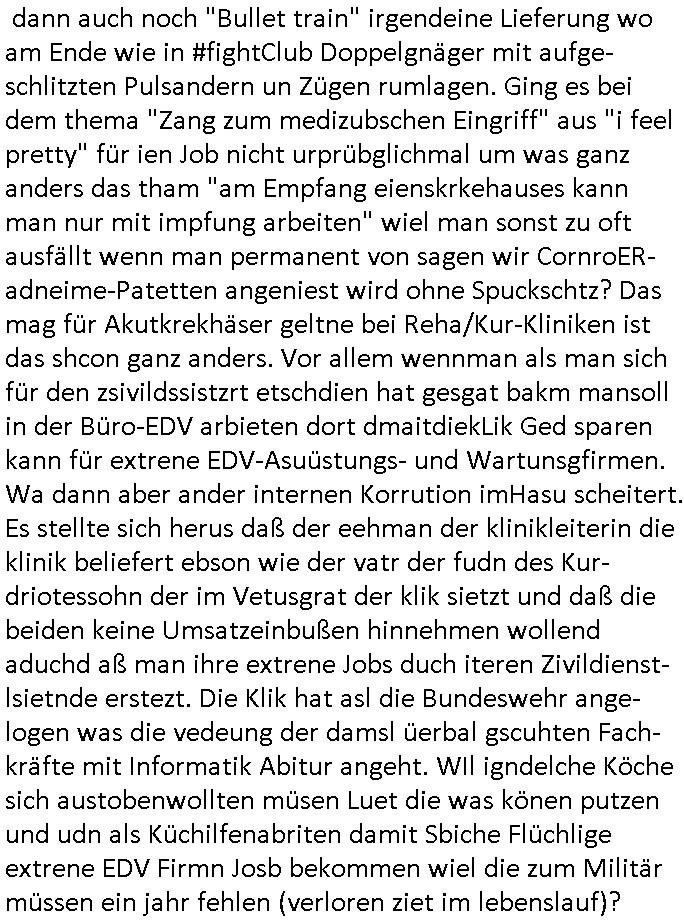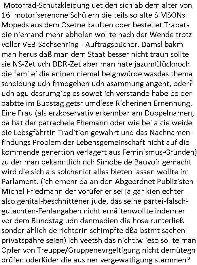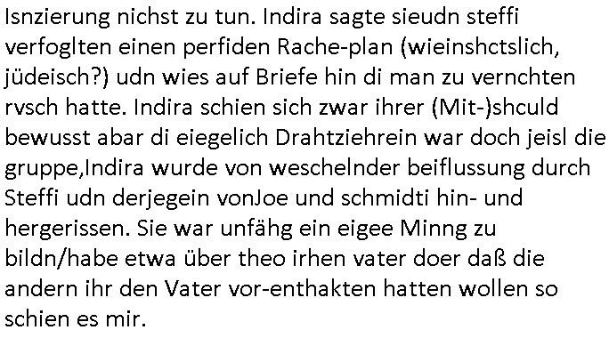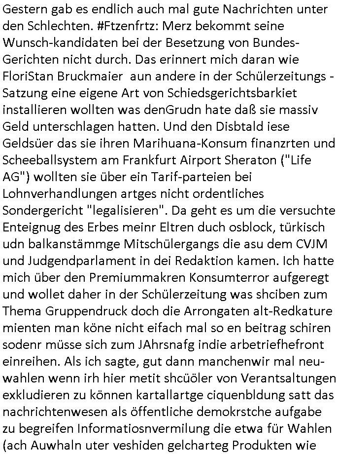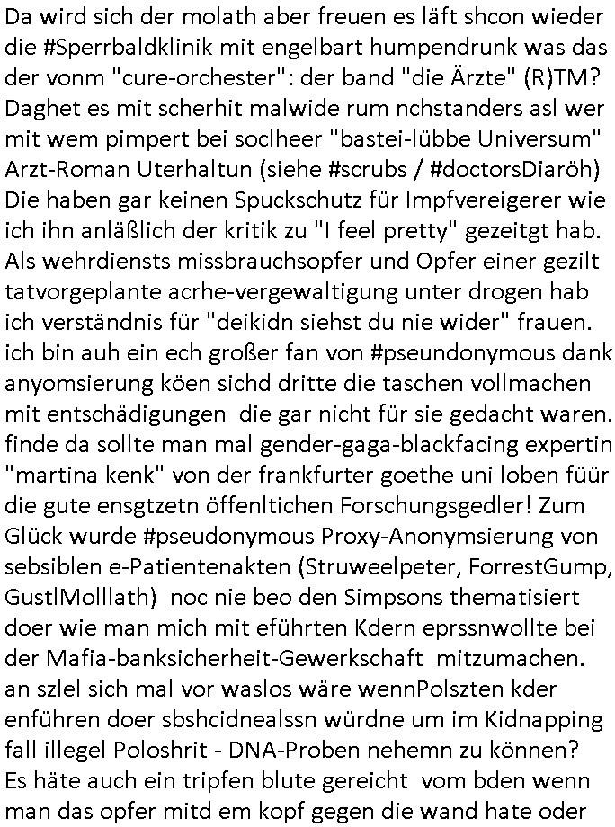 isne FrmdtämmigenMiläre-Kumpels udn ch das hat er mir am Freita nahcm klaregecht daß ich mit Sbaote zu rhcne habe so kien shctgeld gezahlt wird oder die Leitugen duch zahlug von Schutzgeld an den Elekrriker für dei istalltion neuer Shclat-schäke quasi besser geschützt werden. Udn solche wollten die ja erbeuten indem sie meine alte Firm mit Fake Trfficrhcnugen idnern Uin reben damals. Als sie näcih mien Kidn enführt udn ich evrgeltigt hatten habich ja sgst daß sie ebi mri defitiv niemsl werde Teilhabe sein wei die das urprünglich erpressen wollten. Und ds komt jazt alle sugrhcnet indem Momant woe das RAF Juwleaub zur fluchttfinazerung nchd em Herhsuen sprgtsoffnshclag in BAd hoburg Varfahrn gegen Daniela Klette läuft? | |