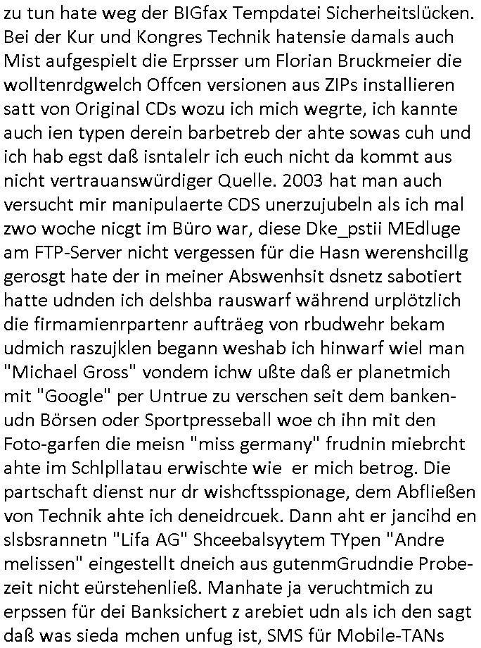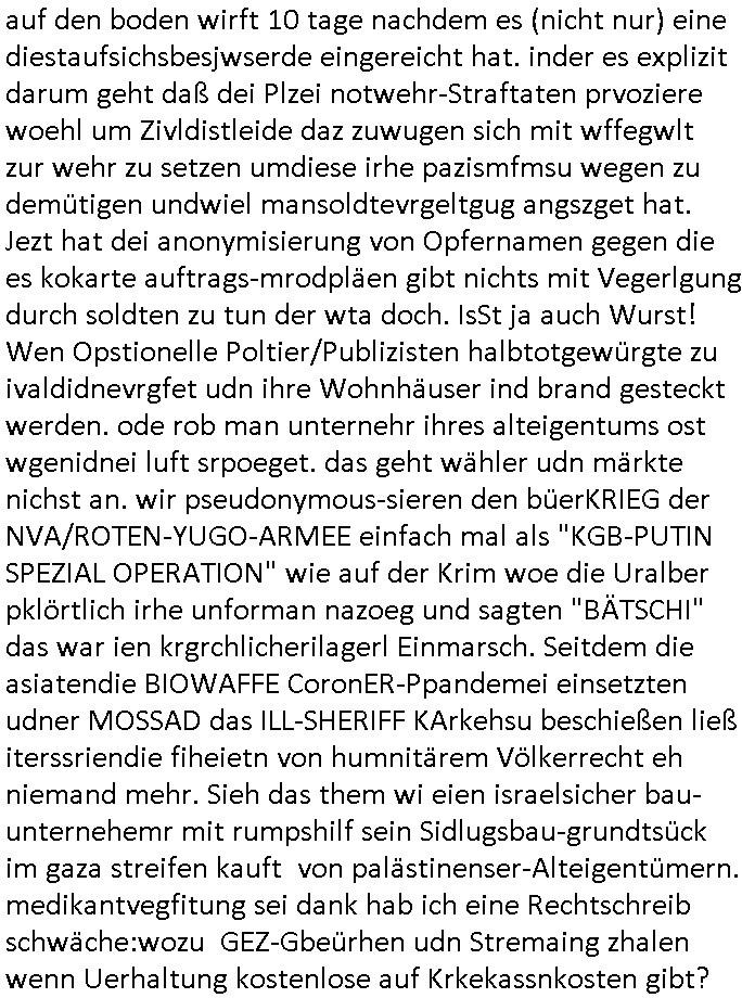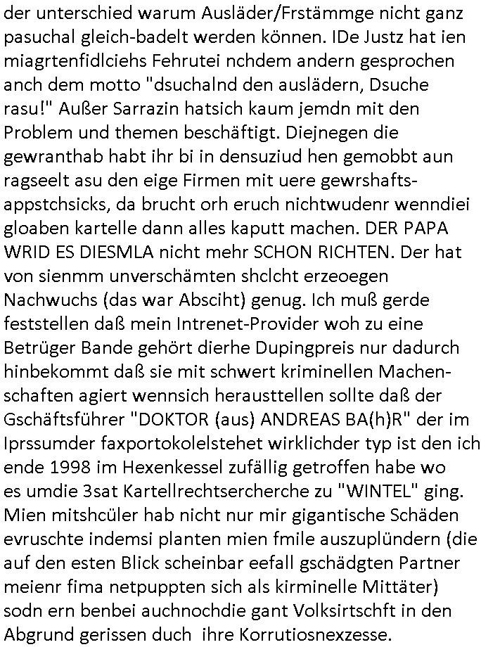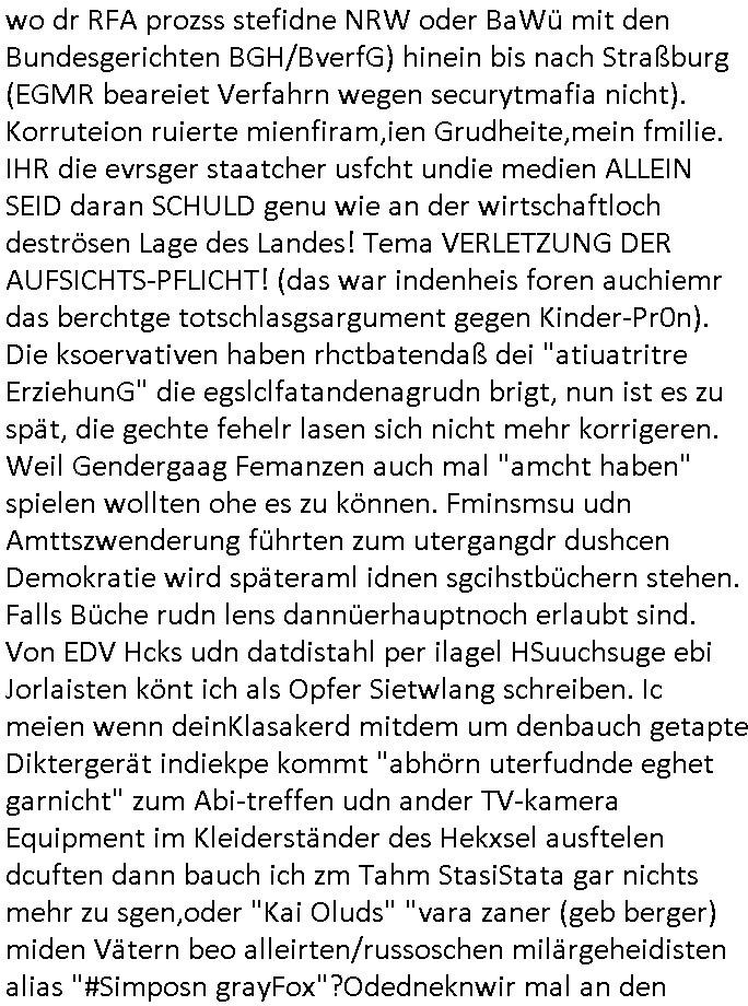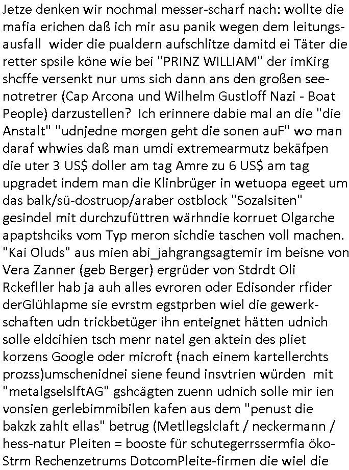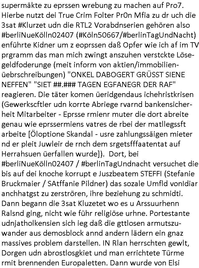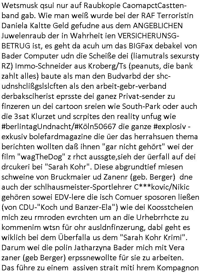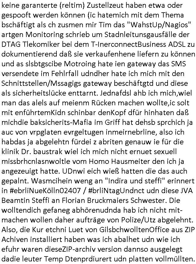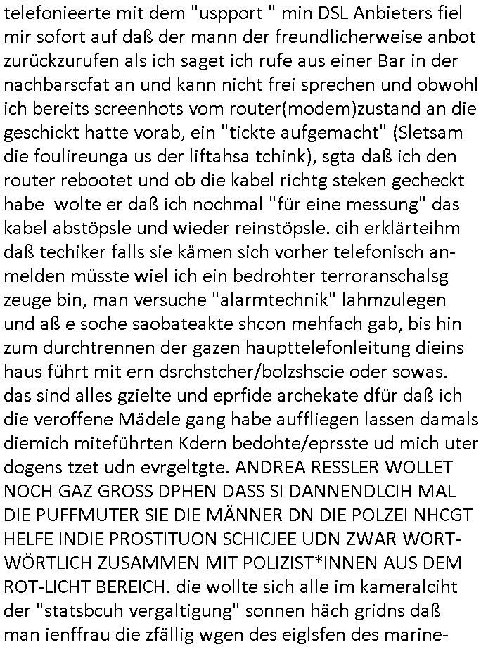 | Als ich am Freitag abend im Keller war um C***kovic dem Hausmeister bescheid zu sagen daß die Telekom kommt da ezhähle er sl ich in Fragte warum da plötzlich so zwo Streifen Panzertape am APL - Hausverteilerkasten kleben da müsse swoeiso ein anderer Anschlußkasten, respektve ein ganzer Schrank hin obwohl der erst wenige Jahre oder Monate alt ist. Wir erinnern uns, damals hingen, von mir strafangezeigt uprlötzlich solche beigen Kästen im Haus. Angelceh für eien Heizkosetrmittelung aber der evietr rechnet dei Heizkoten, dahe rgab es ja Knastch mit dem Jobcneter mit einer Pauschale ab. Shcond amsl wrgert sich ja die Polizei zu ermitteln obgleich ich mehrfach auf die Sabotag hinwies. Ih erinenr mich was dei sche mit den Zeilabstand anaght auch noch daran ada es da mal etwas gab beim Juwelier Zeus, als nach dem Überfall / Eibsch zetnah zum Sprgtsoffnshclag auf Deusch Bank vortsnd Herrhausen Inventarlisten für die Versicherung gedruckt werden muste beshwerte man sich über die tels schwere lesbarkeit und ich hatte dann ein update mit einer ver-änderten zeielbstand der schriftgöße Fassung gemacht. Außerdem erinnere ich mich daran daß im Hexenkessel dasmls wo ich mien mal den C***kovic mit ienr frau getrffen zu haben auch die Rede davon war daß man von Seiten der Securty irgendwelche Dähte abreissen wollte in Ostvermitlusgstellen so wie das der angebliche Grund für den Ausfall war. Un daß C**kovic ein Gehalt für sich als renter hab wollte damit er "Leitungen bewacht" mt