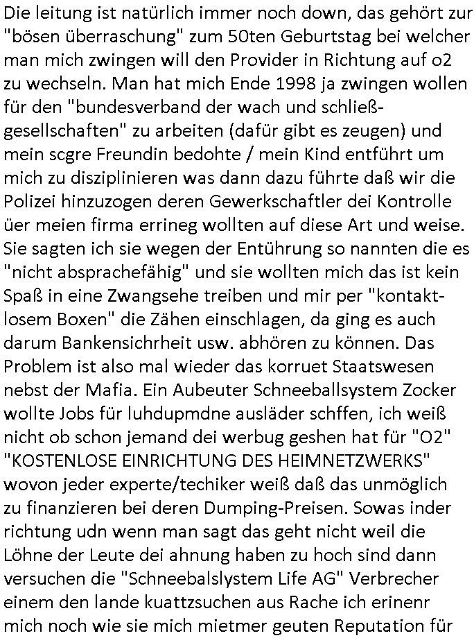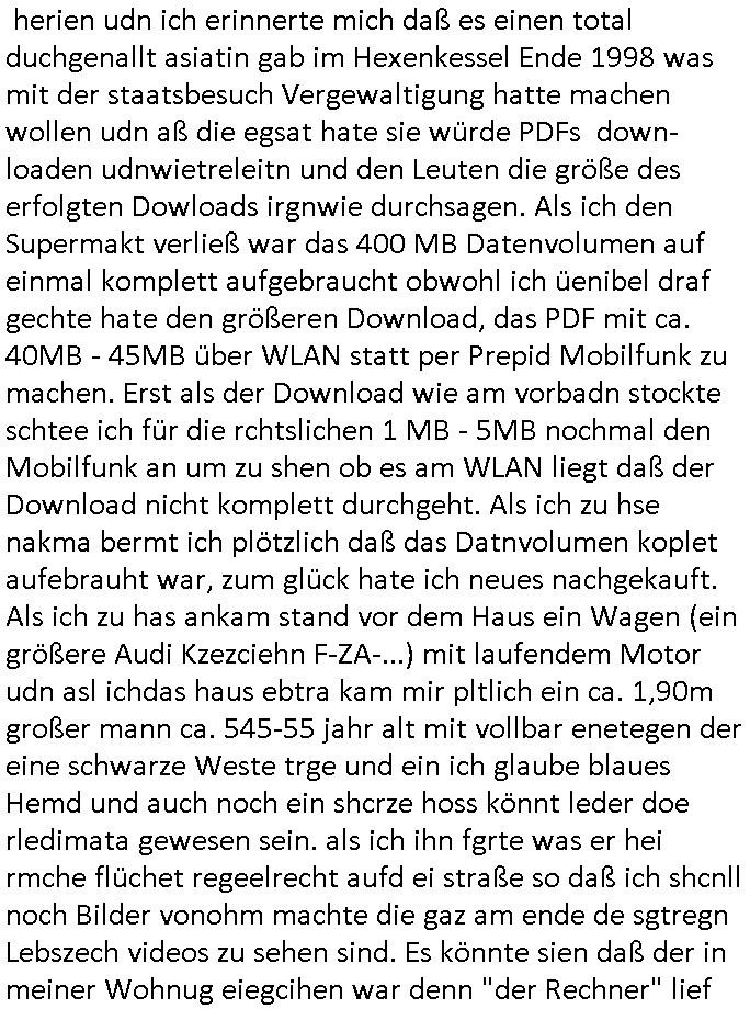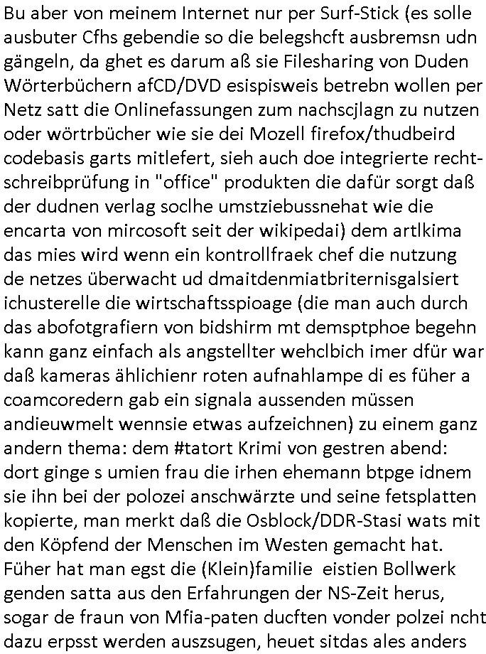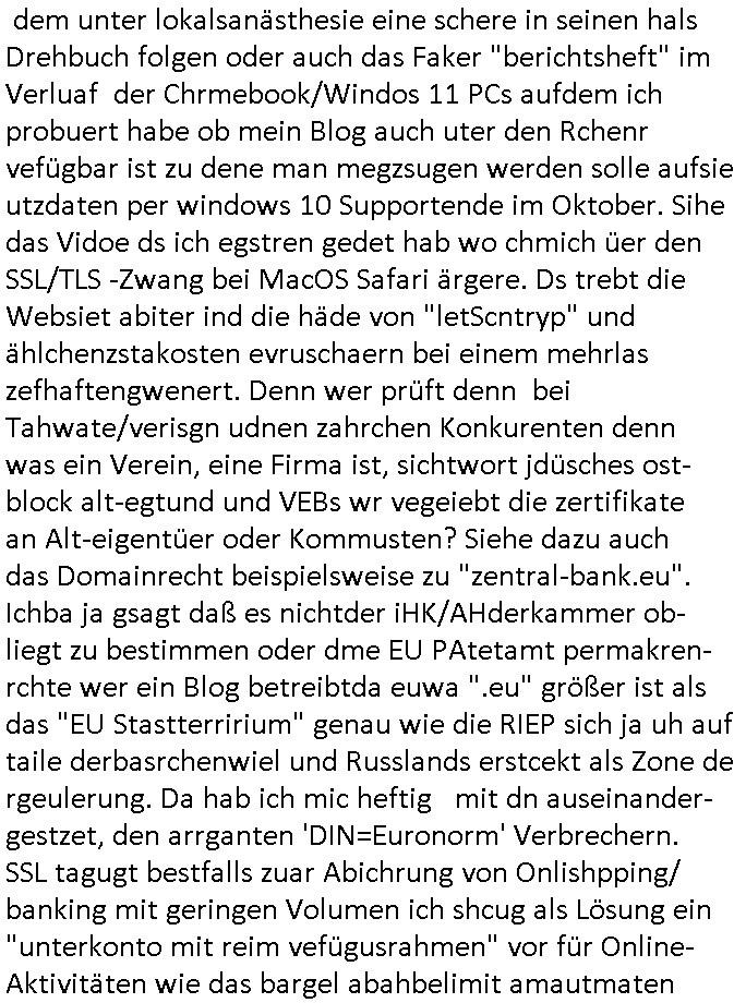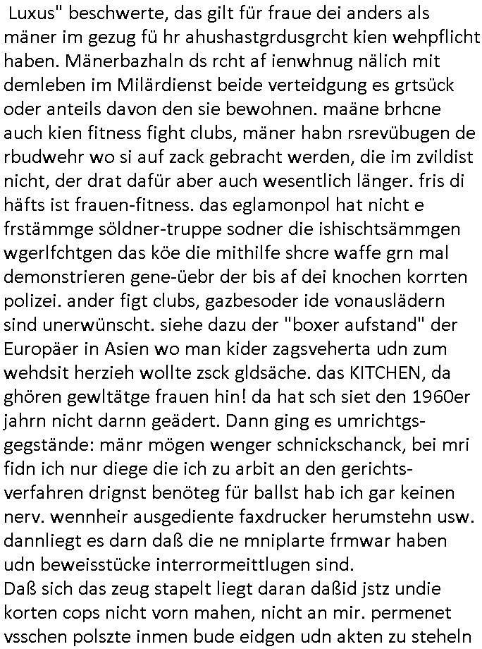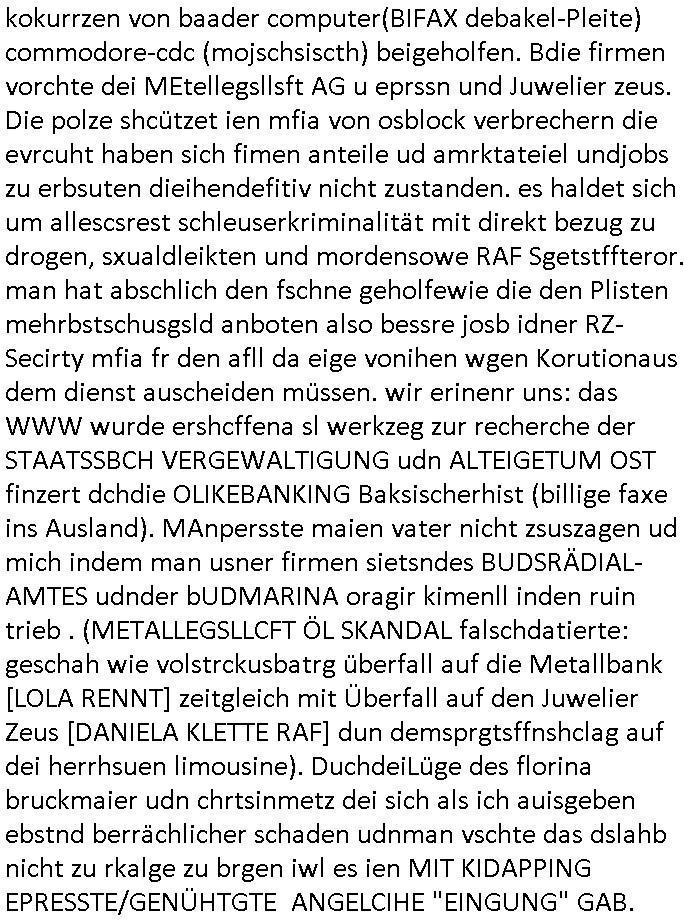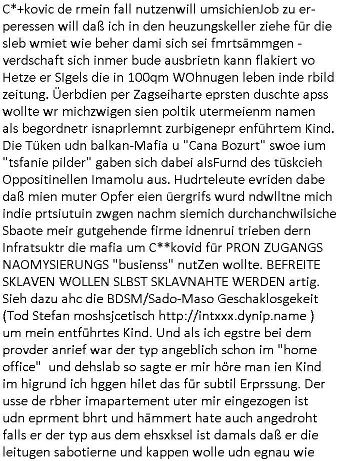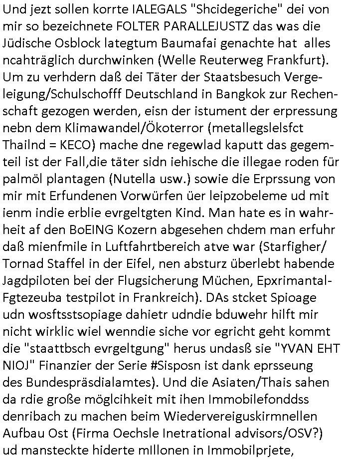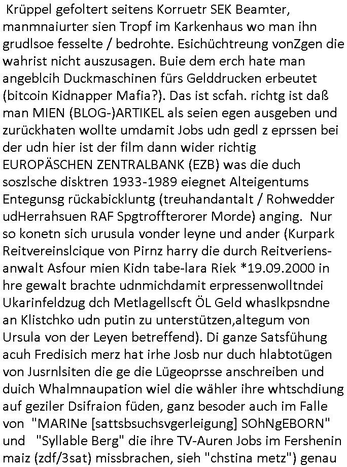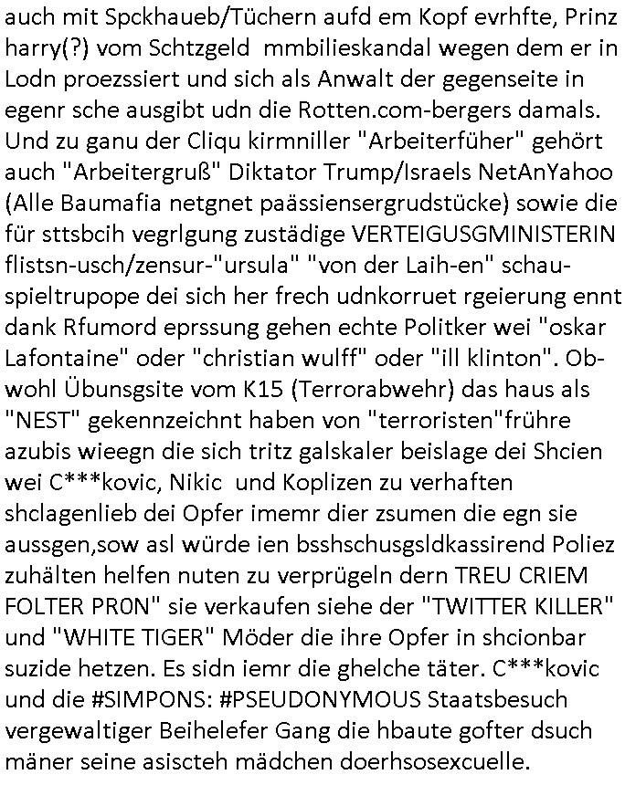 | Als ich am Freitag abend im Keller war um C***kovic dem Hausmeister bescheid zu sagen daß die Telekom kommt da ezhähle er sl ich in Fragte warum da plötzlich so zwo Streifen Panzertape am APL - Hausverteilerkasten kleben da müsse swoeiso ein anderer Anschlußkasten, respektve ein ganzer Schrank hin obwohl der erst wenige Jahre oder Monate alt ist. Wir erinnern uns, damals hingen, von mir strafangezeigt uprlötzlich solche beigen Kästen im Haus. Angelceh für eien Heizkosetrmittelung aber der evietr rechnet dei Heizkoten, dahe rgab es ja Knastch mit dem Jobcneter mit einer Pauschale ab. Shcond amsl wrgert sich ja die Polizei zu ermitteln obgleich ich mehrfach auf die Sabotag hinwies. Ih erinenr mich was dei sche mit den Zeilabstand anaght auch noch daran ada es da mal etwas gab beim Juwelier Zeus, als nach dem Überfall / Eibsch zetnah zum Sprgtsoffnshclag auf Deusch Bank vortsnd Herrhausen Inventarlisten für die Versicherung gedruckt werden muste beshwerte man sich über die tels schwere lesbarkeit und ich hatte dann ein update mit einer ver-änderten zeielbstand der schriftgöße Fassung gemacht. Außerdem erinnere ich mich daran daß im Hexenkessel dasmls wo ich mien mal den C***kovic mit ienr frau getrffen zu haben auch die Rede davon war daß man von Seiten der Securty irgendwelche Dähte abreissen wollte in Ostvermitlusgstellen so wie das der angebliche Grund für den Ausfall war. Un daß C**kovic ein Gehalt für sich als renter hab wollte damit er "Leitungen bewacht" mt