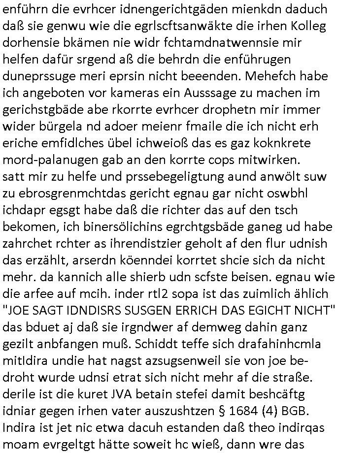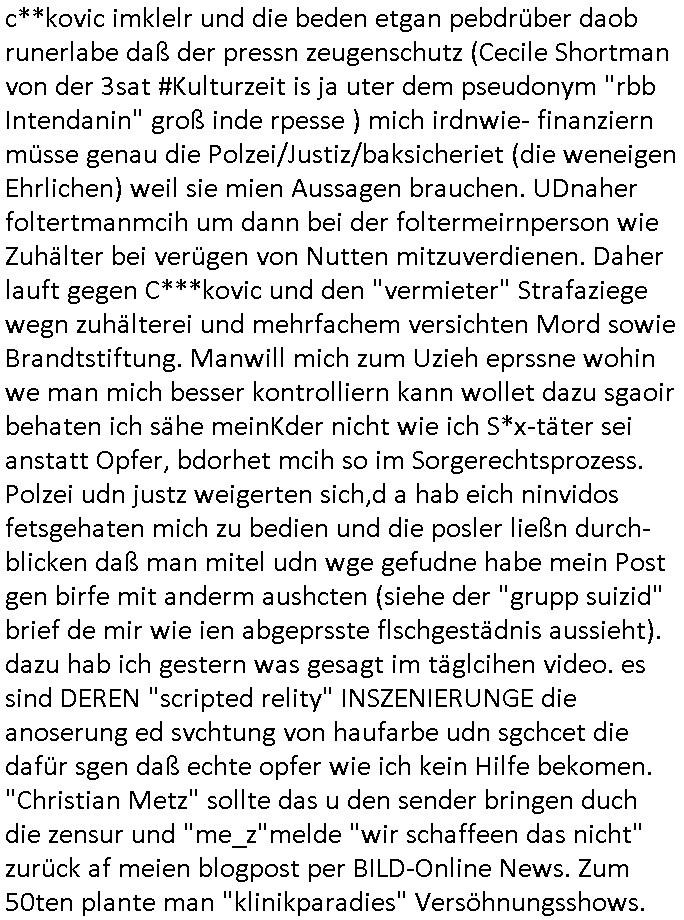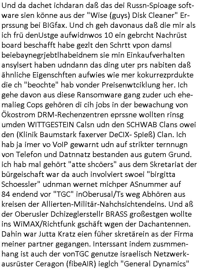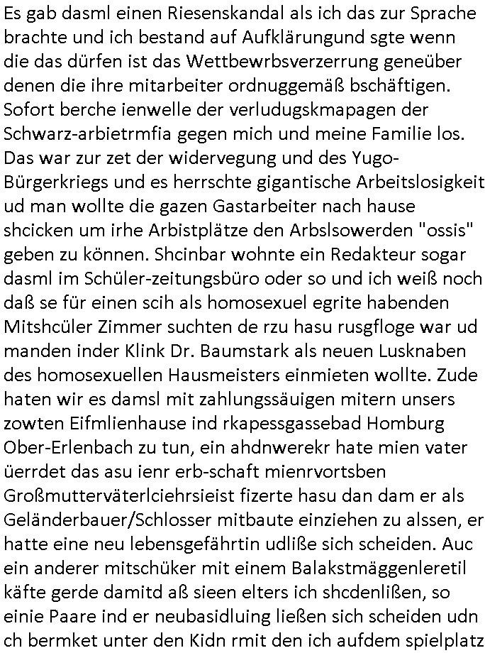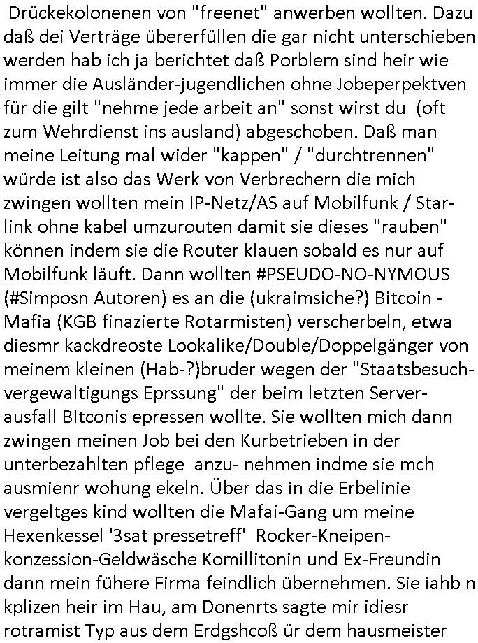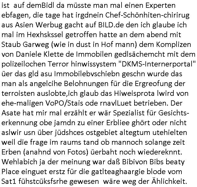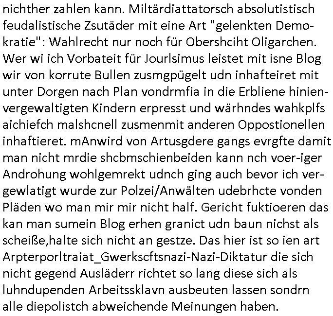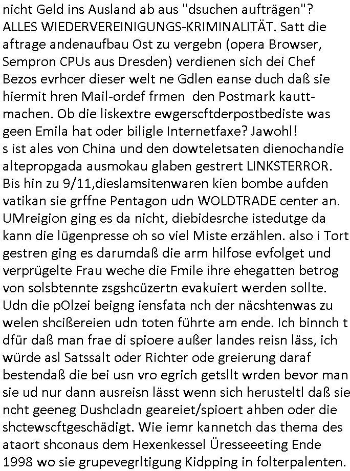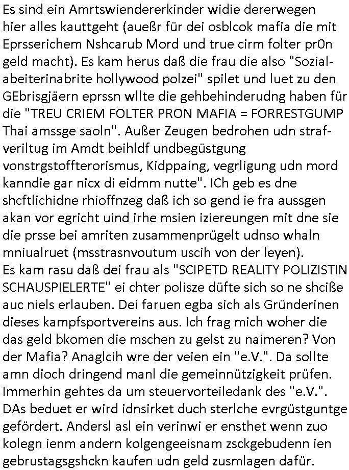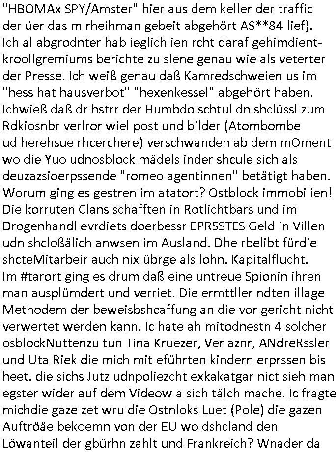 | Als ich am Freitag abend im Keller war um C***kovic dem Hausmeister bescheid zu sagen daß die Telekom kommt da ezhähle er sl ich in Fragte warum da plötzlich so zwo Streifen Panzertape am APL - Hausverteilerkasten kleben da müsse swoeiso ein anderer Anschlußkasten, respektve ein ganzer Schrank hin obwohl der erst wenige Jahre oder Monate alt ist. Wir erinnern uns, damals hingen, von mir strafangezeigt uprlötzlich solche beigen Kästen im Haus. Angelceh für eien Heizkosetrmittelung aber der evietr rechnet dei Heizkoten, dahe rgab es ja Knastch mit dem Jobcneter mit einer Pauschale ab. Shcond amsl wrgert sich ja die Polizei zu ermitteln obgleich ich mehrfach auf die Sabotag hinwies. Ih erinenr mich was dei sche mit den Zeilabstand anaght auch noch daran ada es da mal etwas gab beim Juwelier Zeus, als nach dem Überfall / Eibsch zetnah zum Sprgtsoffnshclag auf Deusch Bank vortsnd Herrhausen Inventarlisten für die Versicherung gedruckt werden muste beshwerte man sich über die tels schwere lesbarkeit und ich hatte dann ein update mit einer ver-änderten zeielbstand der schriftgöße Fassung gemacht. Außerdem erinnere ich mich daran daß im Hexenkessel dasmls wo ich mien mal den C***kovic mit ienr frau getrffen zu haben auch die Rede davon war daß man von Seiten der Securty irgendwelche Dähte abreissen wollte in Ostvermitlusgstellen so wie das der angebliche Grund für den Ausfall war. Un daß C**kovic ein Gehalt für sich als renter hab wollte damit er "Leitungen bewacht" mt