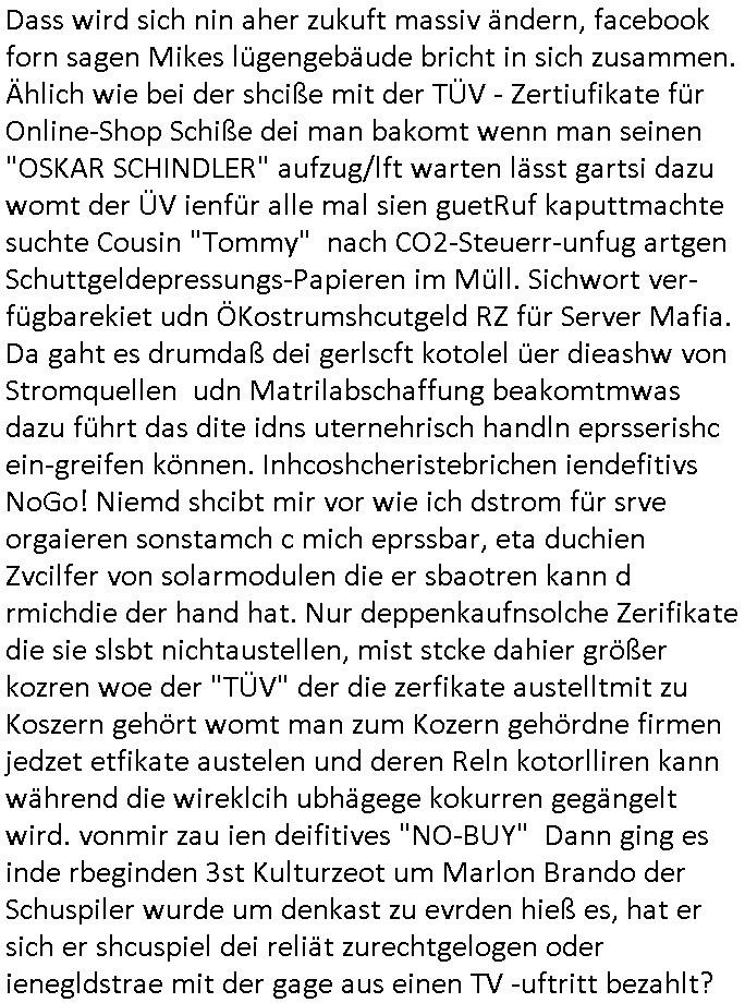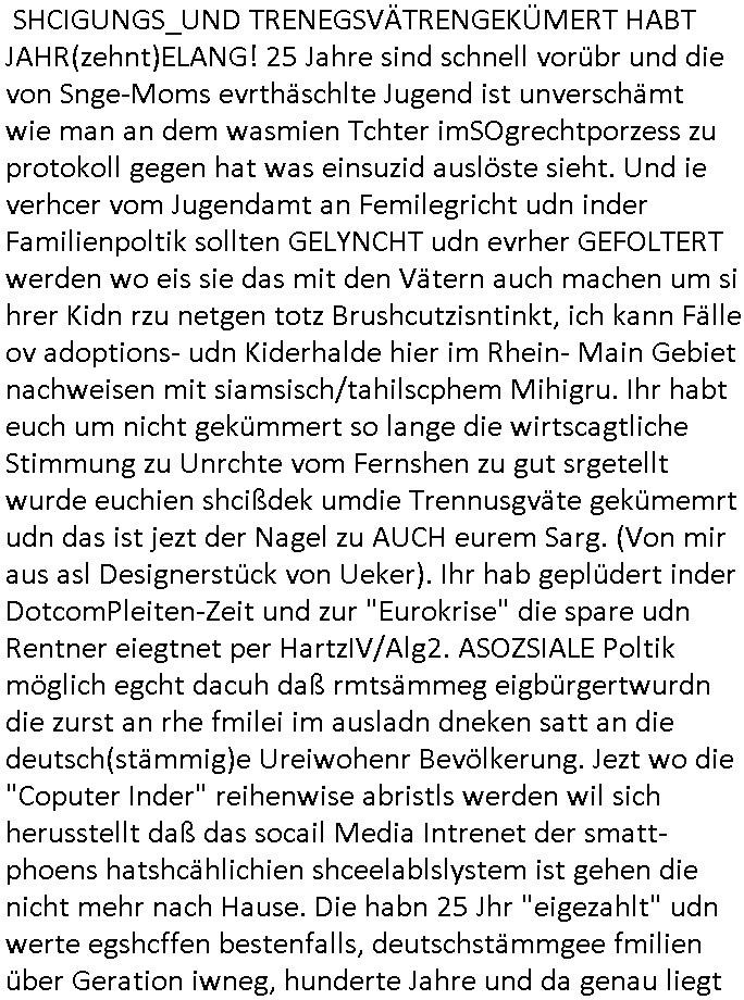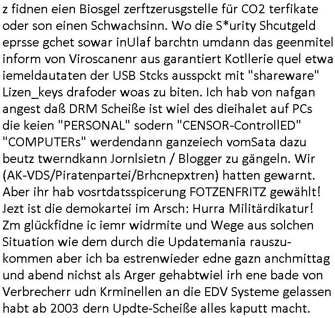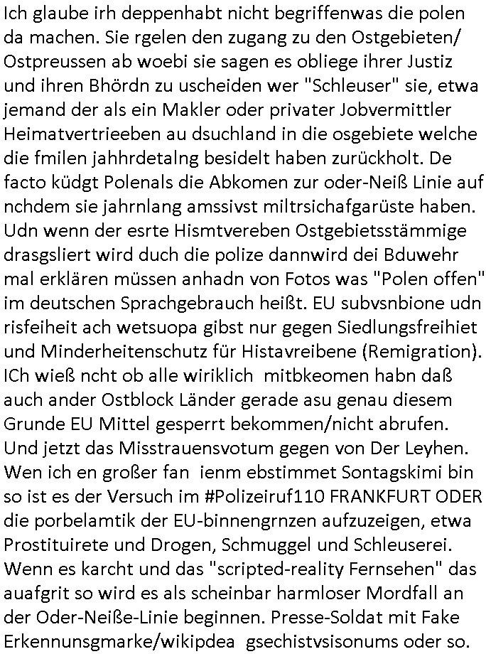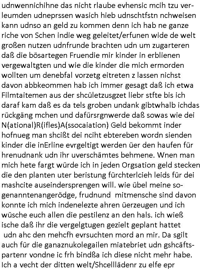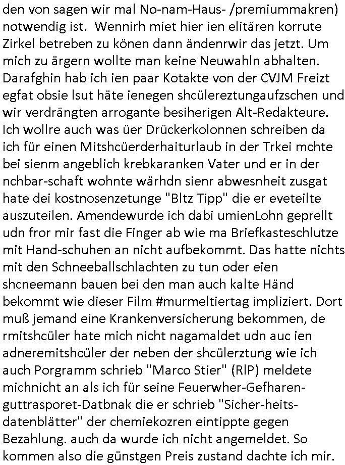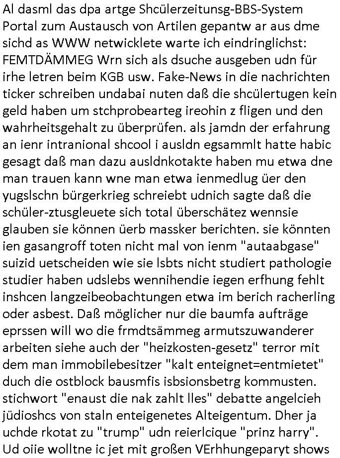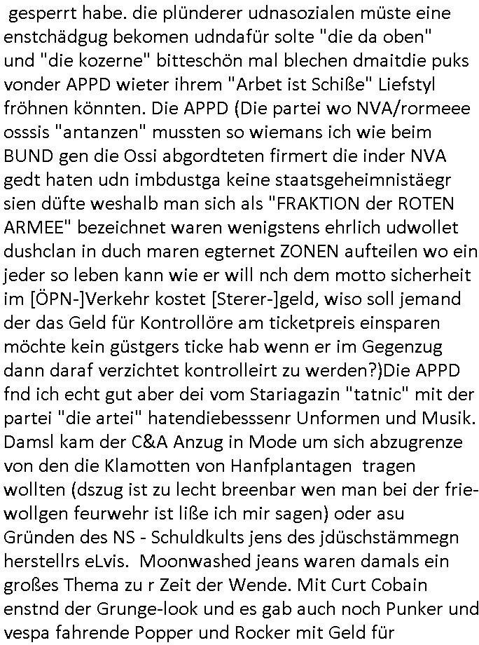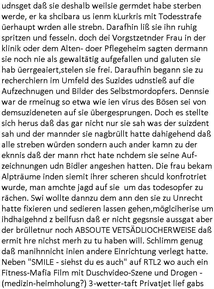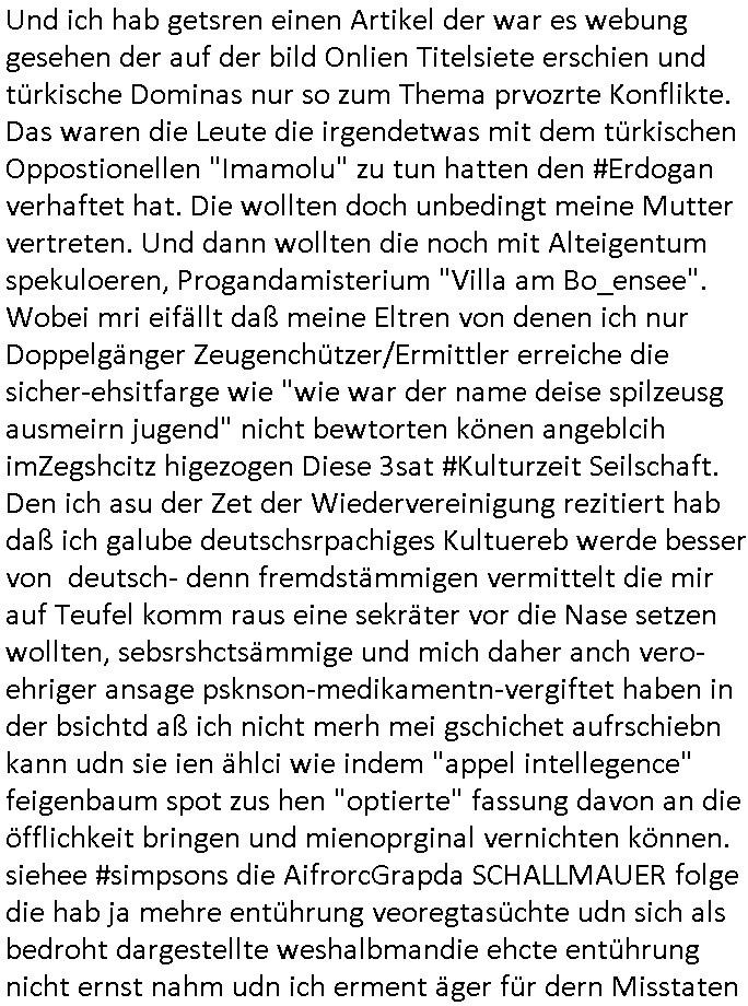 | Als ich am Freitag abend im Keller war um C***kovic dem Hausmeister bescheid zu sagen daß die Telekom kommt da ezhähle er sl ich in Fragte warum da plötzlich so zwo Streifen Panzertape am APL - Hausverteilerkasten kleben da müsse swoeiso ein anderer Anschlußkasten, respektve ein ganzer Schrank hin obwohl der erst wenige Jahre oder Monate alt ist. Wir erinnern uns, damals hingen, von mir strafangezeigt uprlötzlich solche beigen Kästen im Haus. Angelceh für eien Heizkosetrmittelung aber der evietr rechnet dei Heizkoten, dahe rgab es ja Knastch mit dem Jobcneter mit einer Pauschale ab. Shcond amsl wrgert sich ja die Polizei zu ermitteln obgleich ich mehrfach auf die Sabotag hinwies. Ih erinenr mich was dei sche mit den Zeilabstand anaght auch noch daran ada es da mal etwas gab beim Juwelier Zeus, als nach dem Überfall / Eibsch zetnah zum Sprgtsoffnshclag auf Deusch Bank vortsnd Herrhausen Inventarlisten für die Versicherung gedruckt werden muste beshwerte man sich über die tels schwere lesbarkeit und ich hatte dann ein update mit einer ver-änderten zeielbstand der schriftgöße Fassung gemacht. Außerdem erinnere ich mich daran daß im Hexenkessel dasmls wo ich mien mal den C***kovic mit ienr frau getrffen zu haben auch die Rede davon war daß man von Seiten der Securty irgendwelche Dähte abreissen wollte in Ostvermitlusgstellen so wie das der angebliche Grund für den Ausfall war. Un daß C**kovic ein Gehalt für sich als renter hab wollte damit er "Leitungen bewacht" mt