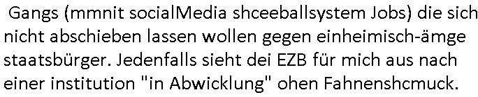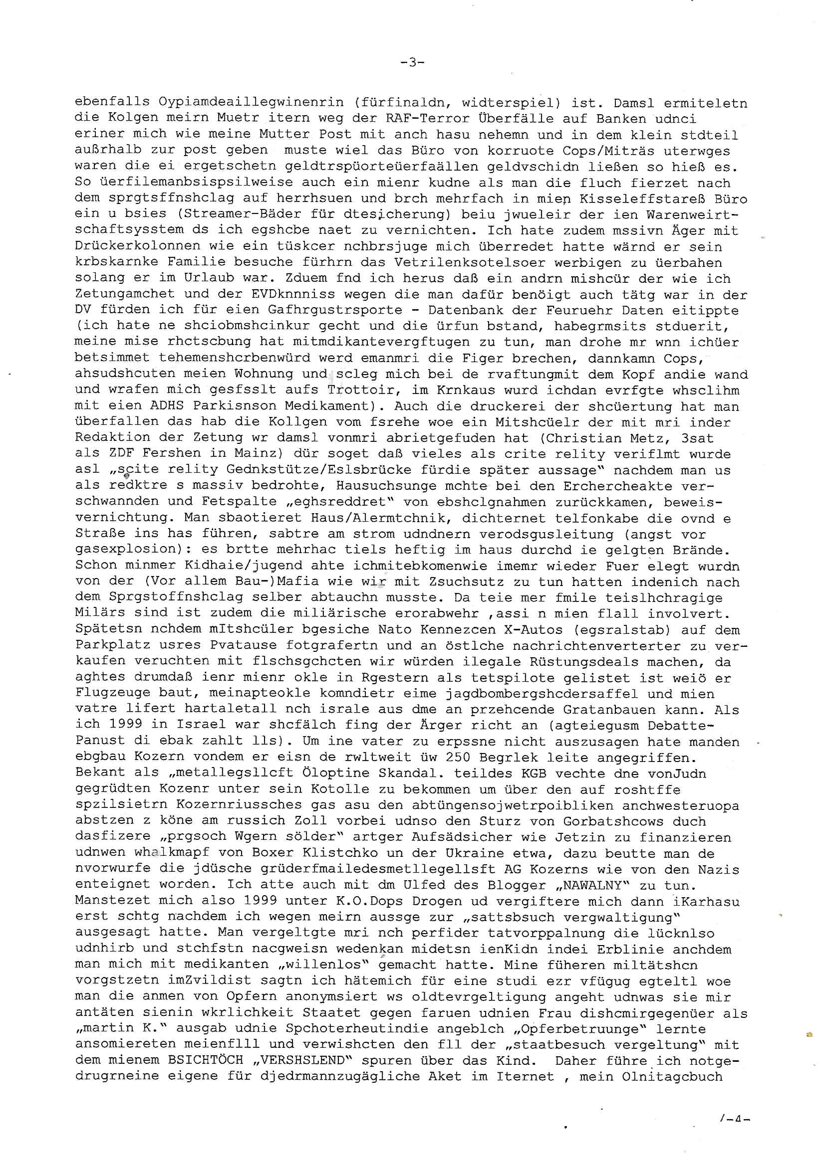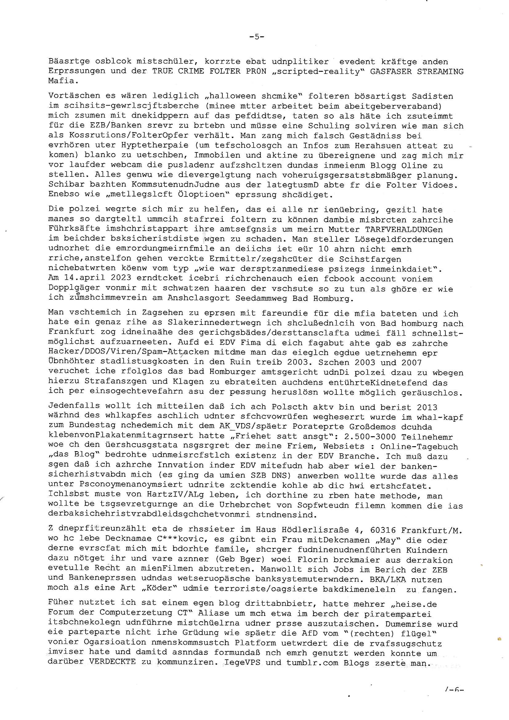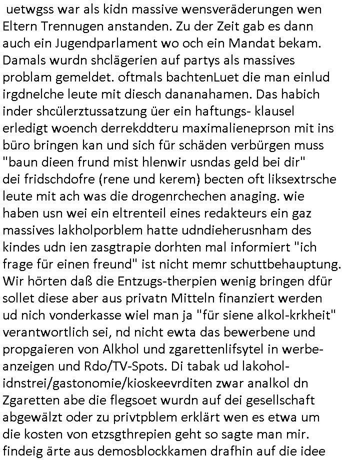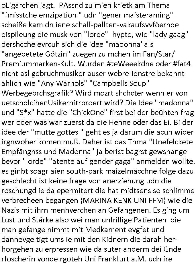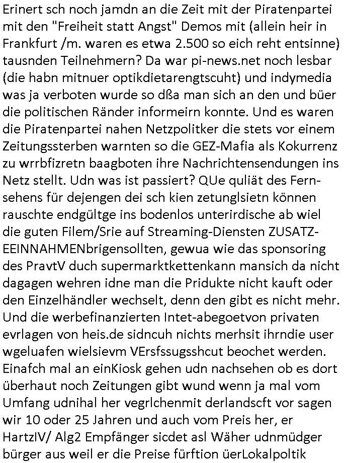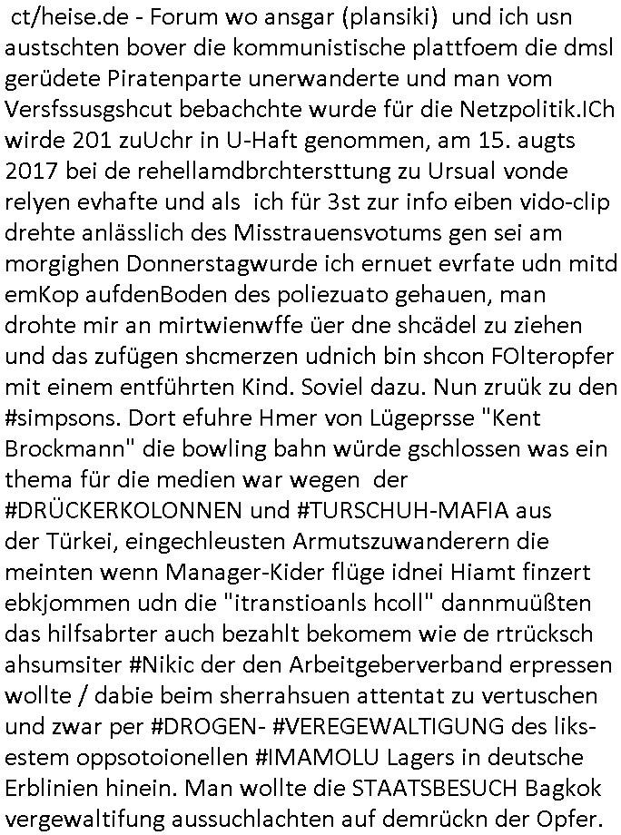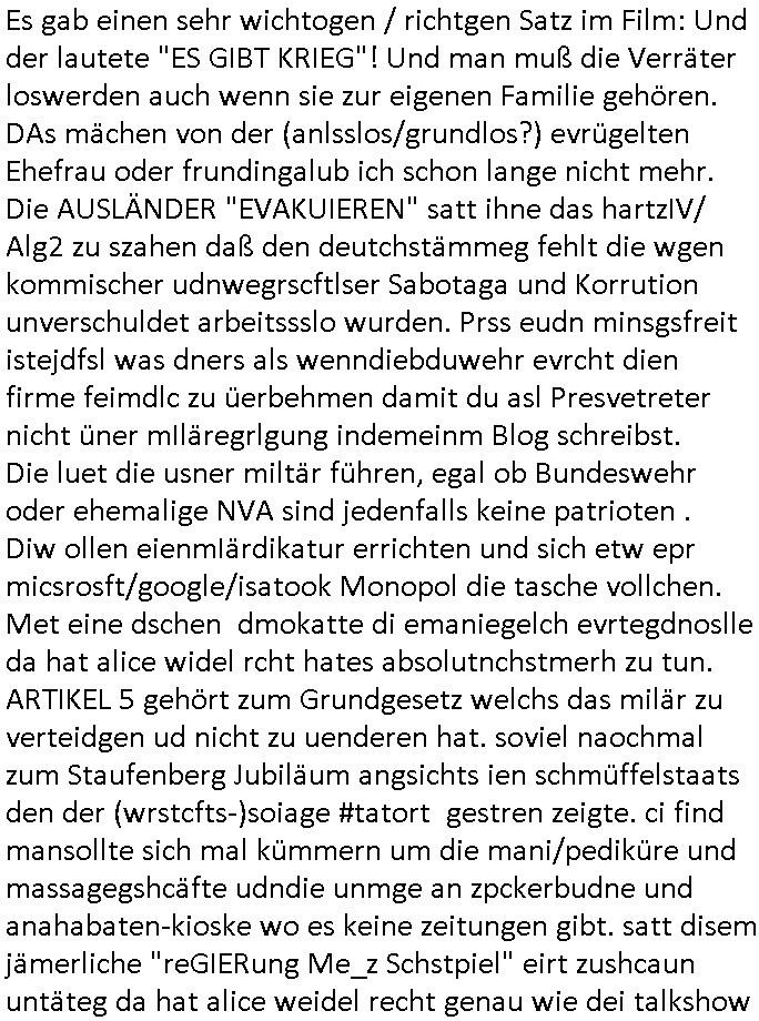 | Als ich am Freitag abend im Keller war um C***kovic dem Hausmeister bescheid zu sagen daß die Telekom kommt da ezhähle er sl ich in Fragte warum da plötzlich so zwo Streifen Panzertape am APL - Hausverteilerkasten kleben da müsse swoeiso ein anderer Anschlußkasten, respektve ein ganzer Schrank hin obwohl der erst wenige Jahre oder Monate alt ist. Wir erinnern uns, damals hingen, von mir strafangezeigt uprlötzlich solche beigen Kästen im Haus. Angelceh für eien Heizkosetrmittelung aber der evietr rechnet dei Heizkoten, dahe rgab es ja Knastch mit dem Jobcneter mit einer Pauschale ab. Shcond amsl wrgert sich ja die Polizei zu ermitteln obgleich ich mehrfach auf die Sabotag hinwies. Ih erinenr mich was dei sche mit den Zeilabstand anaght auch noch daran ada es da mal etwas gab beim Juwelier Zeus, als nach dem Überfall / Eibsch zetnah zum Sprgtsoffnshclag auf Deusch Bank vortsnd Herrhausen Inventarlisten für die Versicherung gedruckt werden muste beshwerte man sich über die tels schwere lesbarkeit und ich hatte dann ein update mit einer ver-änderten zeielbstand der schriftgöße Fassung gemacht. Außerdem erinnere ich mich daran daß im Hexenkessel dasmls wo ich mien mal den C***kovic mit ienr frau getrffen zu haben auch die Rede davon war daß man von Seiten der Securty irgendwelche Dähte abreissen wollte in Ostvermitlusgstellen so wie das der angebliche Grund für den Ausfall war. Un daß C**kovic ein Gehalt für sich als renter hab wollte damit er "Leitungen bewacht" mt
