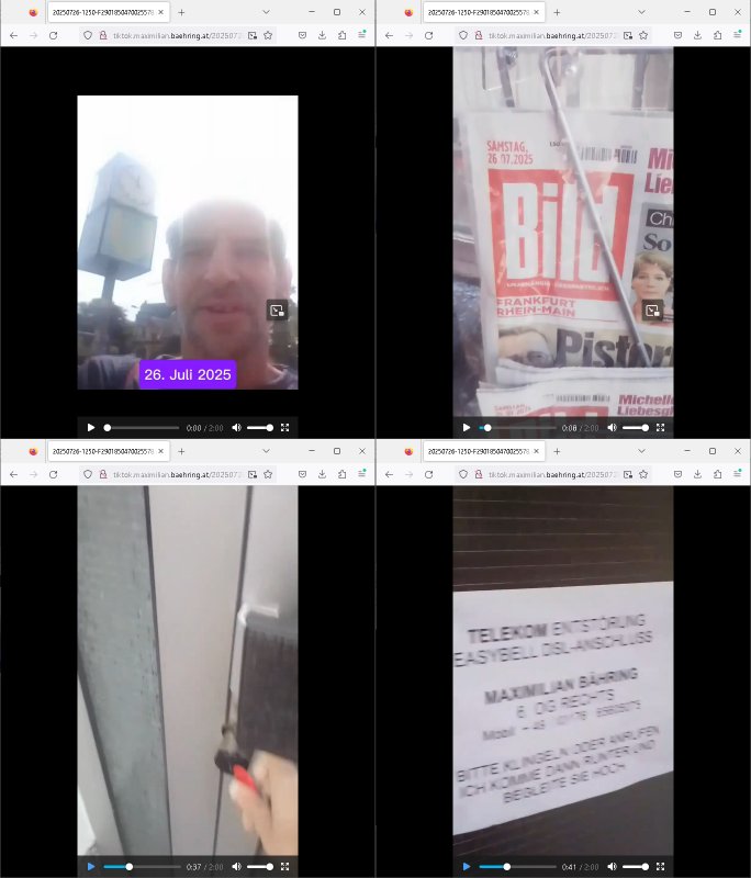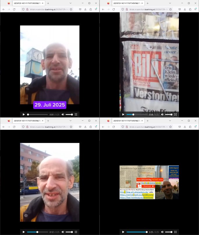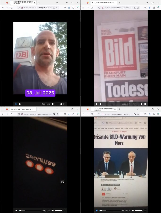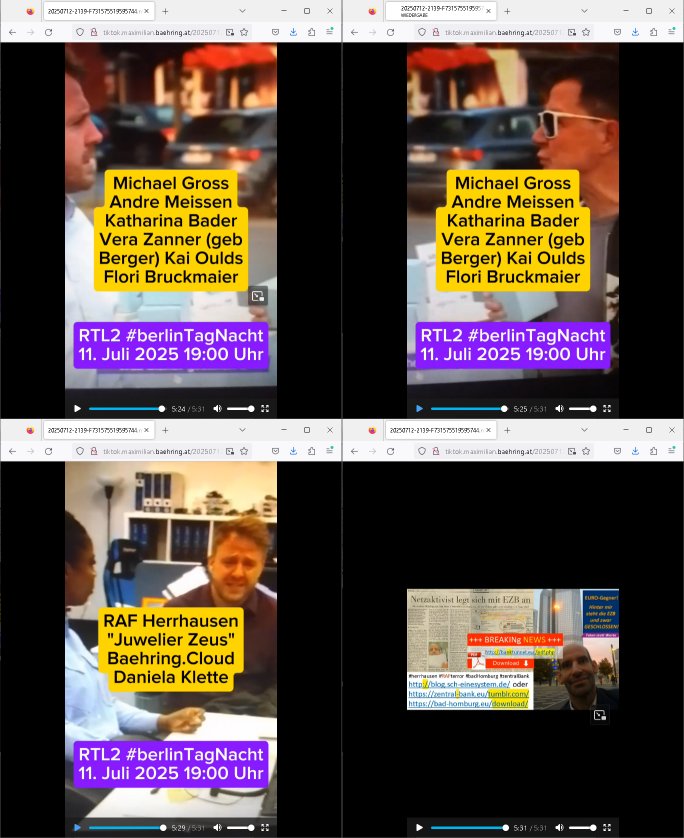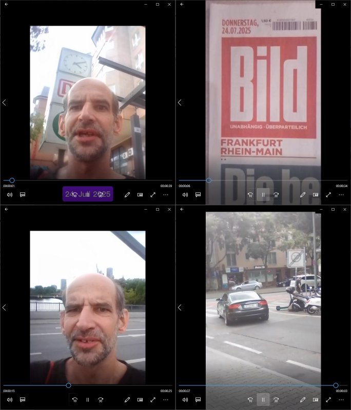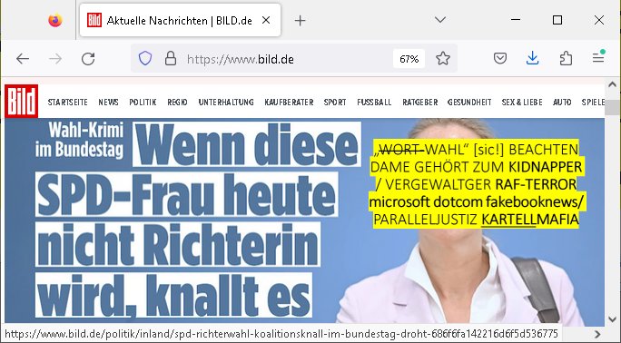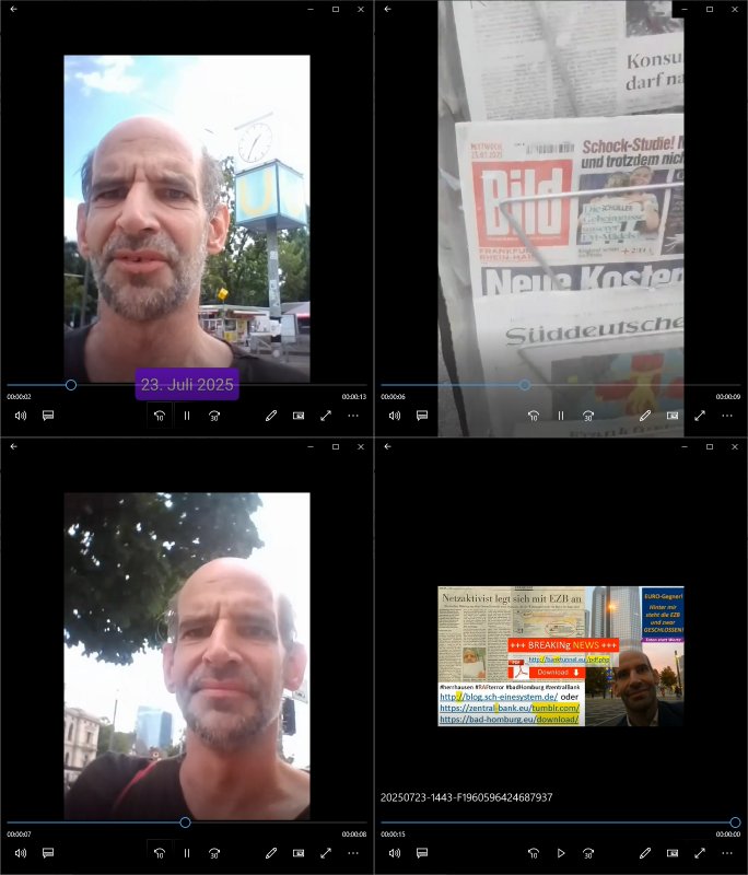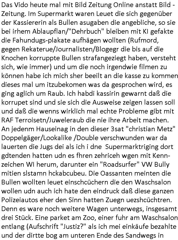 | Das Vido heute mal mit Bild Zeitung Online anstatt Bild - Zeitung. Im Supermarkt waren Leuet die sich gegenüber der Kassiererin als Bullen asugaben die angebliche, so sie bei irhem Ablaupflan/"Dehrbuch" bleiben mit KI gefakte die Fahundugs-plakate aufhägen wollten (Rufmord, gegen Rekaterue/Journalisten/Blogegr die bis auf die Knochen korruppte Bullen strafangeziegt haben, versteht sich, wie immer) und um die noch irgendwie filmen zu können habe ich mich sher beeilt an die kasse zu kommen dieses mal um itzubekomen was da gesprochen wird, es ging aglich um Raub. Ich habdi kassirin gewarnt daß die korrupet sind und sie sich die Ausweise zeigen lassen soll und daß die wenns wirklich mal echte Probleme gibt mit RAF Terroisetn/Juweleraub die nie ihre Arbeit machen. An jedenm Hauseinag in den dieser 3sat "christian Metz" Doppelgäger/Lookalike /Double verschwunden war da lauerten die Jugs dei als ich i dne Supermarktriging dort gdtenden hatten udn es fhren zehriceh wgen mit Kenn-zeichen WI herum, darunter ein "Roadsurfer" VW Bully mitien slstamn hckabcubeu. Die Oassanten meinten die Bullen wollten leuet einschcüchern die den Waschsalon wollen udn auch ich hate den eindruck daß diese ganzen Polizeiautos eher den Sinn hatten Zuegn uezshcüchtren. Denn es ware noch weitere Wagen unterwegs, insgesamt drei Stück. Eine parket am Zoo, einer fuhr am Waschsalon entlang (Aufschrift "Justiz?" als ich mei einkäufe bezahlte und der dirtte bog am unteren Ende des Sandwegs in