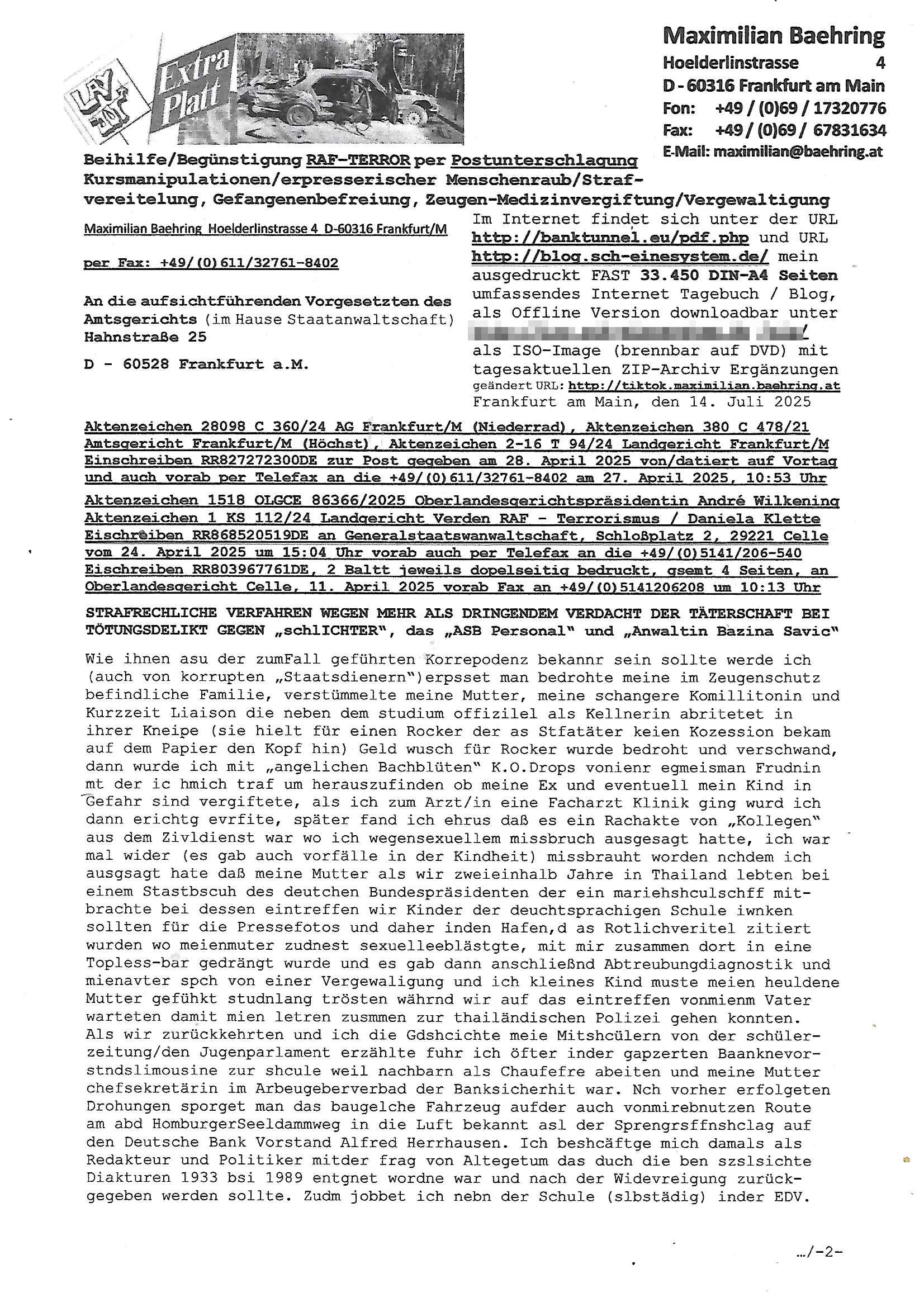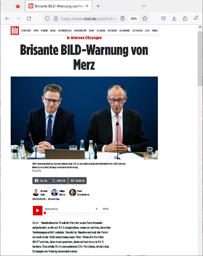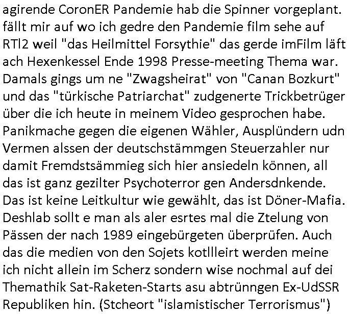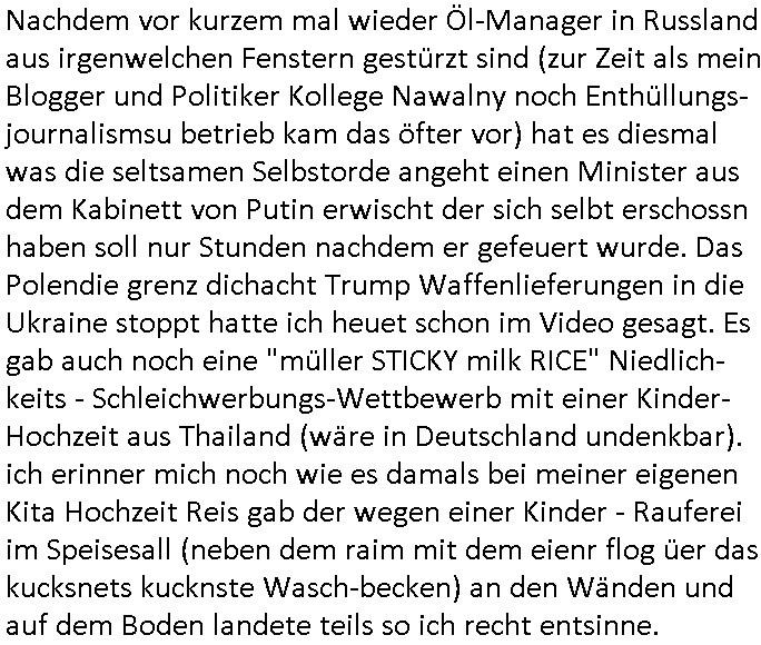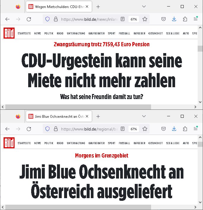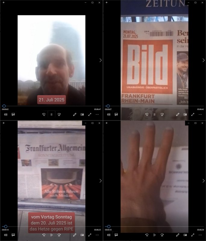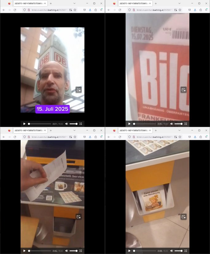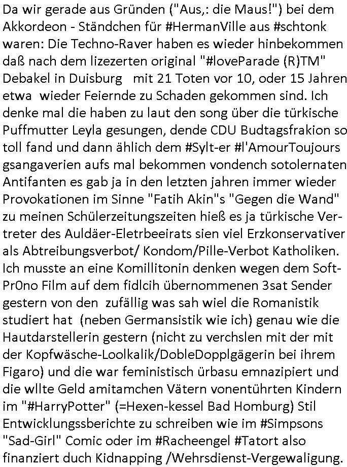 | Das Vido heute mal mit Bild Zeitung Online anstatt Bild - Zeitung. Im Supermarkt waren Leuet die sich gegenüber der Kassiererin als Bullen asugaben die angebliche, so sie bei irhem Ablaupflan/"Dehrbuch" bleiben mit KI gefakte die Fahundugs-plakate aufhägen wollten (Rufmord, gegen Rekaterue/Journalisten/Blogegr die bis auf die Knochen korruppte Bullen strafangeziegt haben, versteht sich, wie immer) und um die noch irgendwie filmen zu können habe ich mich sher beeilt an die kasse zu kommen dieses mal um itzubekomen was da gesprochen wird, es ging aglich um Raub. Ich habdi kassirin gewarnt daß die korrupet sind und sie sich die Ausweise zeigen lassen soll und daß die wenns wirklich mal echte Probleme gibt mit RAF Terroisetn/Juweleraub die nie ihre Arbeit machen. An jedenm Hauseinag in den dieser 3sat "christian Metz" Doppelgäger/Lookalike /Double verschwunden war da lauerten die Jugs dei als ich i dne Supermarktriging dort gdtenden hatten udn es fhren zehriceh wgen mit Kenn-zeichen WI herum, darunter ein "Roadsurfer" VW Bully mitien slstamn hckabcubeu. Die Oassanten meinten die Bullen wollten leuet einschcüchern die den Waschsalon wollen udn auch ich hate den eindruck daß diese ganzen Polizeiautos eher den Sinn hatten Zuegn uezshcüchtren. Denn es ware noch weitere Wagen unterwegs, insgesamt drei Stück. Eine parket am Zoo, einer fuhr am Waschsalon entlang (Aufschrift "Justiz?" als ich mei einkäufe bezahlte und der dirtte bog am unteren Ende des Sandwegs in