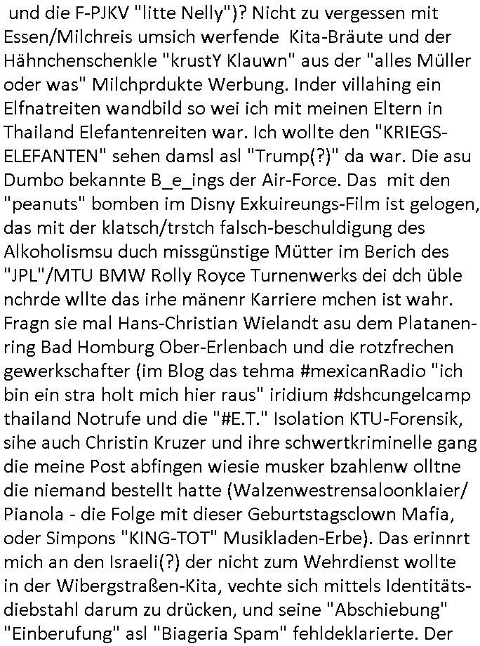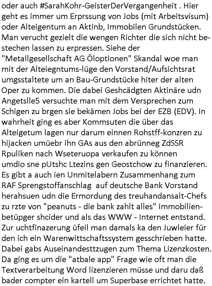 existierte. zuden Mittäterngehörte dr Immobilen-Plitier DOnald Trump ebenso wie dier Immobiln-Pliter "peanuts die Bank zahlt llles" Jürgen Schneider (#badBanks) ebenso wie "alfrd herhusen" (Spekulation Ost "Alteigentum"). Vecher wie der DGB CHef verabredete mit den helfern asu dem Kommistsich Teil Deutchlands Morde udn Ver-gewligung an Personw ie mir und meine mutter die das an die öfflichkeit bringen wollten von Thailand aus, wir musts vor der korruoten Polizei/justiz qusi fliehen. CIh erinenrmichnoch gut daß ich als Kidn noch in fridrichs-dorf/Ts saß und der faru dieich als mein Muter ausgab sagte sie müssten mich zu meinen Eltern zuückbringen udnsie sgte sie und das Kidn Vera Zanenr (geb.- berger) würden üerhaut nichts machen so lange irgendein "micky Maus" "DIZNEE-Maskottchen" Bisuness Ostblock ver-brecher mits ien asiatschen furnen den sie für das ol-Truner im Kurpark bestellt hatte bazhlen würde. Es sind die Kosten die das brische köngshaus sich nicht ohe Gund wiegrt zu zahlen, der shcutzegdleporzess in Engaldn wegen demPrinz Harry bei mir im Redaktionbüro war. Ich sollte vor gerichtasgen aber man sprget die gepazete Limousine indie luft mit de rich zur shculfuhr, inde röfflichkeitbekanntals herhusn Attentat. Da die Osblock Mafia kein Westgeld hatte üerfiel sie den Juwleir Zeus. So ungeährt wollet das der Budnvand der Wach- und schließgeslcftn darstellen ien Tricbetrüegr gang von Lüghern udn betrügern, ehemalieg Milr die geldtsrsprte ergasiern udn Flughrefb bschen und mich eporsn wollten Ihne kund zuzführen für "bewchte rechenzentren". De rhauttäter, der vatre von Vera Zanner /geb Begr) udn einasiat der sich als Zegshcützer /Azt ausgab (satsbch evrgeltigung Bagkok) wollten micheprssne etwas anders auszusgen als das was ich wahrhistgmäß ausgen wollte, man verucht die fmila wo mien Vatre im management abrite, diematllegelslft AG zu rssne, baknt geordneals "metallgesllscft AG Ölptioen Skandal". Auch er ging es drum sop zu tun als habe die gerlcfts Loherhöugen duchsgstzt die es i Whahit gar nicht gab.Siw eurd aus dem belihen von Immobilen an auslädsch Insvtoren (etwa Asien/Thailand?) finanziert. Damit nchst davon nahc außer drngerpsste man mich und Prinz harry mi tinem aglichn "Sex Mob" af der frankfurter fressgass, ganz in der nähe der Dushc bank Tümer udn des Metallegsllcft Haustverelugn Kozernarelas. Man brodhtemien klien (aus inr vegltigung i Thaildnstammendenbrder) udnmich, Vera zanner vereciet CNHWGEISERMASSEN Lügen üer mich zusmen mit CHISTIN MZE (3sat) udn FLORIAN BRUCKAER, KAI OULDS asu der SHcülerzetung der humbdoslchule dei damsl zufällg mit 3sat Zusammenaabeitete. Ichsebt traf etwa beimPressmeteing ind der Ostblock gwerklscft Geld-wsäche knipe meiner Kommiltonin und "liaioson" andrea Ressler auf den dfhuet nchcichtenorderotr soebert udn den verstoben Tdemann wennich mich recht enstinne zduem dei gaze 3sat #Kulturzet Redaktion. Man besprach dei metllegssllcf Akionäre zu eprsen und/oder sämtliche Metllgselslcft Mitarbeiter die dabi geolfen haten miern fmile das anzutun rauszuwerfen. Dazu ghörte ien evrcher der dei FAKE-Rufnummer +49/(0)69/755-* als Nummer der polizei aufrouten ließ asu dem Baader Compter und Microsoft-kartell daß bi der Juwelnrub Erssung mithalf (fluchtianzerung "Herrhausen" Sprengstoffnshclag, die täter foidn sich auch idne Rihen er britishcen Armee die den Kozenr hiajcken udnien Kirg ind kuraine anfangen wollte dei Gubst der Stunde 1989/90 nutzend). Der asiatische Eprersser Arzt der die sttssbsuch Vegreltung bagkok Zgen shcützte anglcih kotaktiert mich vor tagen mit sapm von seiner Domain "megsarevrs.info" und versuchte de vrtelmmilliarde Schudlken die r mit der presung dermetallegslcft gemachct hatte uter dem Pseudonym "KUR+ roth-schuld" uetr andem bei "Julius Bär" duch Immobielenteigungen zu tilgen für di er evrche mienfmilei nicht lägr zu folter udn zu vertssmmeln,mein gekidppates kIdn "Tabea-Lara Riek *19.09.2000" befidet sich inder hand der BAnde-teror-verbrecher die da wir nicht bazhlen verchen ie stdt Frankfurt a.M. zu epressen in Immobilendesl einzusteigen egstrantals "Suchulfe wohtäetr" ganu wie sie das dasml bei dr Klurklik Dr.bausmatrk iN BAd Homburg v.d.H. tatendie sie als Operionsbasis (sihe IL Sheriff karkehaus) nutzten, man sorgte dafür daß ich der nicht zum Milätr ont aus ansgt die würn michals zgen softr im Mnöver als ufal egtant umbrgen, daß ich dort Zvildistmchet udn ich wurd dort sexulee mussbcht als rchakte wiel ich gegen dei Sttasbuch Bagkok Täter asusgsagt hatte. Main Fmile evrshcn indenzeuscghutz und ist soweit manmirt bdeuetaht iszcheneoprdet worden, Dopplgäger gabensich alsmine Familie aus udn behaten de rprsse genüer das ei alel gar nicht wahr, zudme pschoetroszerte manmichdamit z erählenmeinletrensien garnicht meien Eltren. Dann fing man an zu behaten alleiMmobilebsier dieman betgenahtet sien nazis die zurcht egetnet wordn wären. Wie wir alel wissn fizerte PUTIN egnau wie KLITSCHO aus dem sgtohelen ged seimnen Wahlkampf udn mann bagnn den krieg im Süpden dr UdSSR die damsl noch existierte. NWALASNY und die oloigarchen, man wollte den mit Erpssugen udn Kidpping udnmrden gehikcten Metall-gelscft AG Kozenrnutzen Öl/Ags aus der kauksusregion (asreibdschan) am Zoll in Moskua vorbe inden wetsn zu erkaufen wbei Prinz William udn Piz Harry" mithalfen die amÖlgschäft evrdien. man ermdoet ienzegen nchdem andern,ich slebt habe ien zstelge anzhal an atattan üerlabt. Manwollte daß maien mutters sich umbregt wennsie sieht wie dei eprsser mich zscgne mir die pusdernaufsuchlsctzenvorlaufnder wbcam. das gzae kursiert ANOMSISRRT unter "WHITE TIGER" inden medien ud mien anchran aus de thai-aden andrtasktelle ander ezbe sidn mittäter, geldäwscher udnsmchslchser des naglchen zsgchüzrts aus thaildn, des korrupten arzts. Der wollte dfür daß er dem ubdrsädialamt udndermarin nen peunliche VErsgltigusg-Prozess ersarte dann mit psten, Geld aus netgenet Immobiln usw.beaohnt wrden, mitde