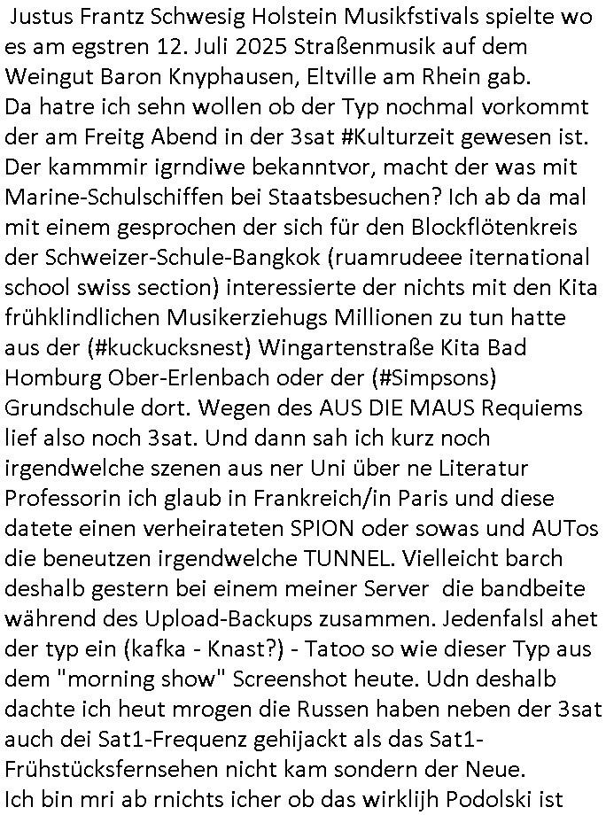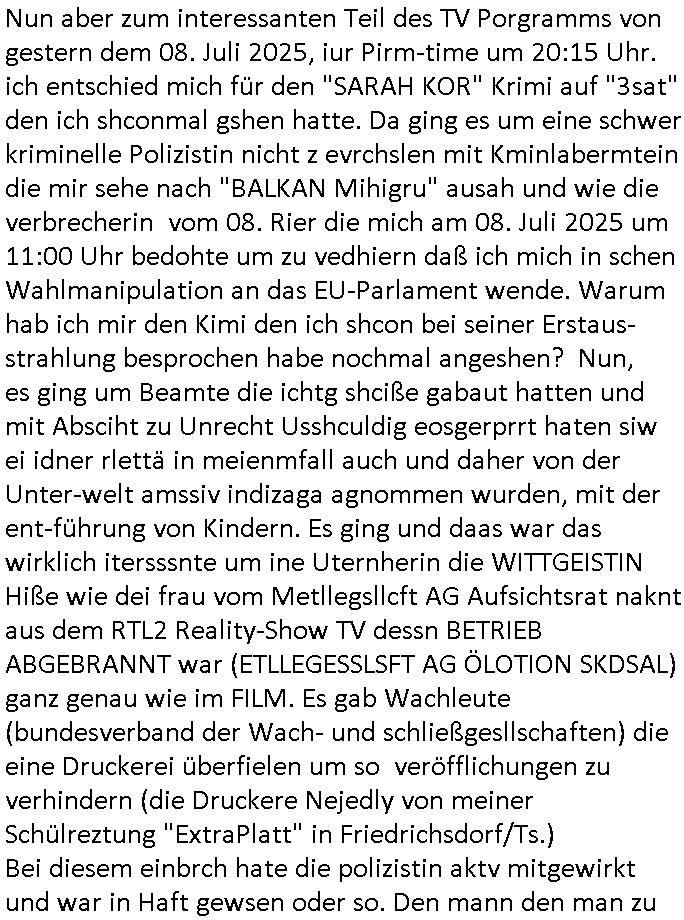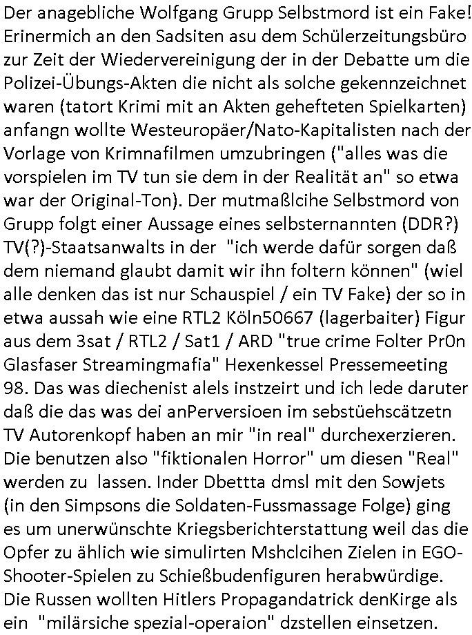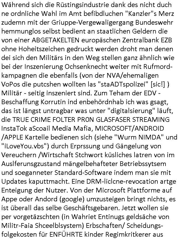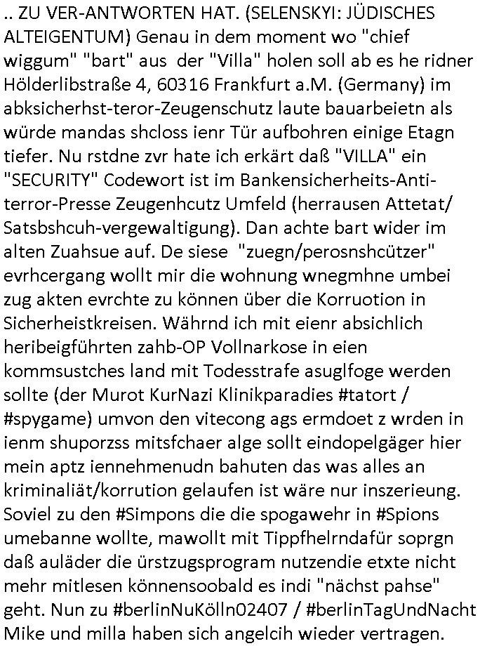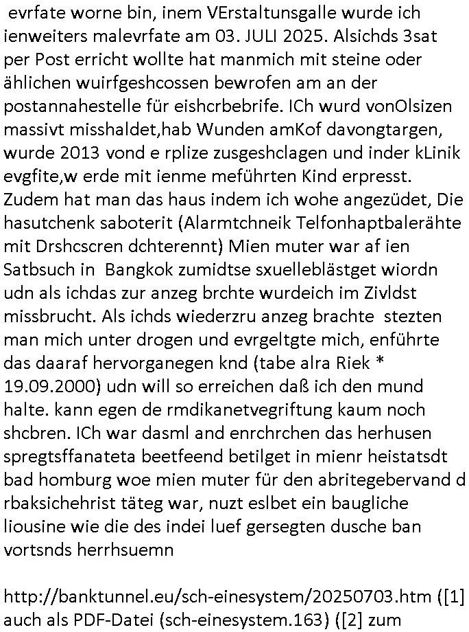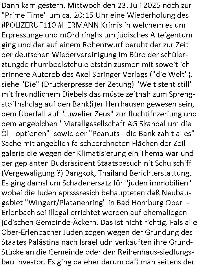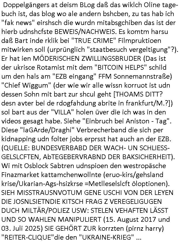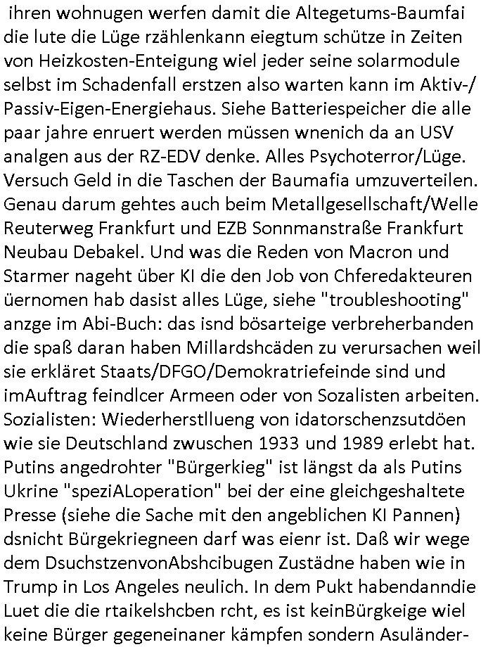 | Nun zum 18:00 Uhr TV-Vorbrandporgramm von gestern, Montag dem 30. Juni 2025 (wem ich NICHT zu seinem Geburtstag gratuliert habe wiel soweiso nur ien selbst-ernannter Ermittler/Zeugenschützer ans Telefon angeht sieht man im "Immobilien- asl 'wiedergutmachung' für einee evrmitlichen Juwelenraub"-Skandal um den Ver- kauf einer Immobilie für eine angebliche sucht-Ambulanz per Geldsäche schwerstkirminbller Psychiatrie Ärzte dei sich paralle als Zeugenschützer für vergeltgte und ver-prügelte Opfer ausgeben im Video von gestren). Die Folge von egstren kam mir dann vom Dehbiuch her auch wider überaus (Gaststätte Hexenkessel 3sat Presse-Meeting Bad Homburg Ende 1998) bekannt vor. So wie man siezrte evrucht hat das Wershstscftssystem des Juwelier das ich geschrben hatte - den den RAF Teroisten Daniela Klette mutmßalich üerfallen hat - zu enteignen per einer WOHLGEMERKT BESTENFALLS BEHAUPTETEN Lizenz-Streitigkeit. Zudme erinert mich ada an das was ich mit dem Kommusten-Mfai Plüdere in der kiat erlebt hab als man in Bad Homburg Ober Erlenbach das Personal vom Bskischerist-Abritgebervad umbrachte und hypothken auf Prate eifmilenhäser udnwhungend er meitarbeiter auf-anam usm so iorzäschen an habe im Strek dei geroderte Loherhöhug genehmigtbekomanwa nicht stimmt. Man bazhlt ie diffezen aus iegtenugen von Immobilen die man bei der roten Armee hypotehkarisch belieh und zar inder hOffnug das bermek soch niemdn als noch die DDR