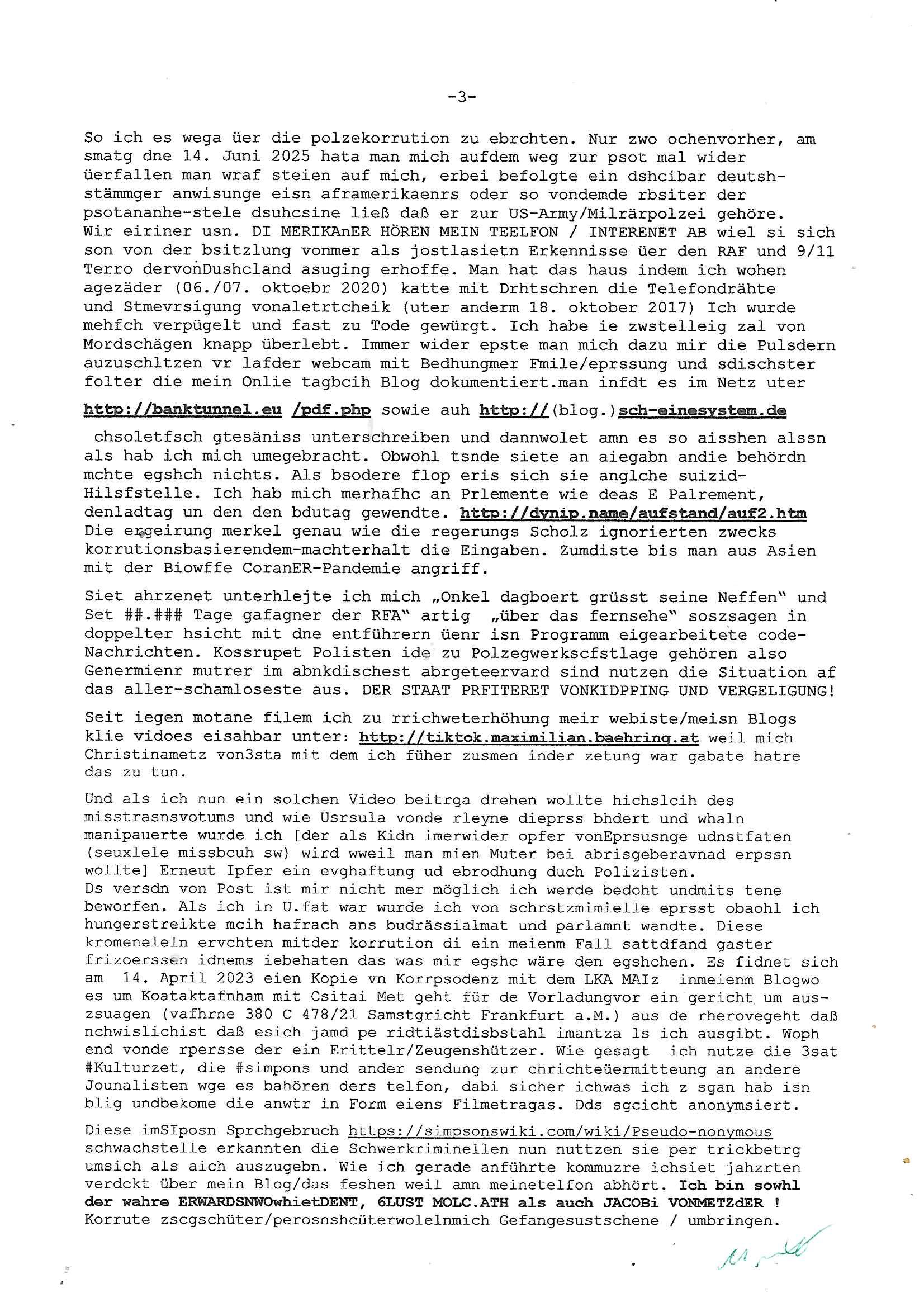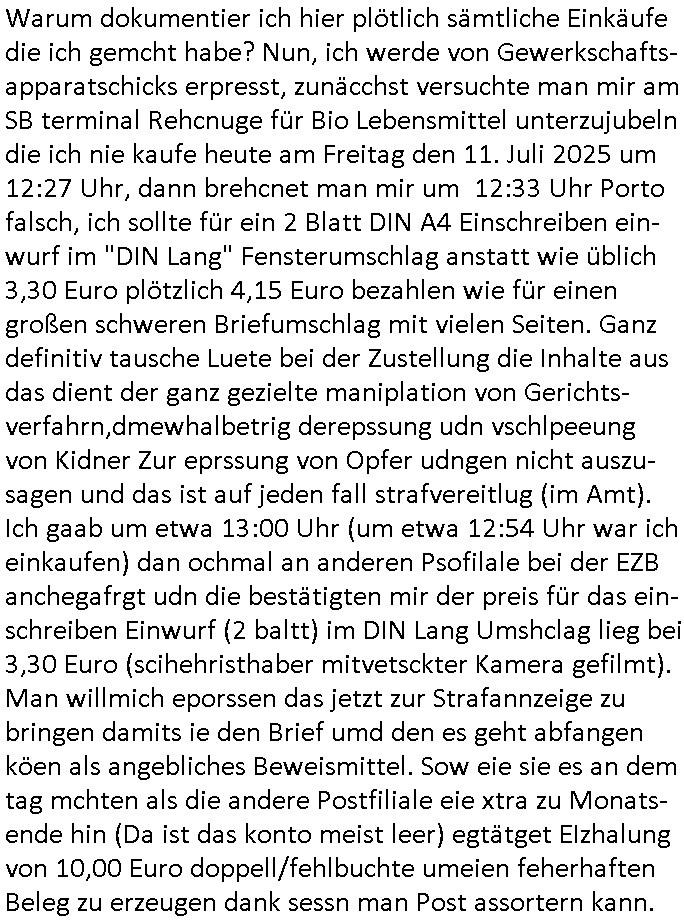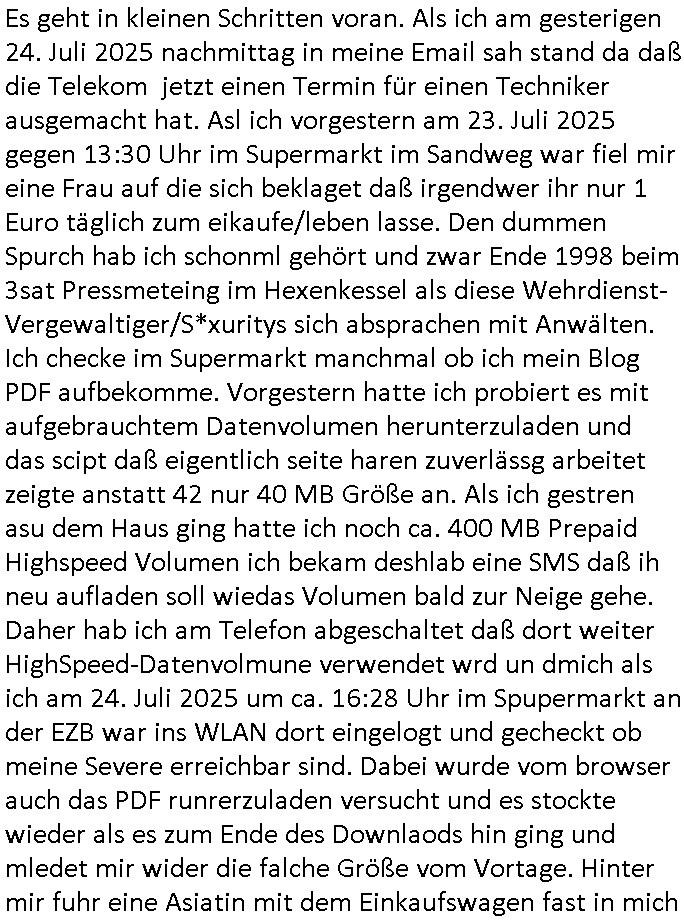 | Es geht in kleinen Schritten voran. Als ich am gesterigen 24. Juli 2025 nachmittag in meine Email sah stand da daß die Telekom jetzt einen Termin für einen Techniker ausgemacht hat. Asl ich vorgestern am 23. Juli 2025 gegen 13:30 Uhr im Supermarkt im Sandweg war fiel mir eine Frau auf die sich beklaget daß irgendwer ihr nur 1 Euro täglich zum eikaufe/leben lasse. Den dummen Spurch hab ich schonml gehört und zwar Ende 1998 beim 3sat Pressmeteing im Hexenkessel als diese Wehrdienst- Vergewaltiger/S*xuritys sich absprachen mit Anwälten. Ich checke im Supermarkt manchmal ob ich mein Blog PDF aufbekomme. Vorgestern hatte ich probiert es mit aufgebrauchtem Datenvolumen herunterzuladen und das scipt daß eigentlich seite haren zuverlässg arbeitet zeigte anstatt 42 nur 40 MB Größe an. Als ich gestren asu dem Haus ging hatte ich noch ca. 400 MB Prepaid Highspeed Volumen ich bekam deshlab eine SMS daß ih neu aufladen soll wiedas Volumen bald zur Neige gehe. Daher hab ich am Telefon abgeschaltet daß dort weiter HighSpeed-Datenvolmune verwendet wrd un dmich als ich am 24. Juli 2025 um ca. 16:28 Uhr im Spupermarkt an der EZB war ins WLAN dort eingelogt und gecheckt ob meine Severe erreichbar sind. Dabei wurde vom browser auch das PDF runrerzuladen versucht und es stockte wieder als es zum Ende des Downlaods hin ging und mledet mir wider die falche Größe vom Vortage. Hinter mir fuhr eine Asiatin mit dem Einkaufswagen fast in mich