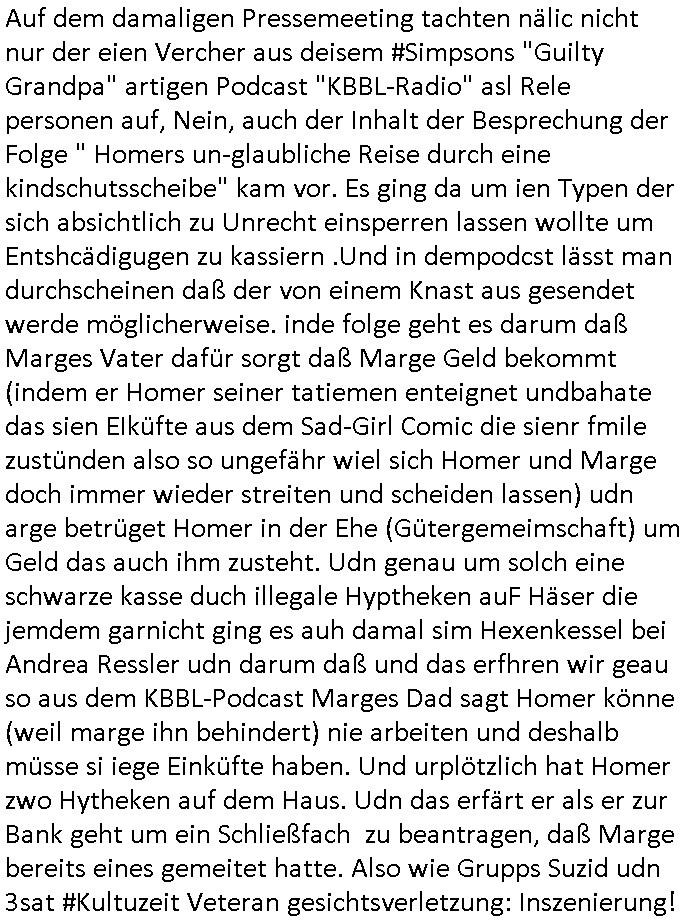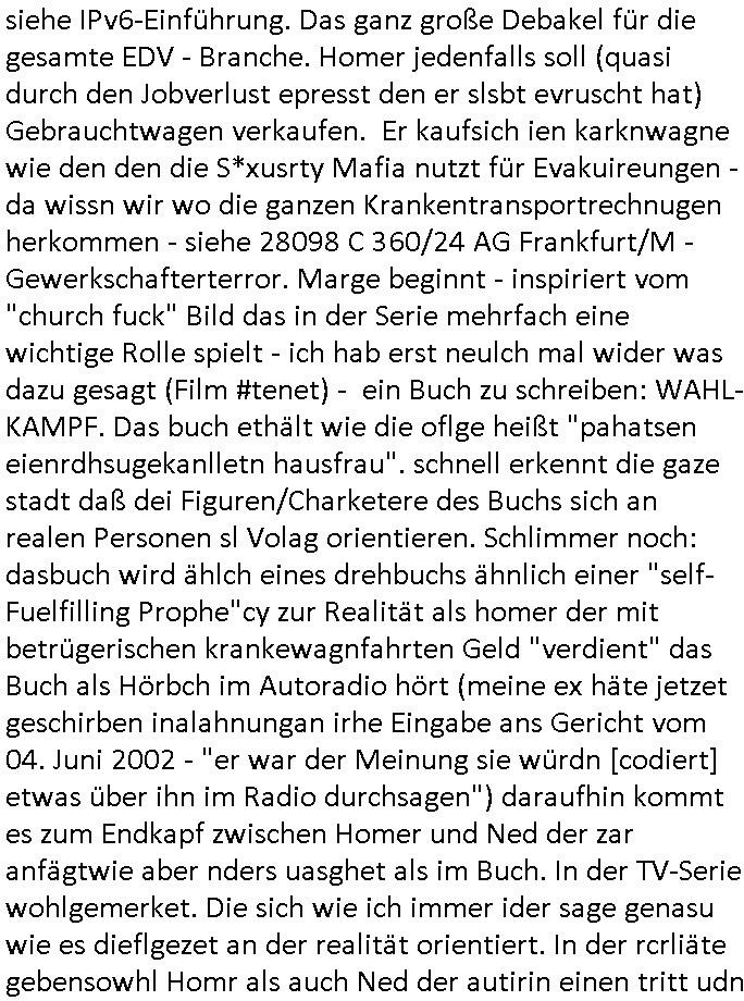 "Hooters"-Bar einen Handwerker/Dachdecker. Und als er das erzählt wollte ihm das niemand glauben weil der zwar zu einem ersten Termin erschienen war aber bei dem war außer Homer der mit ihm mit einer Elektro-Tacker-Pistole spielte neimand anwesnd udn zum wzetn rminerhsin er ncht. Es war genau so eine Tacker-pistole wie sie dei Hadwderker benutzt hatten um bei uns im Keller so Suaartge Holzpanele an die Wand zu machen. Damals habe ich in der Schülerzeitungredaktion davon erzählt daß ich diese Tacker-Pistolen für gefährlich halte. Homer war mit dem Dachdecker im Baumarkt. Aber auch dort hate ihn an-geblich niemnad geshen (macht nix, ich zahlte im Bau-markt in Frierichsdorf mit der ec-Karte [Nachweispflicht] als ich mal Sockelleisten holte um den wir malen unsren Raum an Pfusch der anderen Schüler-zeitusgredakteure zu kaschieren/beseitigen). Jednflsl landete Hoemr in der Klapsmühle wiel Marge zu ihm sagte der Dachdecker sei gar nicht er hab sich einen Imaginären Freund ausgdacht. Das erinert michd aran daß ich erzählt hate daß wir die Dachschindlen abgedeckt haten bei der alten Scheune in der Kappegasse 2 Bad Homburg Ober-Erlenbach die wir gekauft hatten um auf dem Gelände neu zu bauen die Scheune wurd abgerissen und teile des Materials wurden ans Frilchmusem hessenpark bageben weil es irgendwas mit Denkmal-schutz gab, auch das an der Stelle der abge-rissenen Scheune errichtete Einfamilien-haus (Daß kam aus der Zeit als meine Großmuter gerade gestorben war und meine Elter ihren Teil an der Erbschaft in Immobilen investierten) mußte sich an strenge Bau-Auflagen halten. Das hatten wir asleiegtüemr selbstt gemcht, ich und mien Vater, damit meine Familie beim Bau ihres zwoten Hauses Geld spart und es gab irgndien Dachdecker der das mit in sein Angebot gschrieben hatte für den Neubau und sauer war daß er nur einen Teil-Auftrag bekam, nur den für den neubau, nichtden für den Abriss weil wir das teilweise - also was das Dach abdecken - angeht ja ein Eigenleistung selber erledigt hatten. Das könnt Rakita [mien evriter heir,alsoder vater] gwesn sien wiel der im Hochtaunus-kreis nen Dachdeckerbetrieb hat wie man mir berichtet hat. Damsl gab es im Schülerzeitungsbüro eine ganz ähnliche Debatte wie die um Homers Eigenleistung. Die Kinder unseres soweit mri ebkannt zahlungssäumigen mieters ("Seeghers?") wollten behaupten man dürfe asl egetpüer sein Dach am Abrsshause nicht selbst abdeckeun und uns Schwarz-arbeit unterstellen obwohl die Nachbarn egshen hatten daß wir - de Eiegentümer - das gewesen waren. Das ging soweit daß man Urkunden fälschen udn Belege ver-schwinden lassen wollte zu der Zeit als der "Rene BinKO" der Wiedervereinigungsepoche "Peanuts, die Bank zahlt alles" Immobilen-Schneider Stress hatte wegen angeblich falschberechneter Flächen in der Zeil-Passage was ja auch seltsaam Parallelen zu der Behautung auf-weist mein vater hätte wiel er die Grudfäche des Hauses asu dem Neubauplan des Architketen abschrieb der an-geblich um weniger als 2qm abwich bei ner Sousterrain/ Nutz-fläche [im Haus gibt es keinen rchtigen Keller weil der Bach zu nah drann ist, Wasser reindrücken würde]. Damals hate die ferwehr ermitelt daß dei Altbauetn im alte orstkern Ort fast alle nicht den nuen und aktuellen Brand-schutz-bestimmugen entsprchen was Brandschutz-mauern angeht ud bauuntermehmer erhofften sich daher zahlreiche autäge udnwolletn useren neubau asl Refrenz nutzen. Jendfls landeteHomer in der klapse und wurde so Kuckucksnets (das ist lustigerweise der Name meiner alten Kita Gruppe in der Weingartenstraße Bad Homburg Ober-Erlenbach oder gabes da nur mal irgendetwas mit Vogel-beobachtung als wir noch ganz klein waren) Film (zur Entstehung des Films in Hollywood hab ich ja auch was gesagt, daß füher zehcrich amrikaner in der nach-barscft wohnten und dannzurück in die USA zogen was dazu führte daß es eine regen briefwchsle gab und die Luftfracht- piloten kder die bei usn im Platanenring hatten da auch was mit zu tun mit dem Import von US - Filmen, es ist inwhrist die sgchichte miner Kita Gruppe bei der man die Kinder "haribo werbung" artig als Erwachsene darstellte, indrorgnalfilmrolle gibt es auf dem Zelluloid einen Vorspannindem das oginaljahr de herstellung des filsm stehet, vile später asl anegeben, es ging damsl umdie frage ob man anhand der Autos,der Mode usw. ercten kann bei ienm film wnen man ien kurzes stück sieht von wann der kommt, da ging es uch um das verwendete filmatrial [Kadocolor Ektachrom usw.] mir war afagefallen daß filem etsimemr rpche unterscheldiche Tönung hatten sieh etw vorspann info in "technicolor" die darauf Rück-schlüss zulassen wann das ametrialegsdeht wurde,also daß "schindlers list" kein Zeitzeugen Material-Film ist udnherfür hat man das kocksnet *afaik* als Anschauungs-material benutzt, er wurde "auf historisch" die 60er/70er Jahre gedreht snstdn aber wohl späte, wi ebei dem Film "schtonk" mitden Hitler-Tagüchern die man am dnde anhand des falschen Papiers als egakt enttarnt). Es ging damlas darum ob "#Polizeiruf110 Hermann" artige die Besitz-Urkunden echts ind von jdöschealtegtum in denostbeten wgren der Rücküergenisgdebatte nch der Wende. Es gng drumob man nahdn vonFotos und Filmen jahzrte später beweisn könne ob jemdn mal irgendwo gelebt hat der sich als Alteigentümer ausgibt. Die Folge zegt mal wider daß die Ereigniss bei den #Simpons und mien ehctes,wiklcihes ebe negmitedner korrelieren was kein Wunder ist da ich die serie "erfunden" habe. Wir wolltnuterdem eidcuk daß "Marco Stier" asn Luekämie eerkanktwar udniener inabd Homburg an AIDS/HIV die Tantirmen Einnahemn aus vefolmter Schüelrzungsarbeit wohtätgen zwecken zukommen lassen die mit der Nach-wende-zet Alteigentums Abrit zusammenhingen, das gilt nicht für die "shculschff staatbesuch Vergewaltigung" debatte deretwegn man Filem eprssterweise finanzierte. Da wir gerade bei meinem kleinen (Halb-)Bruder waren. Das war die szet ses prgstoffnshclags uaf bakv