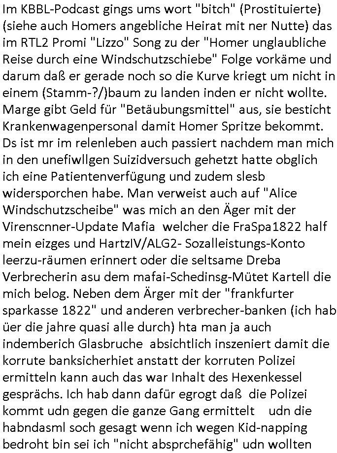 | Der Quartalsbackups und -downloads wegen habe ich gestren den ersten Teil der #Simpson aus dem 18:00 Uhr TV-Vorabendprgramm vom Dienstag, den 01. Juli 2025 verpasst und nur so halb das Ende geshen von Teil zwo. Marge musste werbung für eines dieser Fitness - Bikes machen mit dem der Sportleher C***kovic (Coach Krupt) Knastinsassen zwangsbeglücken wollte als Lohn für ihre (Anders Behring Bereivik Haftbedingugs Show) SQUID- Game Qudtstftung BMW Holocaust Entshädigungs fonds Zwangsarbeits-Rache. (Hier regiern die fremdstämmgien wiel deutsche Nazis und damit demokratienfähg sind !) Es gab nen Gerichtsprozess mit der irren "KatZen-LADY" und Homer wurde an der (hier allerdings china-)Mauer von fast zu Tode gewürgt (siehe Prozess Ostend-Würger "Piotr Michalek" den Untermieter der Polin "Katja Zajac" die früher imaprrtemnt unterhalb des meien wohnte, etwa Mai 2017 fidnet sich dazu so einiges in den Blogs, (mein Freisptuch wegen Notwehr) besonders vieles im "wuergerjagd" blog das aufgdun von technsichen um-stellugen ab kurz vor Prozessende im "sch-einesystem" Hauptblog wietgrfüt wurde (siehe " http://blogna.me "). Dann #berlinNueKölln02407 / #berlinTagUndNacht wo Joe sich mit Mieke beriet, er braucht Indiras Aussage. Es gab Zoff auf dem Hausboot wiel Piet immer so Mädels mit anschleift. Udnd anns ah man Mike mit srah am Fluß, sie suchten die Stelle wo Mila und Mikes Lust - Schloß aufgehangen worden war und fanden es, kaputt wie die