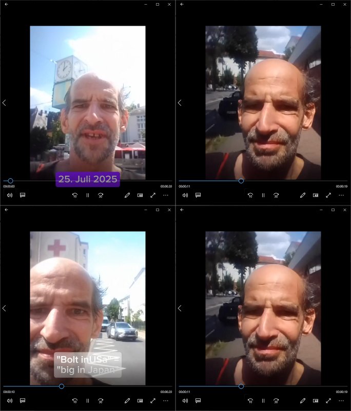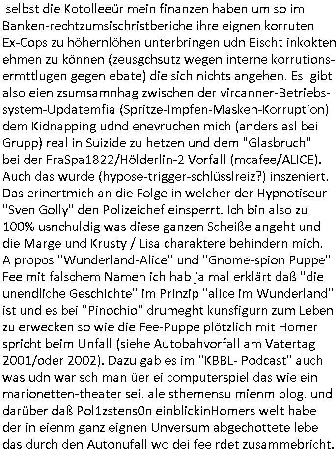 | Im Oktober 2025 endet ja der Support für Windows 10 weshalb ich gerade mit nem temporären Versuchs-Setup ausprobiere was alles angepasst werden muß. Es liget nie an mir, mein Kram läuft sicher und stabil, es sind imemr die Betreibssystem oder Programme von Drittanbietern die herumzicken. Ich bin echt sauer (ud wza schon siet jahr-ezehten) daß man alle paar Wochen Störugen durch sowas hat. Da ich den Vormittag also mit Tests verbracht habe erst jetzt wie auch sonst immer eigen Worte zum allwerk-täglichen 18:00 Uhr TV Vorbandporgramm, dies-mal vom Montag, den 28. Juli 2025: Bei den Simpsons kam die Folge mit den Asien Adoptionen die mich an das Thema Kinder- und Menschenhandel erinnet anläßlichd er prostituierten di eman au asien eishclsuet al abglche zeuginnen der "Staatsbescuh Vergewaltigung" Bangkok. In Teil zwo hatt Bart ein Art Ablaufplan/Drehbuch für das was Homer geschah, er wurde vom elektrischen Garagen-tor eigeklemmt genau wie bart das in einem versiegelten Umschalg aufsgchicben vohergsgat hatte. Erinet mich an eins hcüertugsmeeting zur zet de wiedervereinuigung in der humbdoslctshucle bad homburg. Marge warf Homer raus und der kaufte sich ein Wohnmobil mit welchem die Kinder eine uerlaubte Spritztour machten um es zurück-zugeben beim Händler dens ei wollten nicht daß Homer auszieht. Dann #erbliNuekölln02407/#berliNtagUndNcht wo Milla eigentlich mit Mike nach Vendig wollte aber die Beziehungskrise ist zu tief. Mila scuht mit Mike
