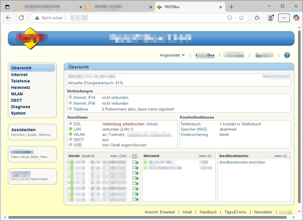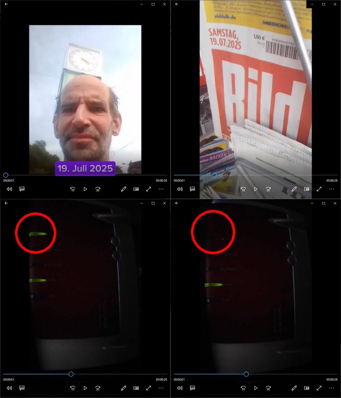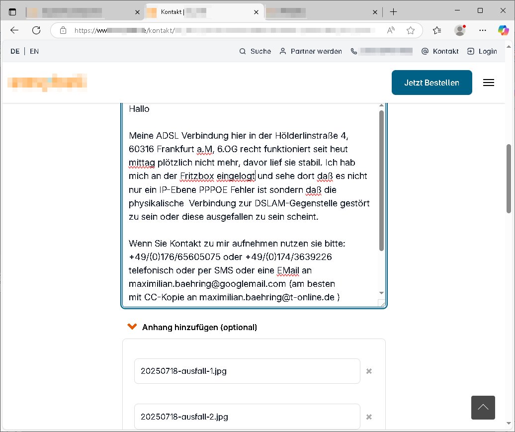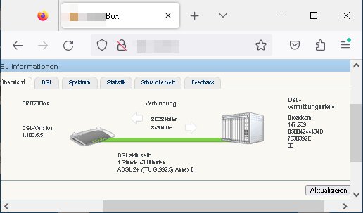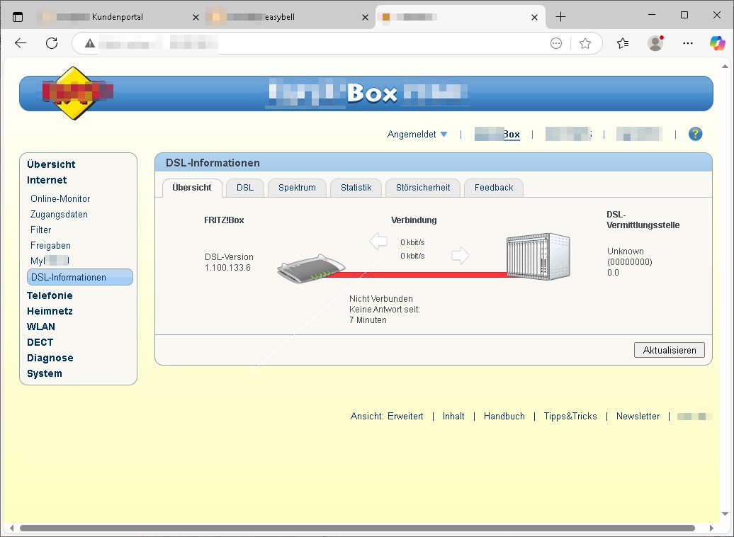 | Wie man sieht ist das DSL/ATM, das Festnetz, wieder da. Nachdem man mit einen "vor Ort" Technikertermin für heute morgen Samstag, den 26. Juli 2025 ca. 08:00 Uhr bsi 12:00 Uhr gegeben hatte wartete ich gespannt daß es klingelt aber anstattdessen erhielt ich ca. 10:35 Uhr eienanruf ich solle mal nachschauee, die Leitung müsse wieder funktionieren und tatsächlich, sie synchronisierte sich mit ca. 13.250 kBit/s down- zu 800 kbit/s up-stream. Ich hatte den Router währn der Diagnose - Phase direkt anstatt wie ansonsten üer ein Verlängerungskabel an der TAE-Dose angeschlossen um potentielle Fehlerquellen zu eliminierien. Es funkionierte auch mit direkten Anshcluß an der Dose nicht von gestern bis zur Störungsbehebung heute vormittag. Als ich den DSL-Router dann nochmals ausstöpselte und zurück ins Wohnzimmer trug syncte er nur mit ca 8.000 kBit/s down- und 800 kbit/s up-stream. Das Verlängerungskable war ja nicht die Störungsursache und bisher hatte es auch keine Geschwindigkeitseibußen damit gegeben, vor detr STörung syncte die Leitung stets mit 12.000 kBit/s down- und 1024 kbit/s up-stream. Ich hatt sogarml während der letzten Störung ein 25m Kabel direkt in den Keller zumduchs treppenaus liegen und auch das änderte an den 12.000 kBit/s down- und 1024 kbit/s up-stream nichts, an der hausinternen Verklabung oder auch Verlängerungskabekn an Routern liegt es also nie.