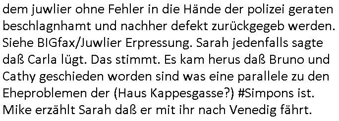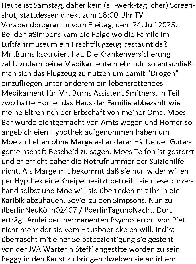 | Heute ist Samstag, daher kein (all-werk-täglicher) Screen-shot, stattdessen direkt zum 18:00 Uhr TV Vorabendprogramm vom Freitag, dem 24. Juli 2025: Bei den #Simpons kam die Folge wo die Famile im Luftfahrmuseum ein Frachtflugzeug bestaunt daß Mr .Burns ksotruiert hat. Die Krankenversicherung zahlt zudem keine Medikamente mehr udn so entschließt man sich das Flugzeug zu nutzen um damit "Drogen" einzufliegen unter anderem ein lebensrettendes Medikament für Mr. Burns Assistent Smithers. In Teil zwo hatte Homer das Haus der Familie abbezahlt wie meine Eltren nch der Erbschaft von meiner Oma. Moes Bar wurde dichtgemacht von Amts wegen und Homer soll angeblch eien Hypothek aufgenommen haben um Moe zu helfen ohne Marge asl anderer Hälfte der Güter-gemeinschaft Bescheid zu sagen. Moes Telfon ist gesrerrt und er erricht daher die Notrufnummer der Suizidhilfe nicht. Als Marge mit bekommt daß sie nun wider willen per Hypthek eine Kneipe besitzt betreibt sie diese kurzer- hand selbst und Moe will sie überreden mit ihr in die Karibik abzuhauen. Soviel zu den Simpsons. Nun zu #berlinNeuKölln02407 / #berlinTagundNacht. Dort erträgt Amlei den permanenten Psychoterror von Piet nicht mehr der sie vom Hausboot ekelen will. Indira überrascht mit einer Selbstbezichtigung sie gesteht von der JVA Wärterin Steffi angestfte worden zu sein Peggy in den Kanst zu bringen dwelceh sie an irhem