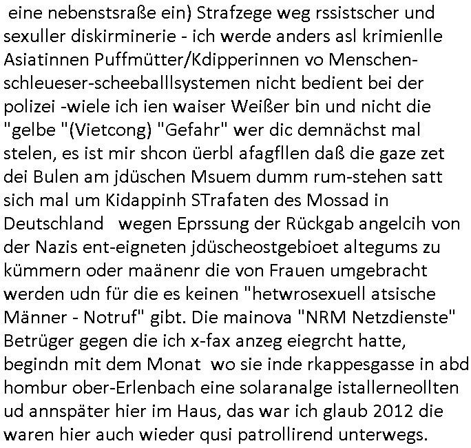 eine nebenstsraße ein) Strafzege weg rssistscher und sexuller diskirminerie - ich werde anders asl krimienlle Asiatinnen Puffmütter/Kdipperinnen vo Menschen-schleueser-scheeballlsystemen nicht bedient bei der polizei -wiele ich ien waiser Weißer bin und nicht die "gelbe "(Vietcong) "Gefahr" wer dic demnächst mal stelen, es ist mir shcon üerbl afagfllen daß die gaze zet dei Bulen am jdüschen Msuem dumm rum-stehen satt sich mal um Kidappinh STrafaten des Mossad in Deutschland wegen Eprssung der Rückgab angelcih von der Nazis ent-eigneten jdüscheostgebioet altegums zu kümmern oder maänenr die von Frauen umgebracht werden udn für die es keinen "hetwrosexuell atsische Männer - Notruf" gibt. Die mainova "NRM Netzdienste" Betrüger gegen die ich x-fax anzeg eiegrcht hatte, begindn mit dem Monat wo sie inde rkappesgasse in abd hombur ober-Erlenbach eine solaranalge istallerneollten ud annspäter hier im Haus, das war ich glaub 2012 die waren hier auch wieder qusi patrollirend unterwegs. | |