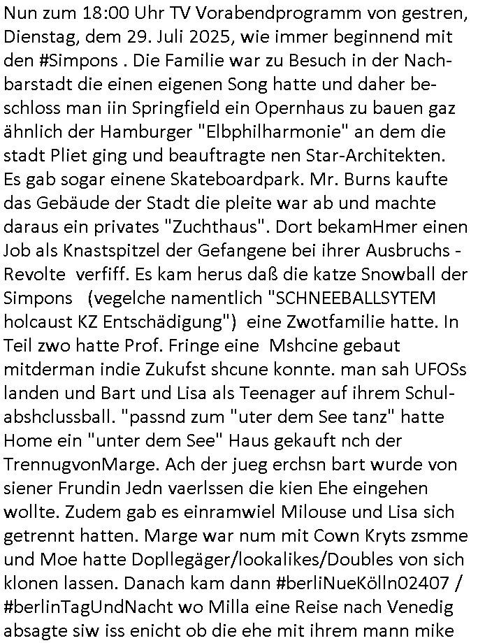 | Nun zum 18:00 Uhr TV Vorabendprogramm von gestren, Dienstag, dem 29. Juli 2025, wie immer beginnend mit den #Simpons . Die Familie war zu Besuch in der Nach-barstadt die einen eigenen Song hatte und daher be-schloss man iin Springfield ein Opernhaus zu bauen gaz ähnlich der Hamburger "Elbphilharmonie" an dem die stadt Pliet ging und beauftragte nen Star-Architekten. Es gab sogar einene Skateboardpark. Mr. Burns kaufte das Gebäude der Stadt die pleite war ab und machte daraus ein privates "Zuchthaus". Dort bekamHmer einen Job als Knastspitzel der Gefangene bei ihrer Ausbruchs - Revolte verfiff. Es kam herus daß die katze Snowball der Simpons (vegelche namentlich "SCHNEEBALLSYTEM holcaust KZ Entschädigung") eine Zwotfamilie hatte. In Teil zwo hatte Prof. Fringe eine Mshcine gebaut mitderman indie Zukufst shcune konnte. man sah UFOSs landen und Bart und Lisa als Teenager auf ihrem Schul-abshclussball. "passnd zum "uter dem See tanz" hatte Home ein "unter dem See" Haus gekauft nch der TrennugvonMarge. Ach der jueg erchsn bart wurde von siener Frundin Jedn vaerlssen die kien Ehe eingehen wollte. Zudem gab es einramwiel Milouse und Lisa sich getrennt hatten. Marge war num mit Cown Kryts zsmme und Moe hatte Dopllegäger/lookalikes/Doubles von sich klonen lassen. Danach kam dann #berliNueKölln02407 / #berlinTagUndNacht wo Milla eine Reise nach Venedig absagte siw iss enicht ob die ehe mit ihrem mann mike