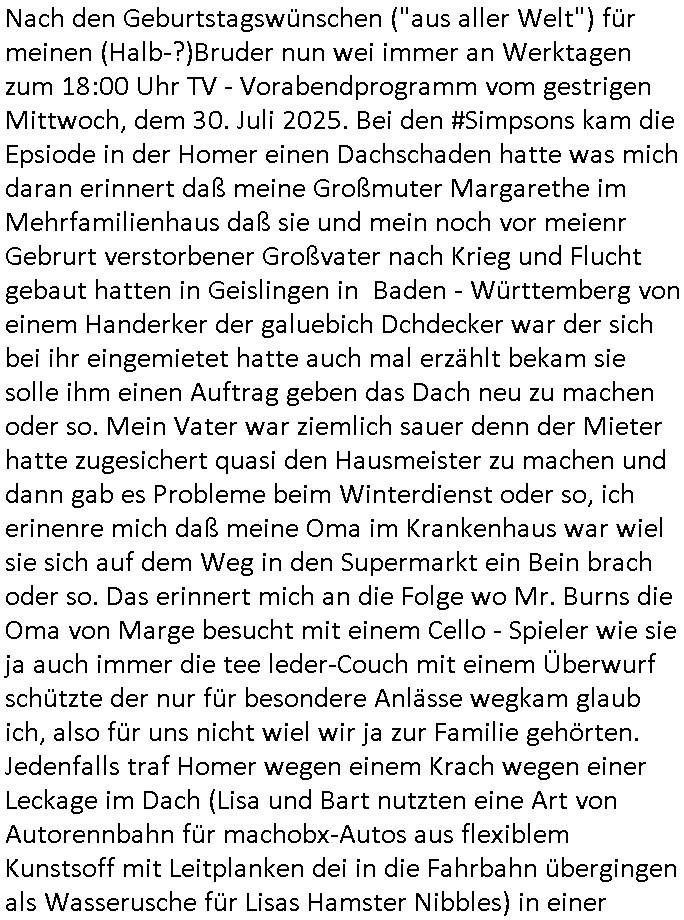 | Nach den Geburtstagswünschen ("aus aller Welt") für meinen (Halb-?)Bruder nun wei immer an Werktagen zum 18:00 Uhr TV - Vorabendprogramm vom gestrigen Mittwoch, dem 30. Juli 2025. Bei den #Simpsons kam die Epsiode in der Homer einen Dachschaden hatte was mich daran erinnert daß meine Großmuter Margarethe im Mehrfamilienhaus daß sie und mein noch vor meienr Gebrurt verstorbener Großvater nach Krieg und Flucht gebaut hatten in Geislingen in Baden - Württemberg von einem Handerker der galuebich Dchdecker war der sich bei ihr eingemietet hatte auch mal erzählt bekam sie solle ihm einen Auftrag geben das Dach neu zu machen oder so. Mein Vater war ziemlich sauer denn der Mieter hatte zugesichert quasi den Hausmeister zu machen und dann gab es Probleme beim Winterdienst oder so, ich erinenre mich daß meine Oma im Krankenhaus war wiel sie sich auf dem Weg in den Supermarkt ein Bein brach oder so. Das erinnert mich an die Folge wo Mr. Burns die Oma von Marge besucht mit einem Cello - Spieler wie sie ja auch immer die tee leder-Couch mit einem Überwurf schützte der nur für besondere Anlässe wegkam glaub ich, also für uns nicht wiel wir ja zur Familie gehörten. Jedenfalls traf Homer wegen einem Krach wegen einer Leckage im Dach (Lisa und Bart nutzten eine Art von Autorennbahn für machobx-Autos aus flexiblem Kunstsoff mit Leitplanken dei in die Fahrbahn übergingen als Wasserusche für Lisas Hamster Nibbles) in einer