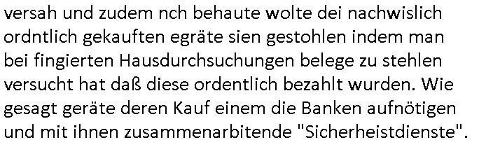 versah und zudem nch behaute wolte dei nachwislich ordntlich gekauften egräte sien gestohlen indem man bei fingierten Hausdurchsuchungen belege zu stehlen versucht hat daß diese ordentlich bezahlt wurden. Wie gesagt geräte deren Kauf einem die Banken aufnötigen und mit ihnen zusammenarbitende "Sicherheistdienste". | |